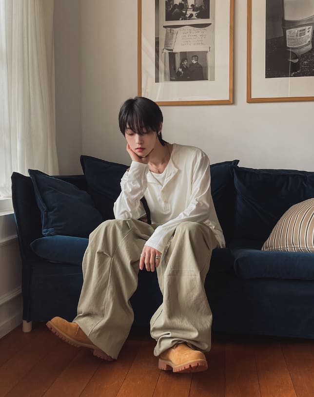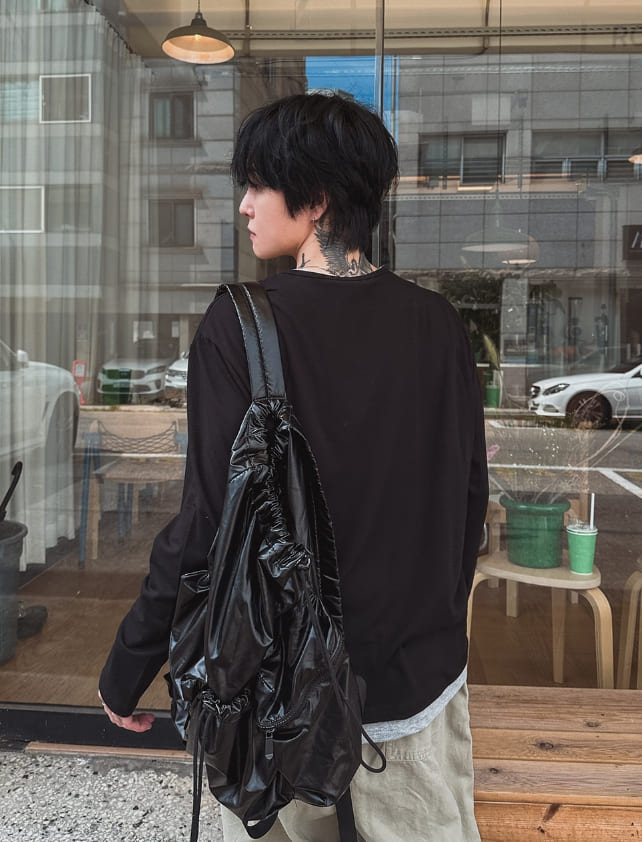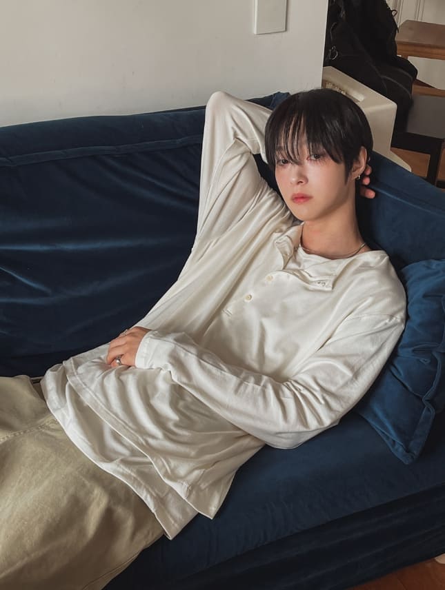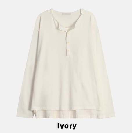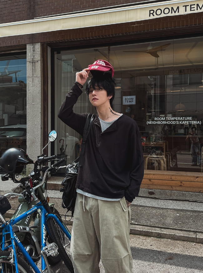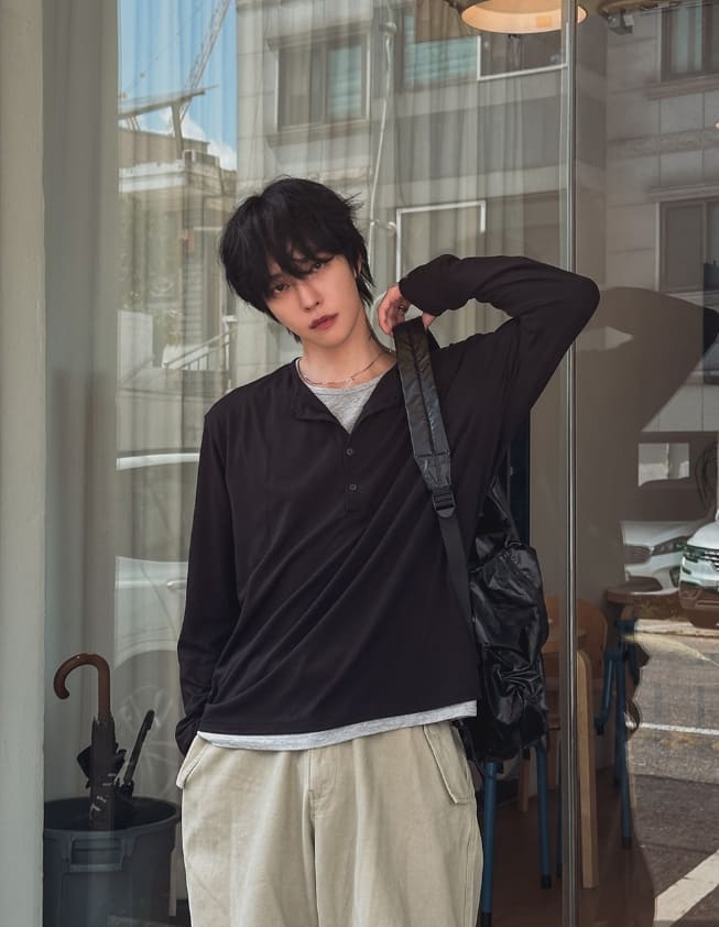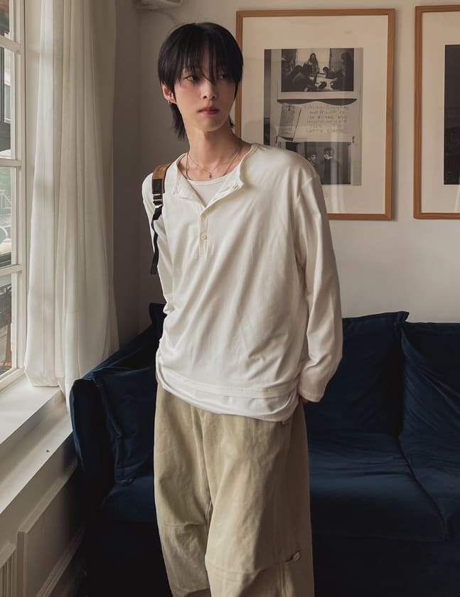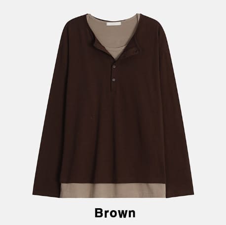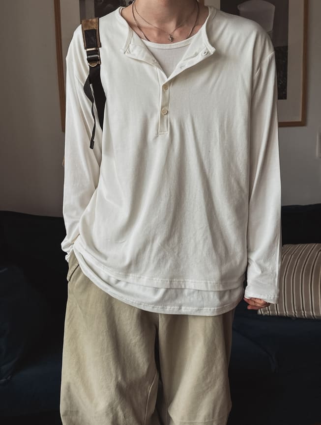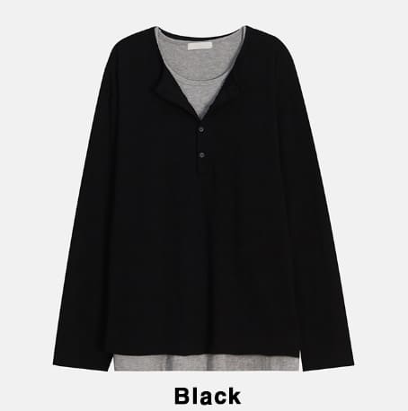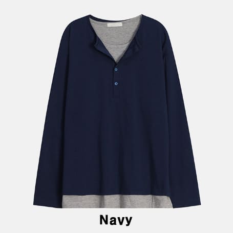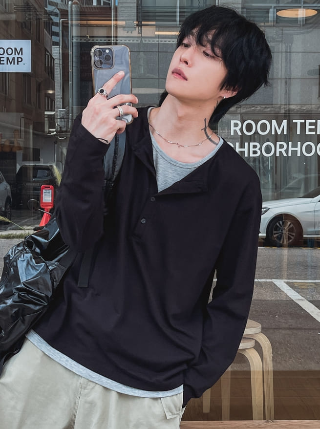トップツートーンレイヤードヘンリーネック長袖Tシャツ