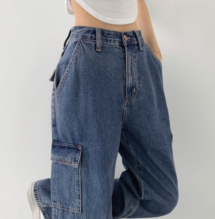 アメリカンカジュアルカーゴポケットクラシックロングワイドデニムパンツ