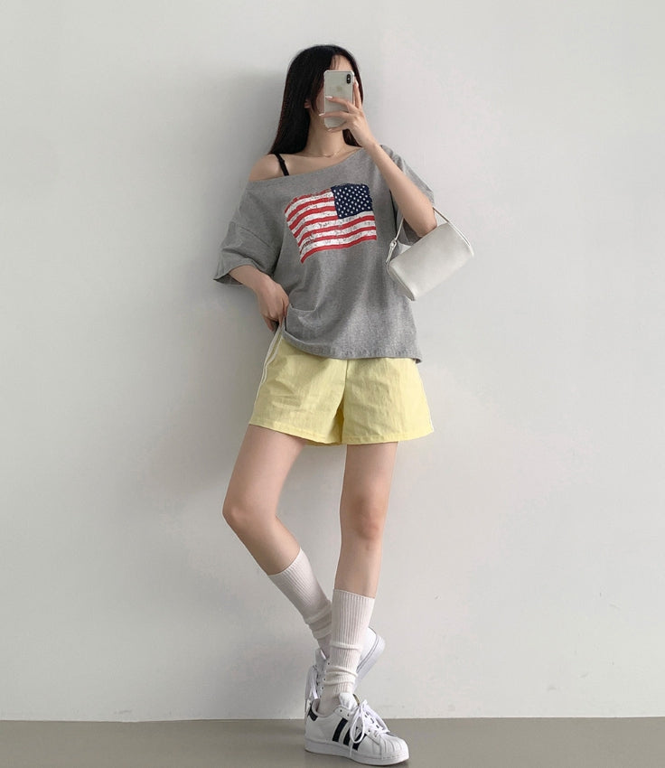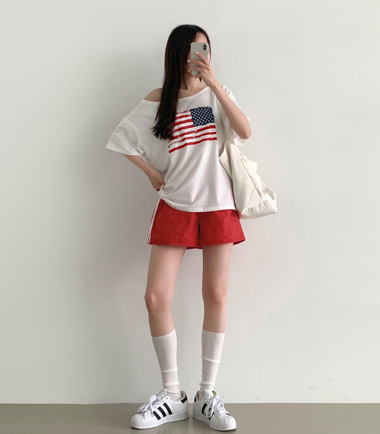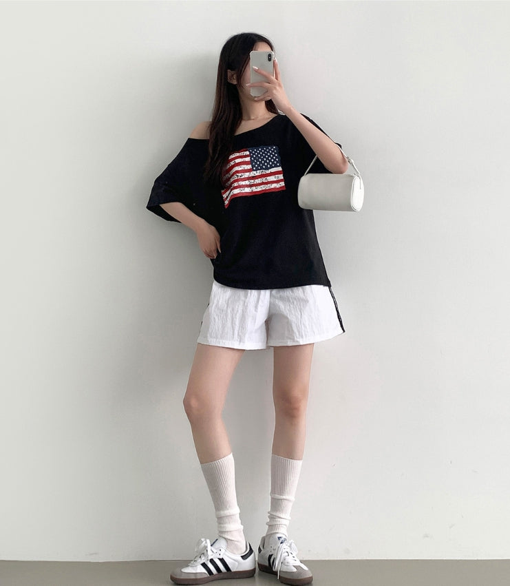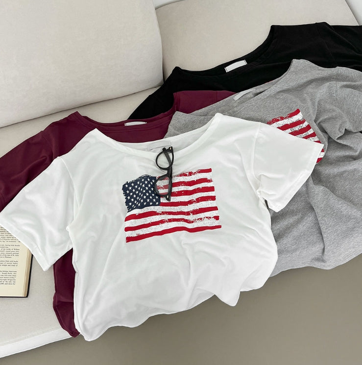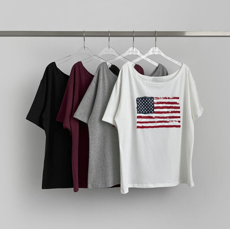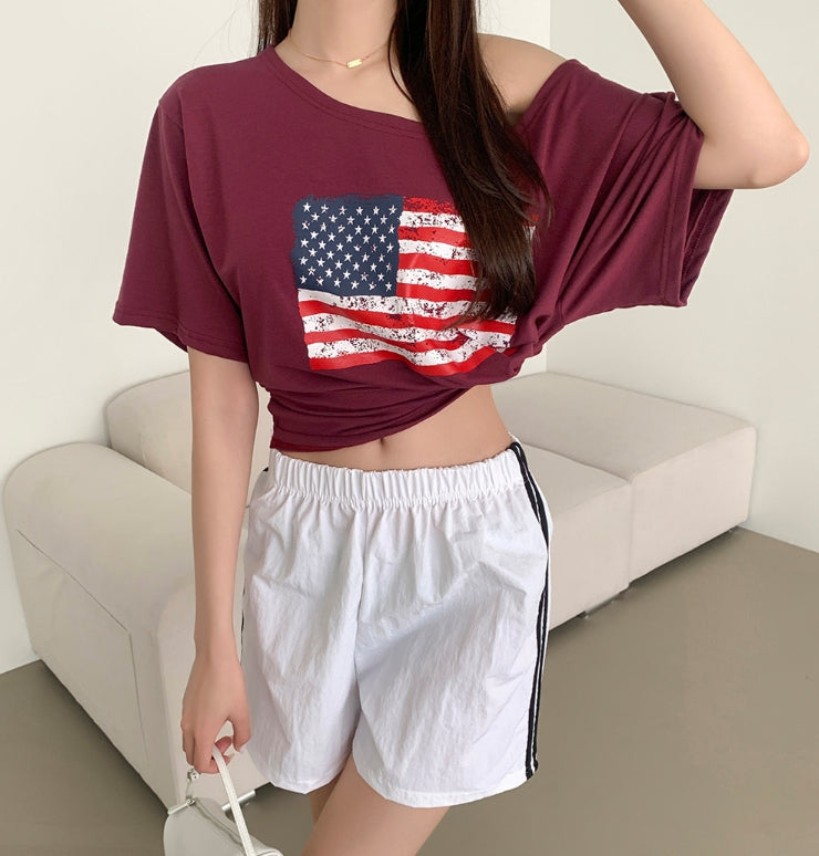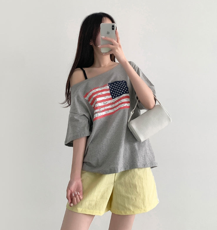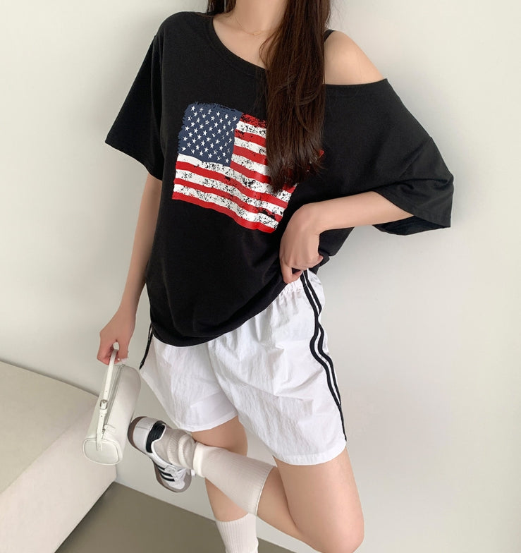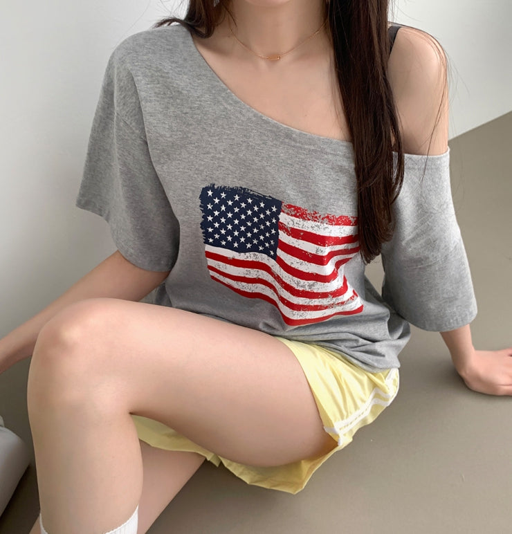 American Flag Loose Fit One Off Shoulder Short Sleeve T-shirt