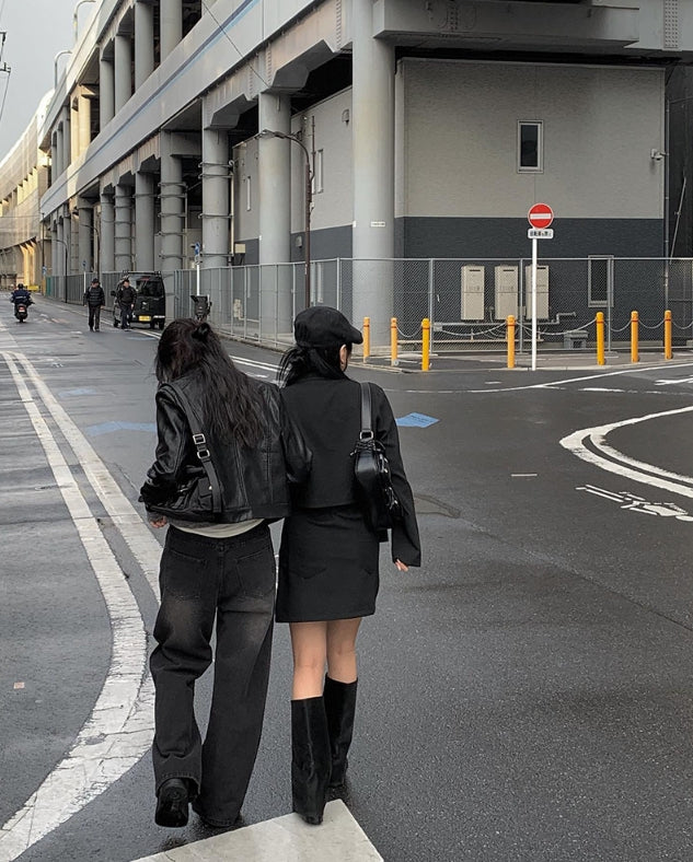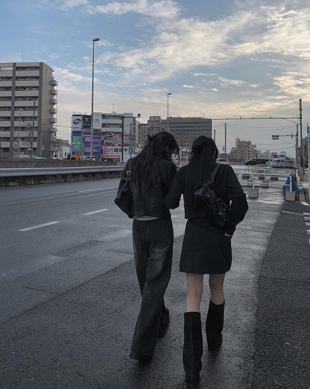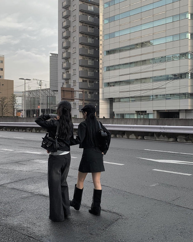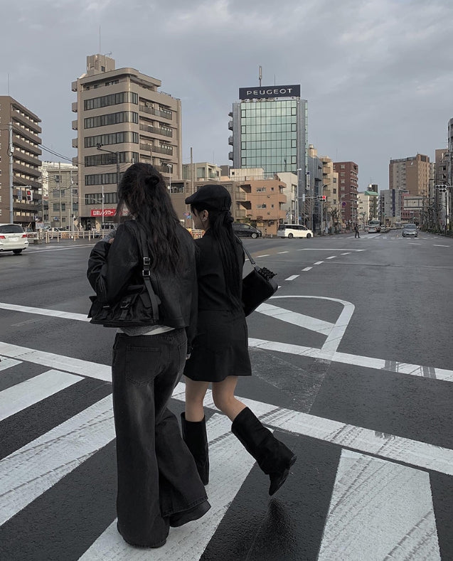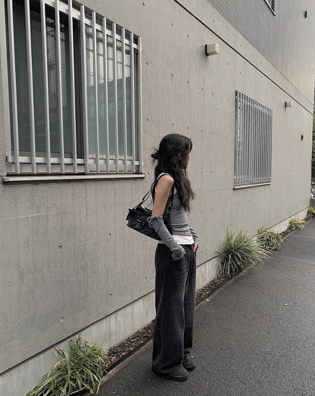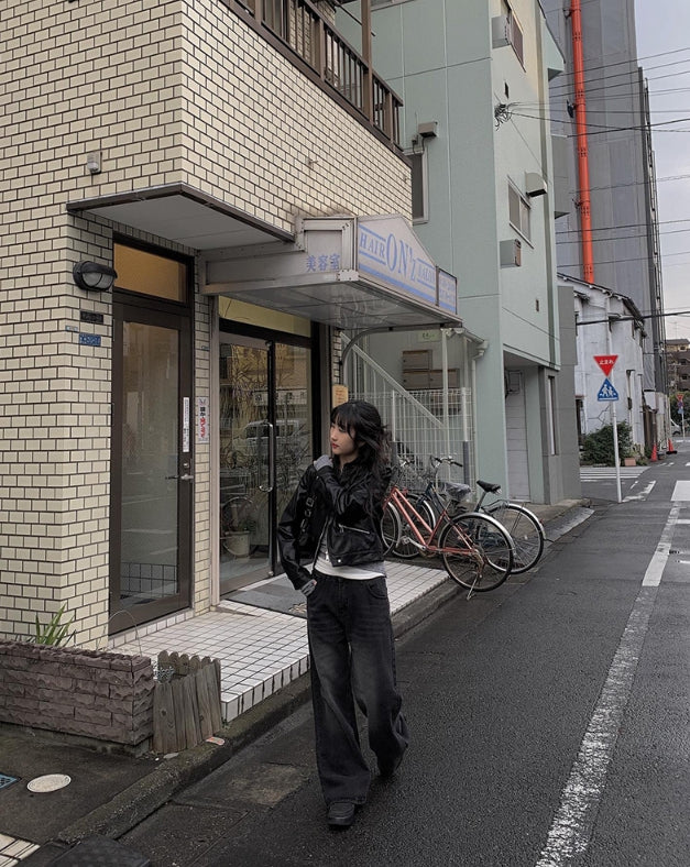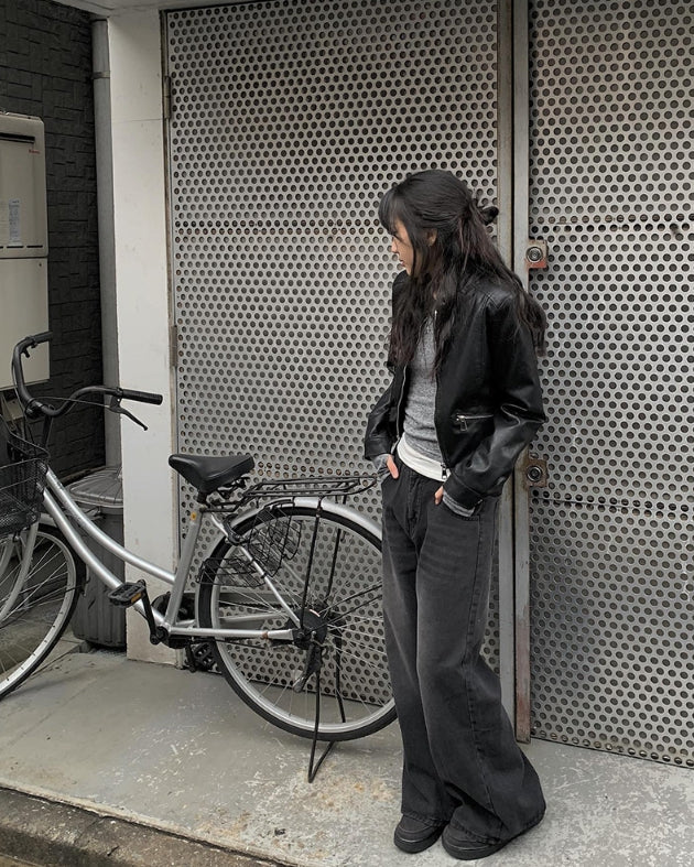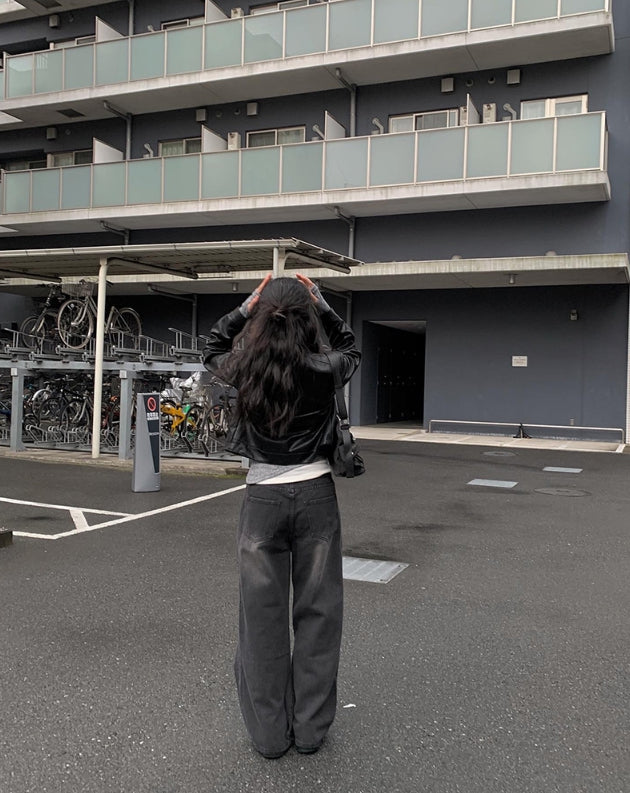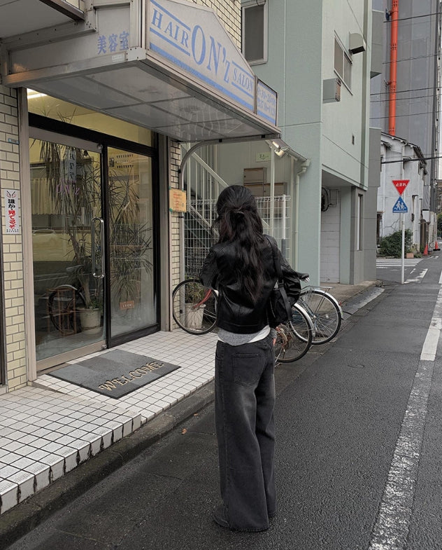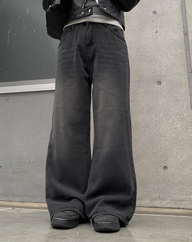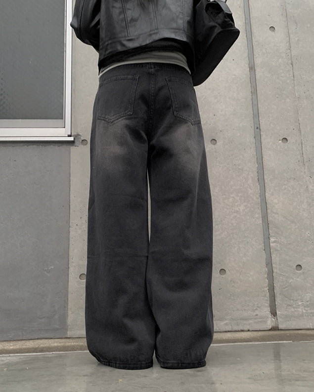 カーマブラックデニムウォッシュ加工ワイドパンツ