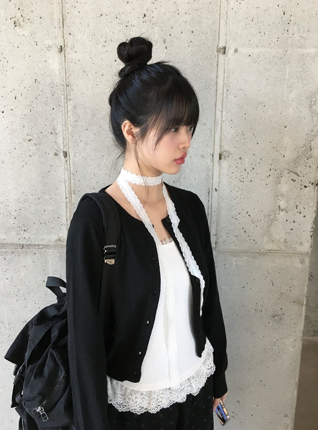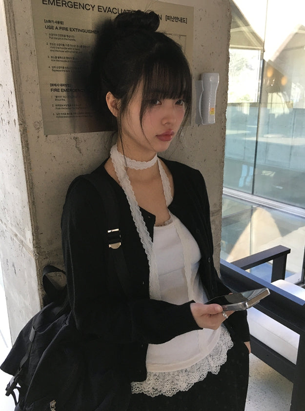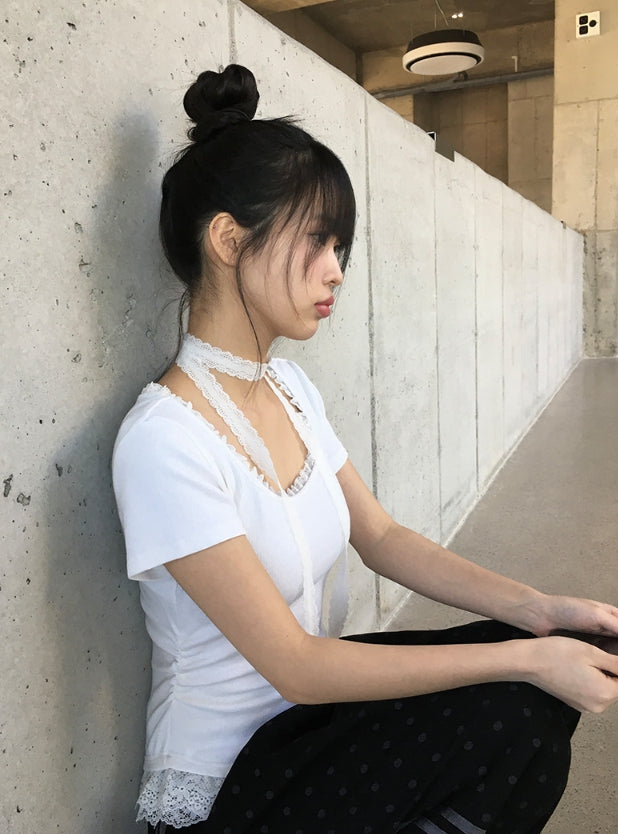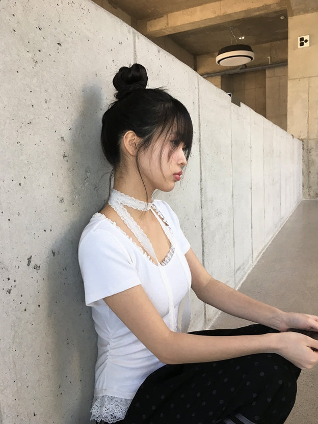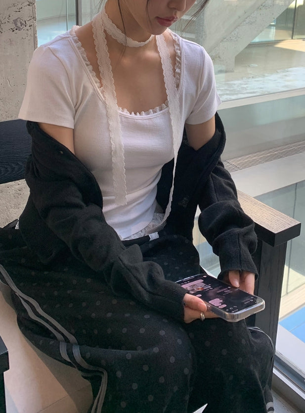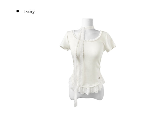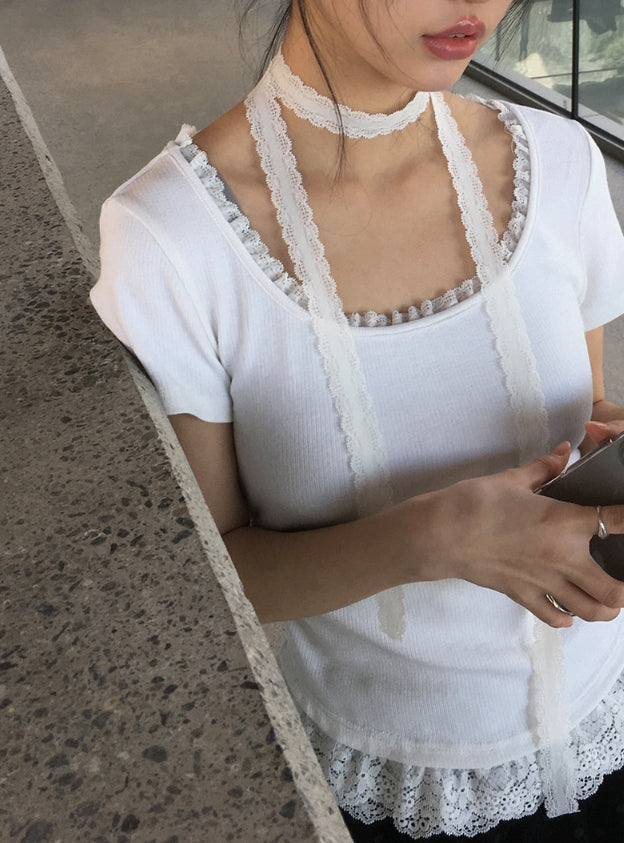 Beren Frill Lace Short Sleeve T-Shirt Scarf Set