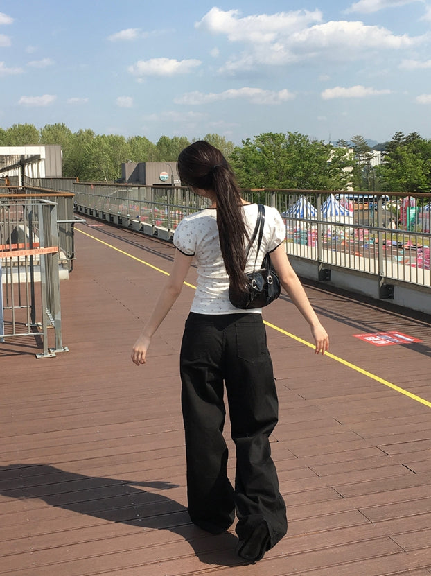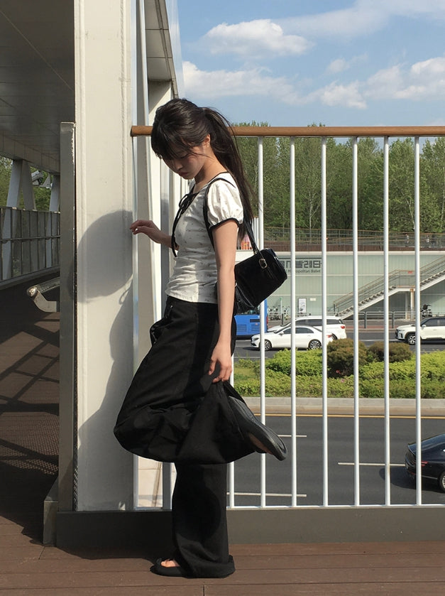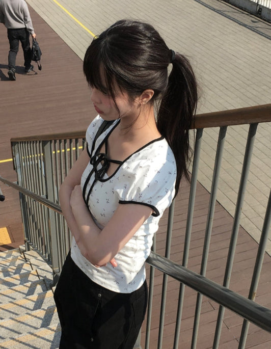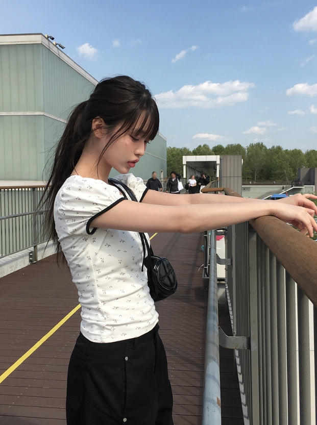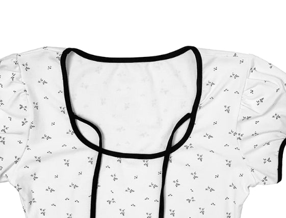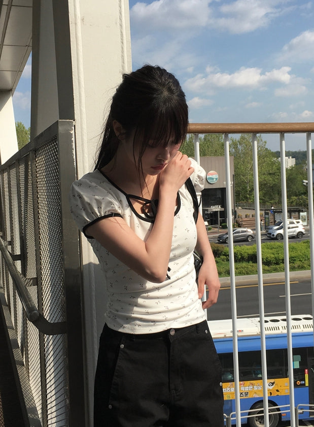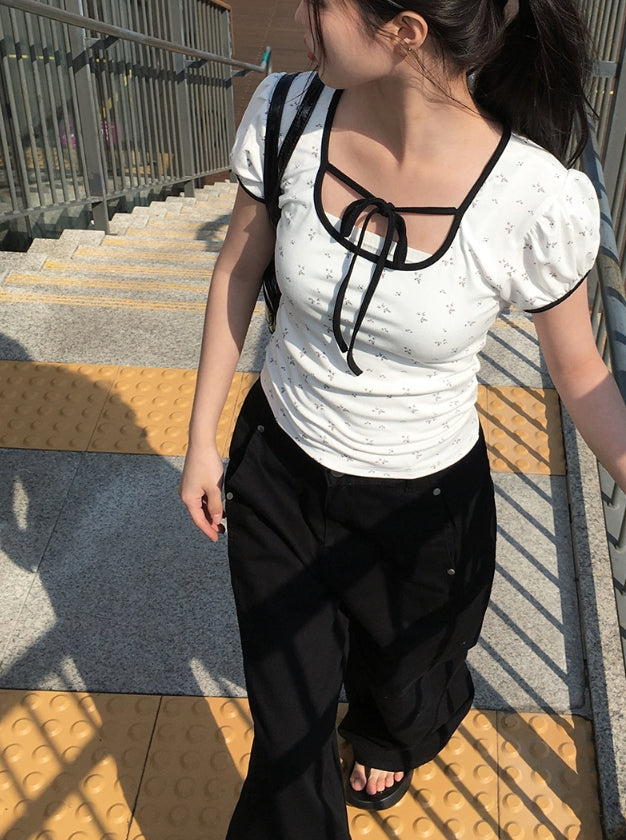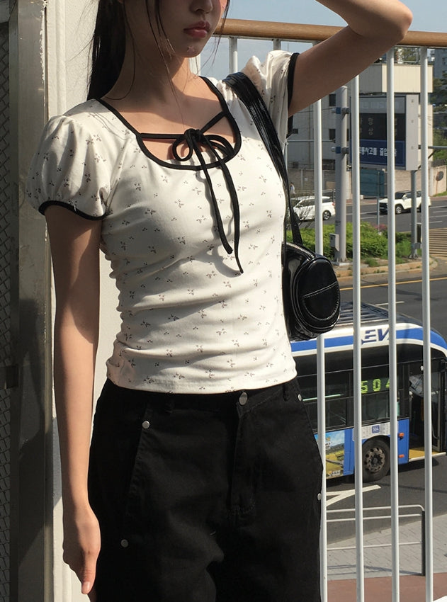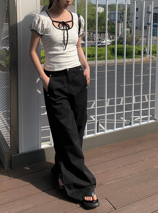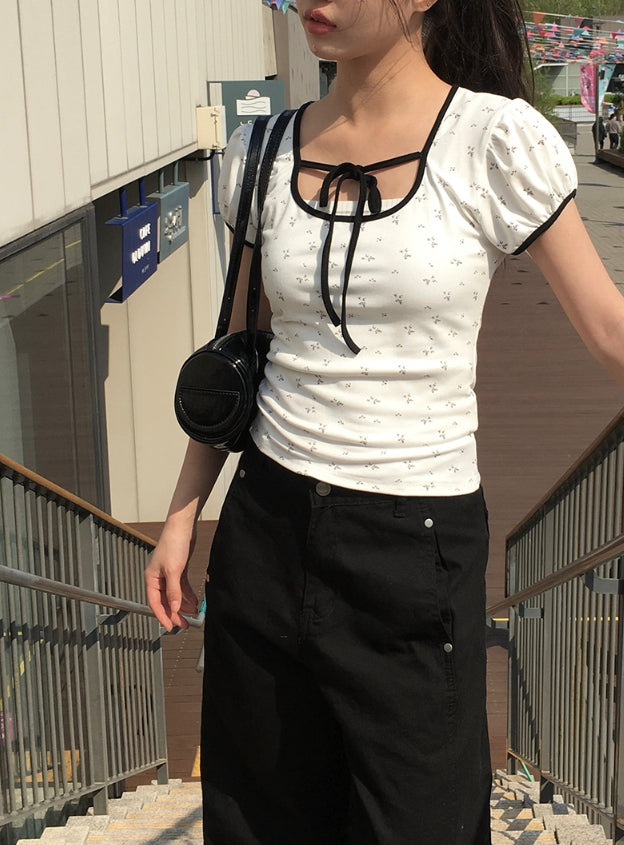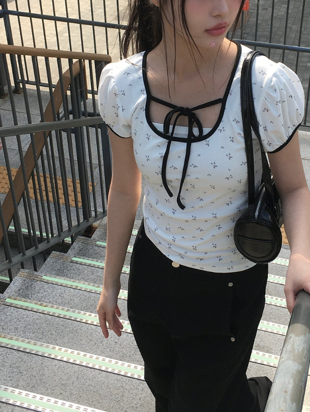 Demin Flower Ribbon Puff Short Sleeve T-Shirt