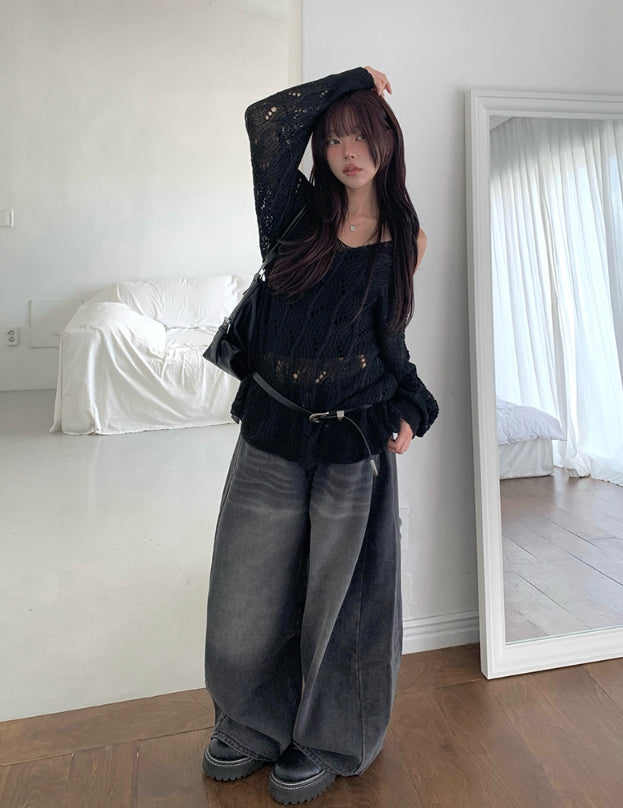 リンダーメッシュシースルールーズフィットワンショルダーニット