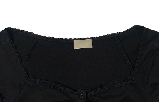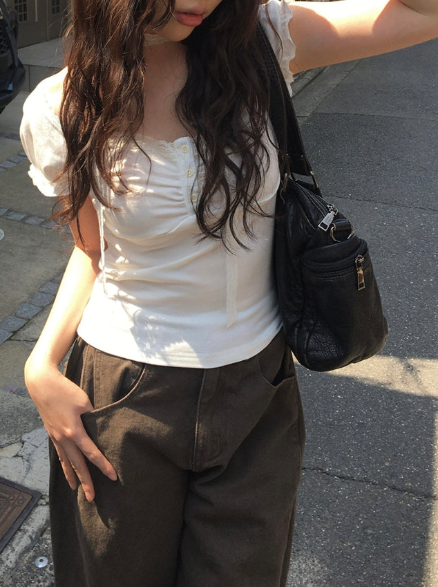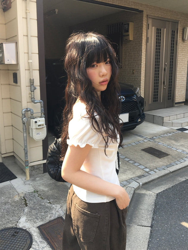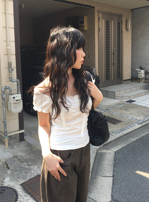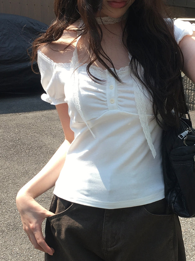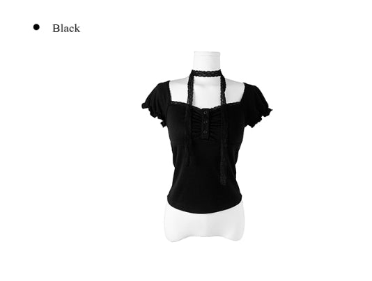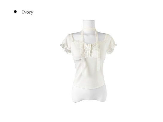 [Scarf set] Junku Lace Shirring Short Sleeve T-Shirt Set