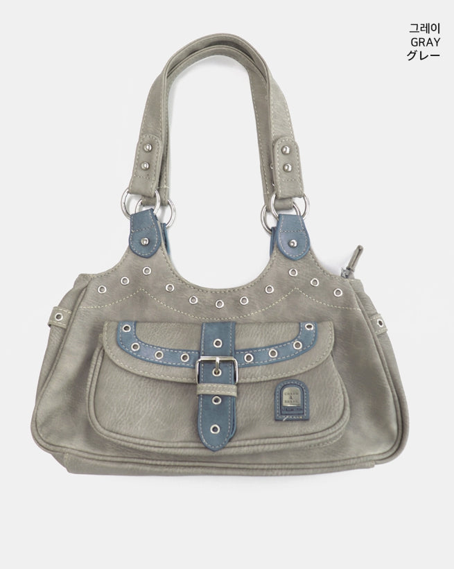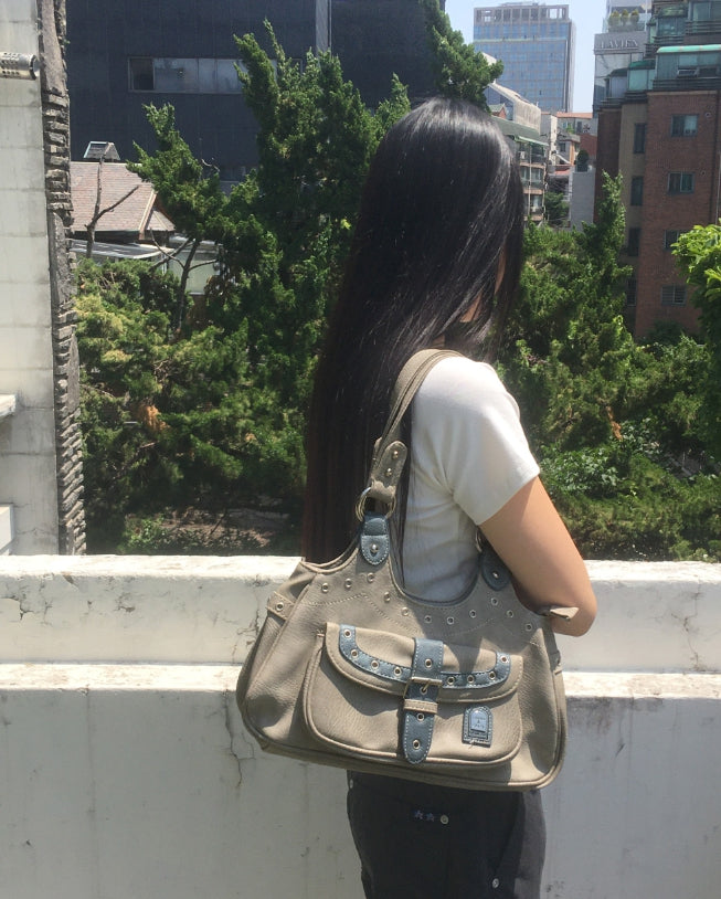 チャッパーリベットバックルベルトレザーショルダーバッグ