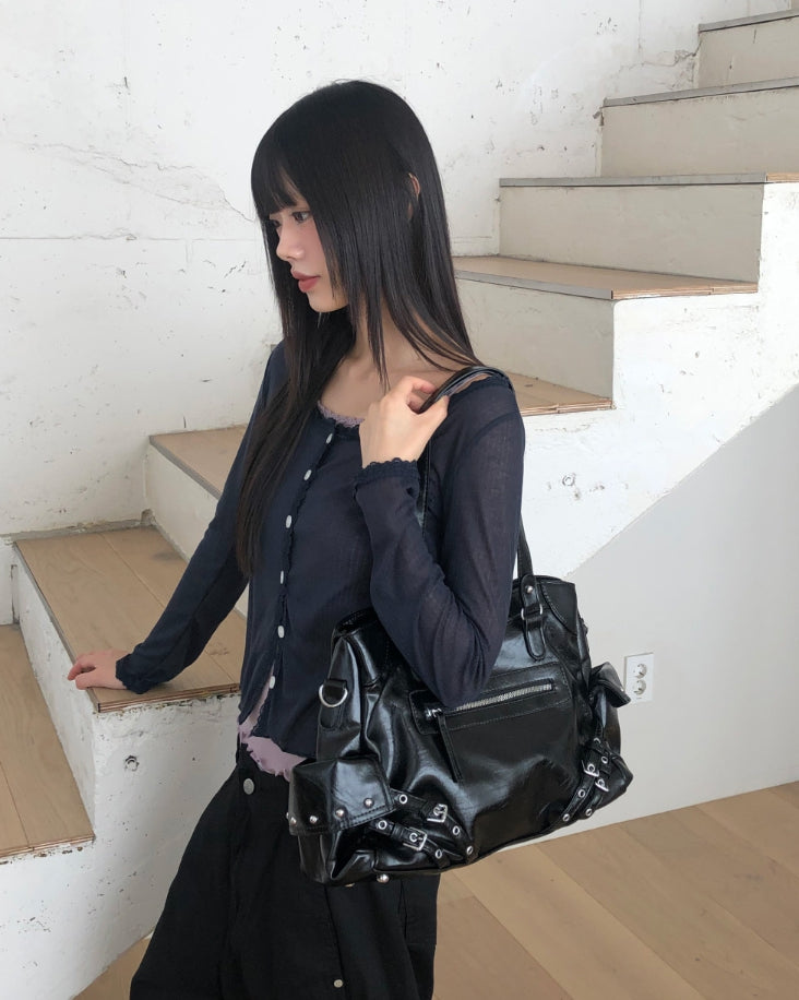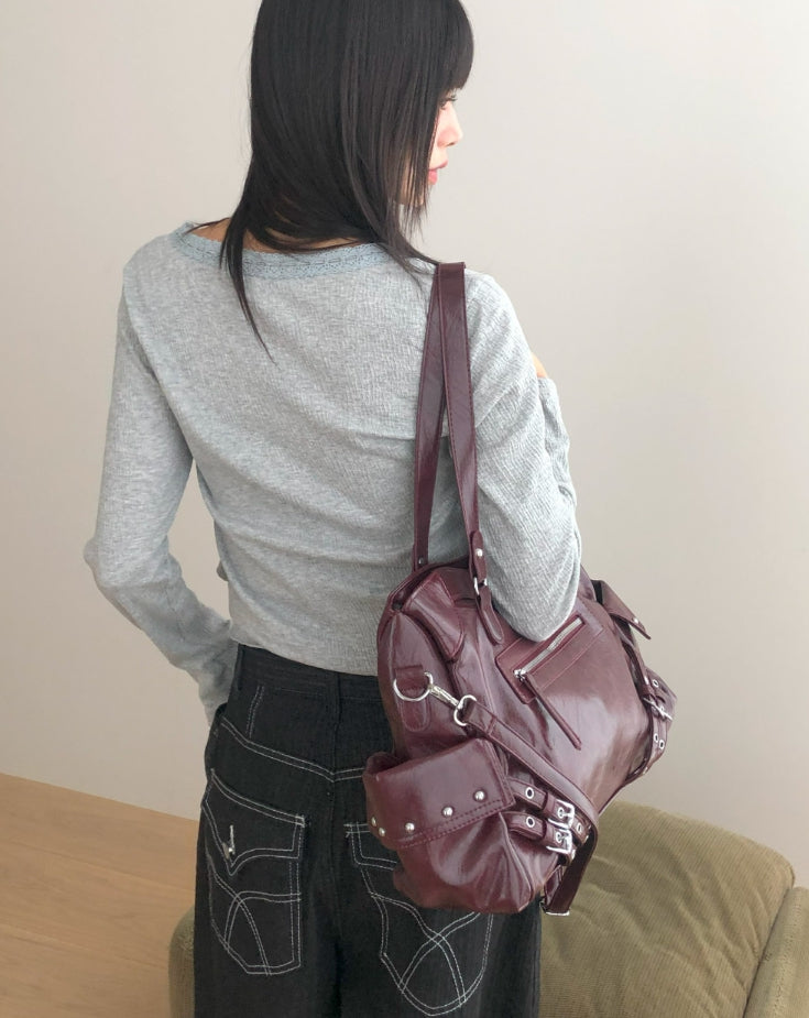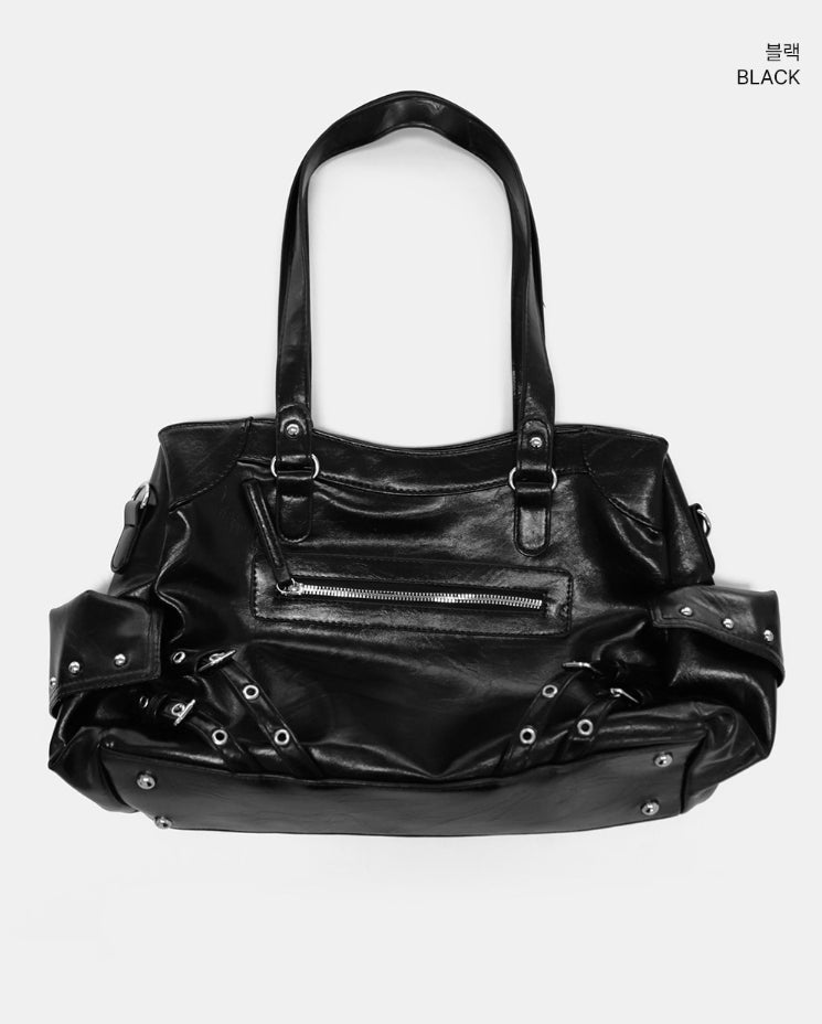 トミスタッドアイレットジッパーレザーショルダーバッグ