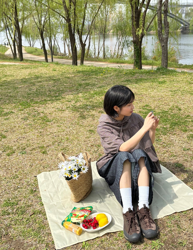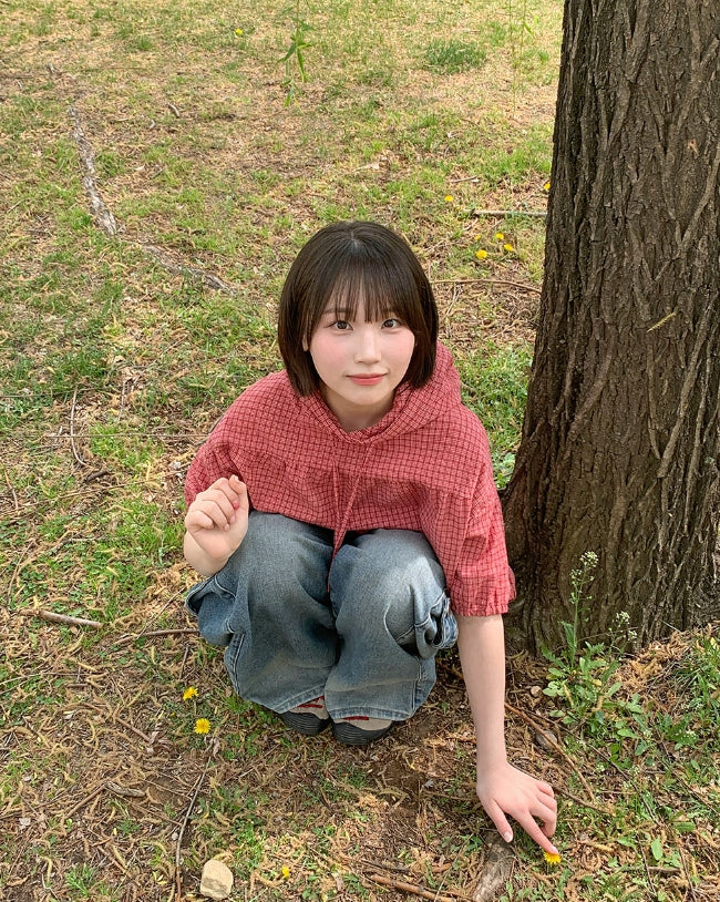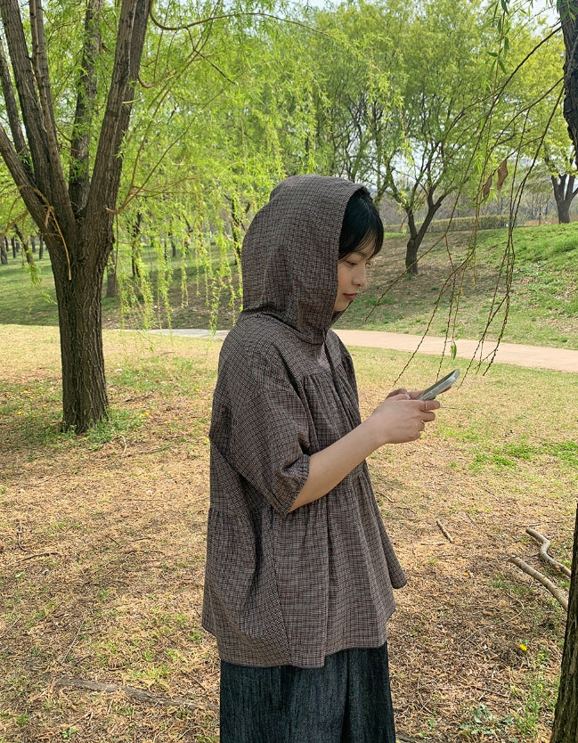 [BAONHAUS] Apon Hood Shirring Check Blouse