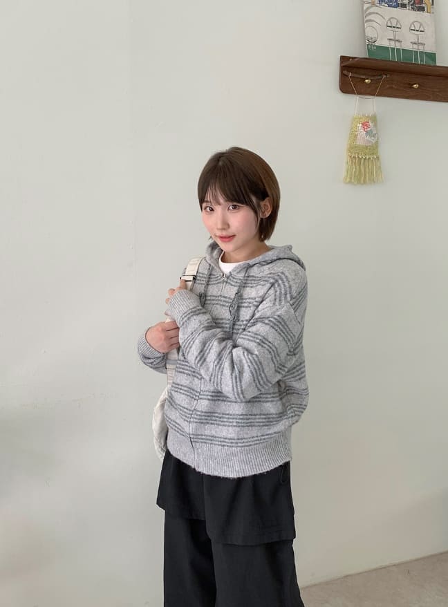 フェルトンデンストライプニットフードジップアップカーディガン