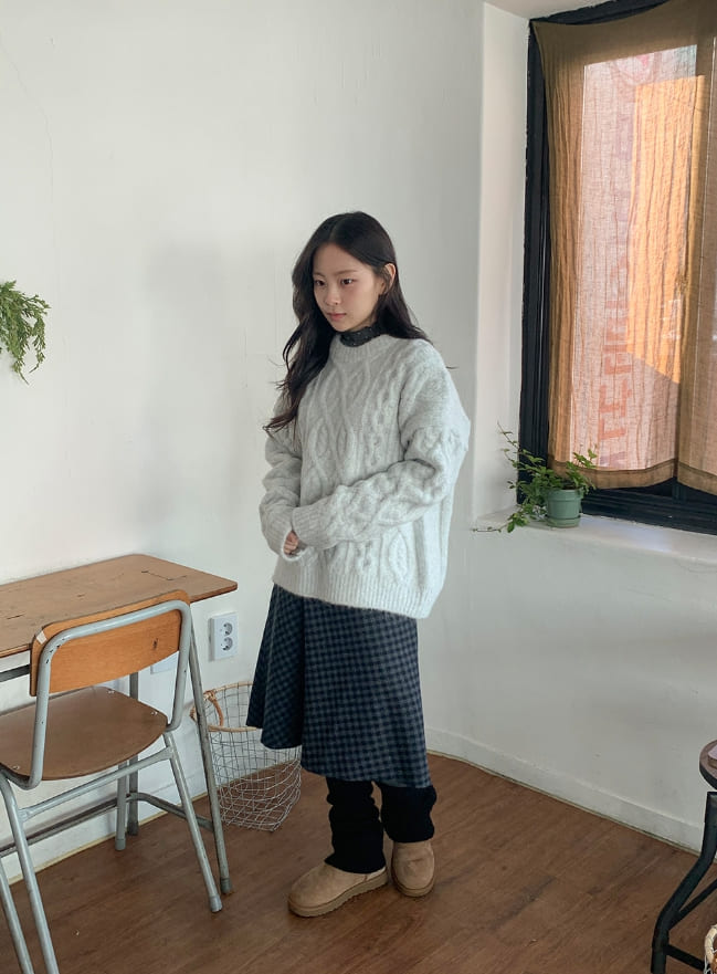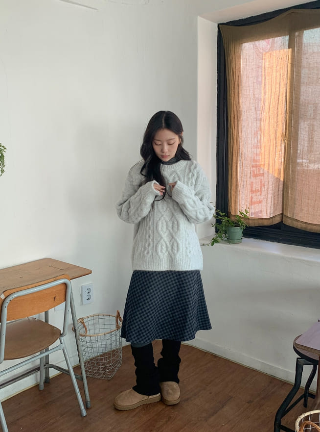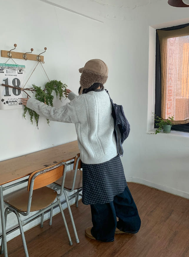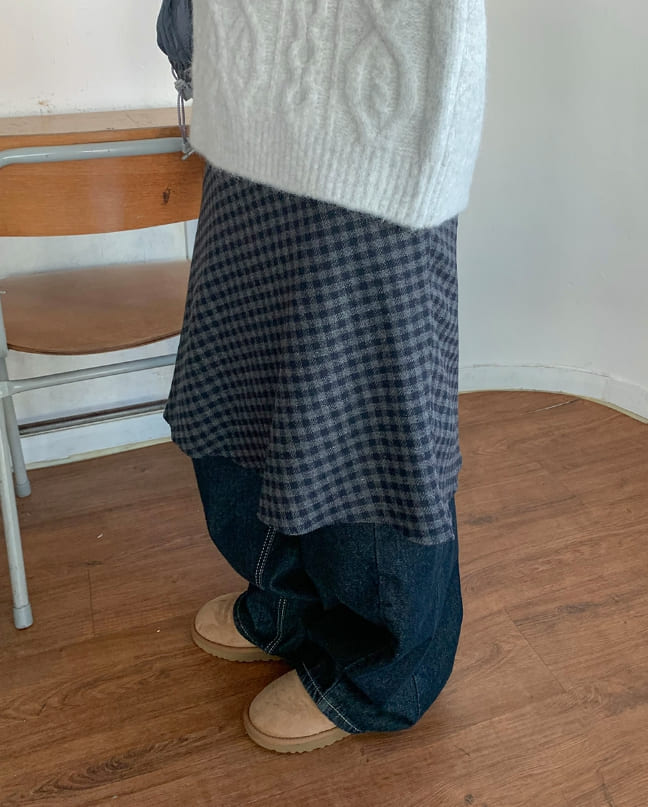 Mudori Wool Check Banding Midi Skirt