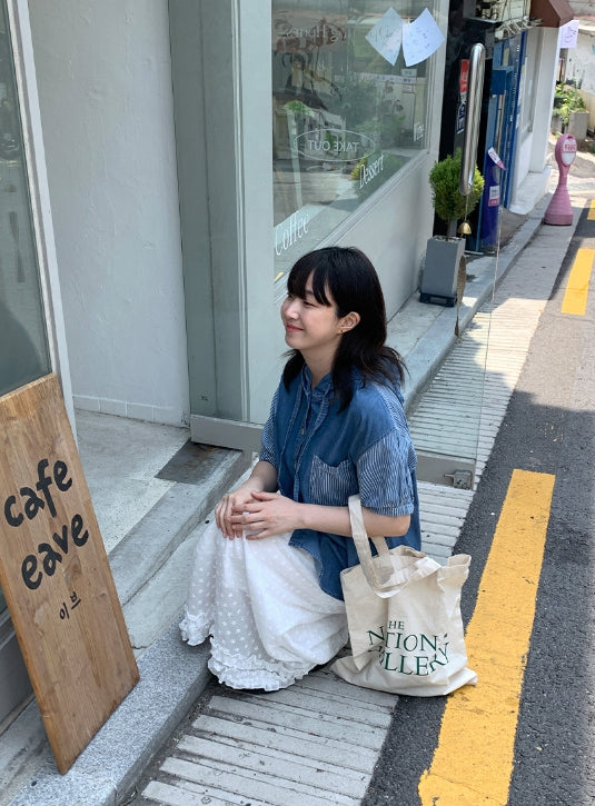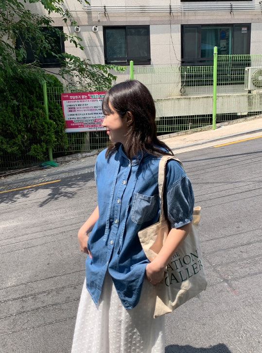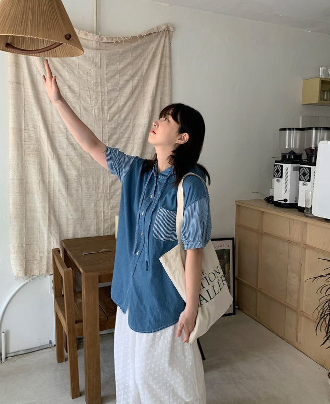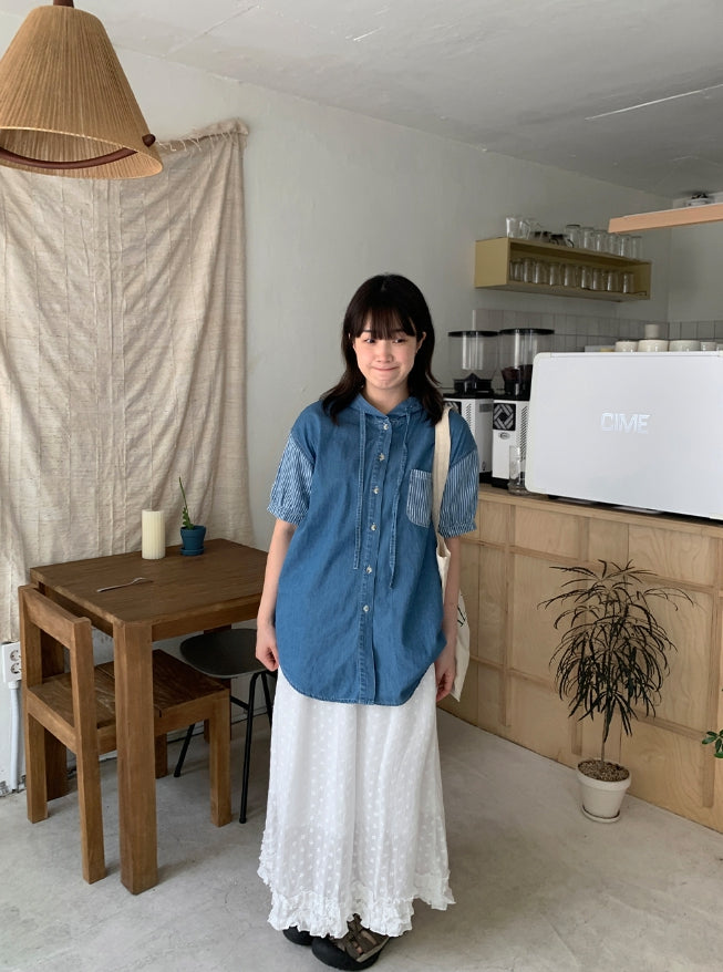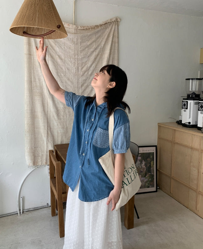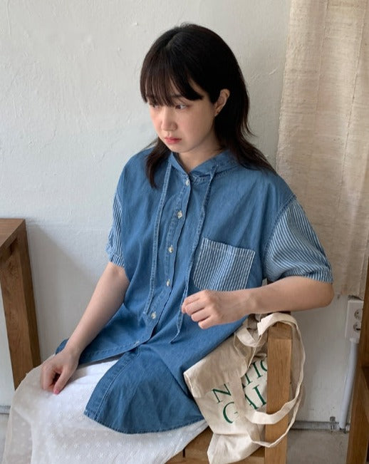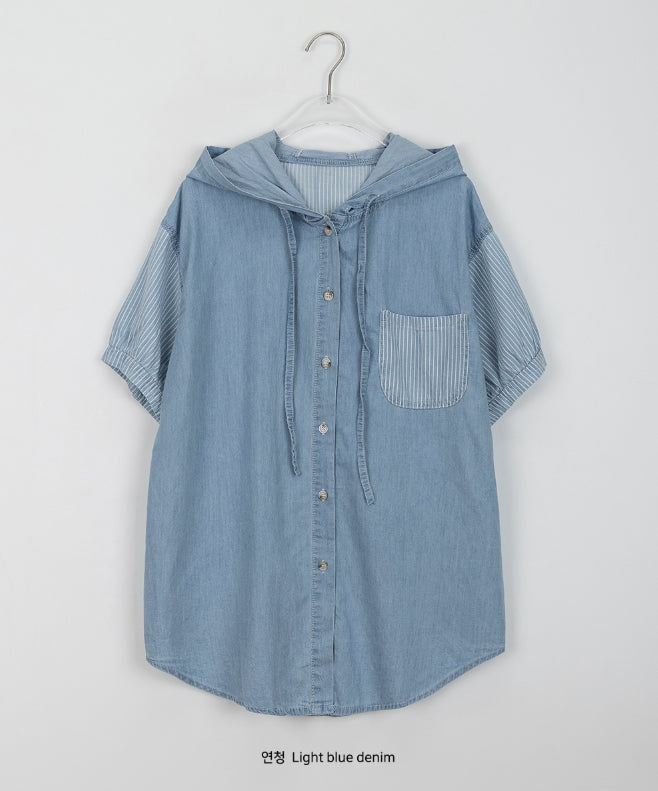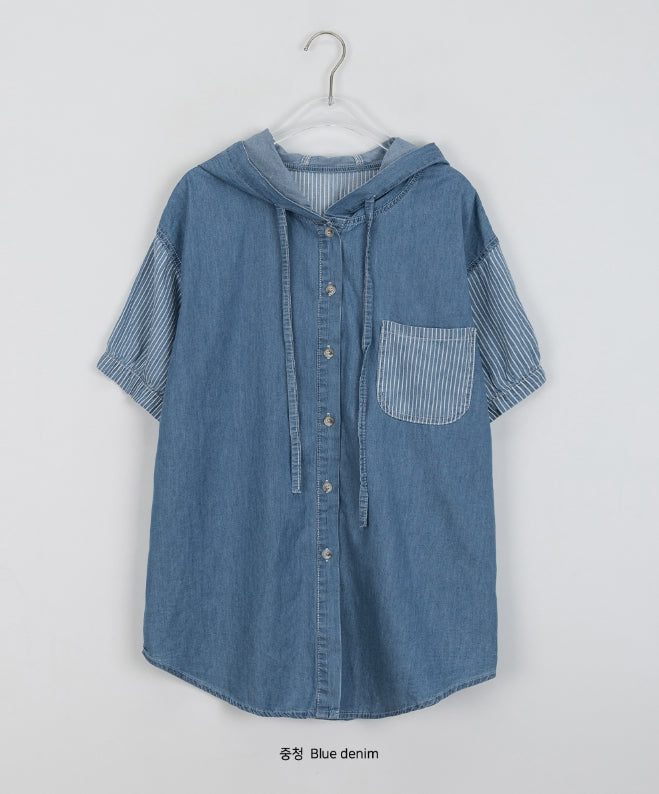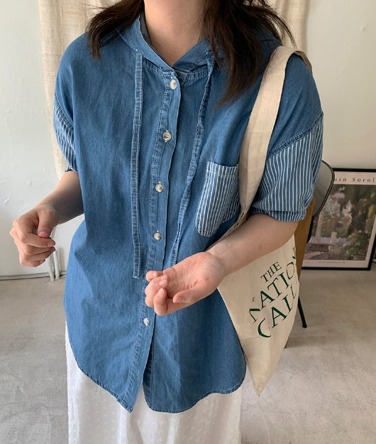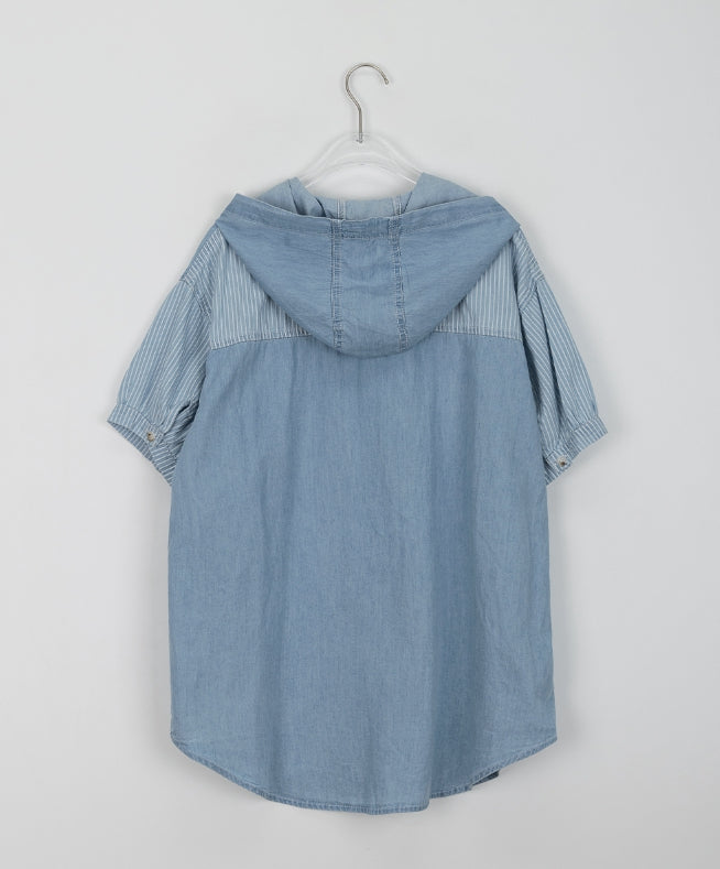 Rinta Stripe Color Matching Denim Hood Short Sleeve Shirt