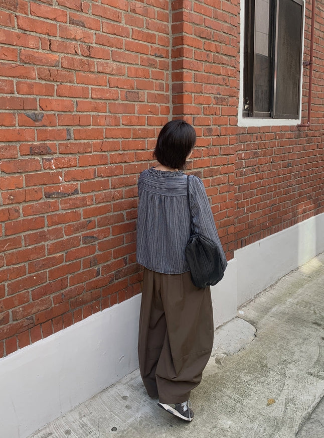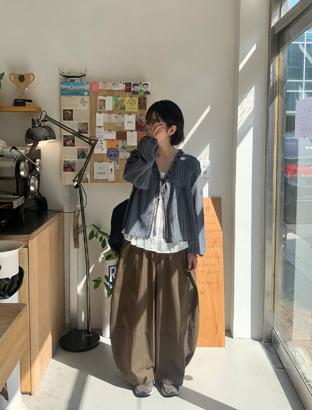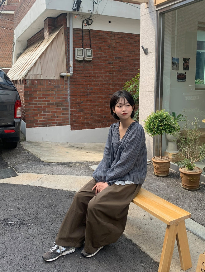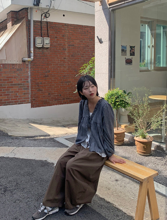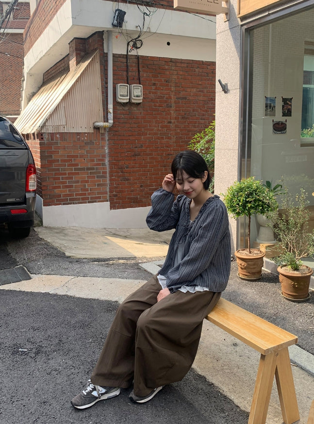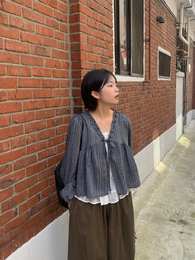 Slow-in Stripe Frill Ribbon Layered Blouse