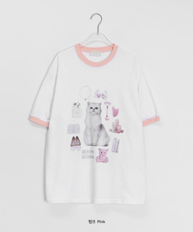 [男女兼用]ソセンスキャットプリントカラーオーバー半袖Tシャツ