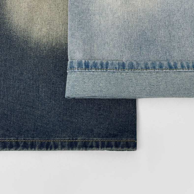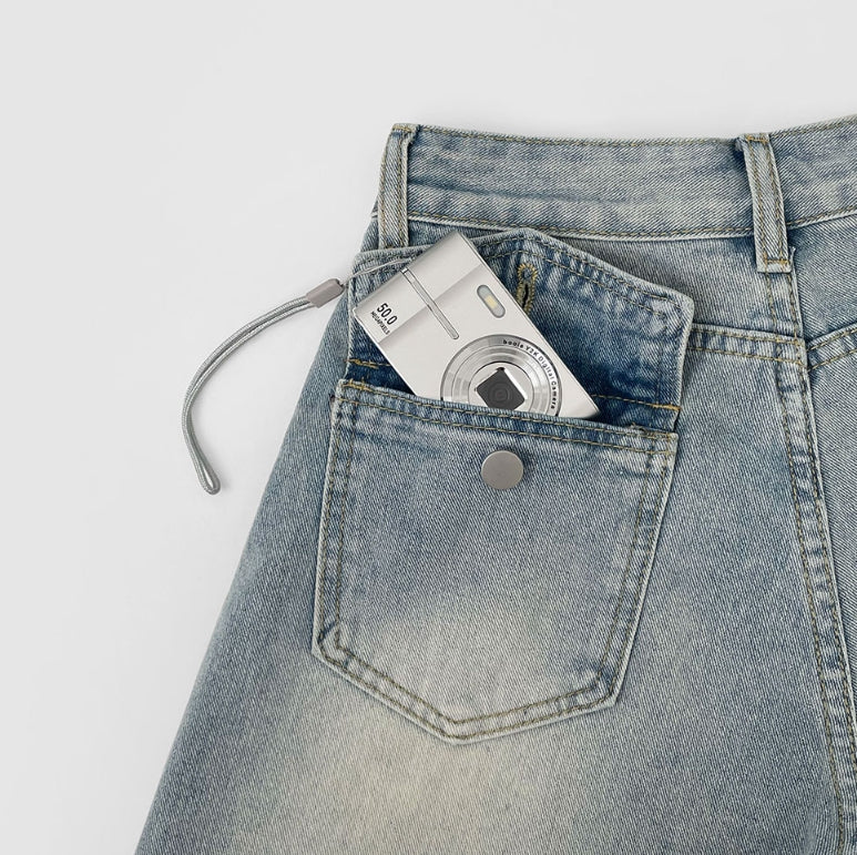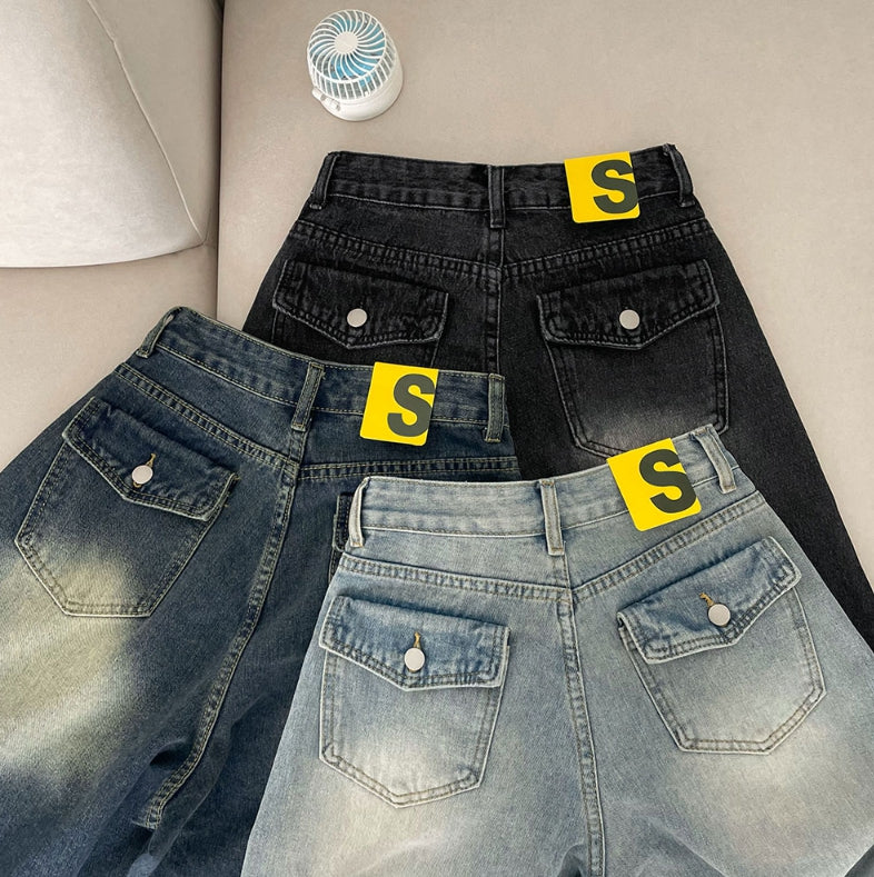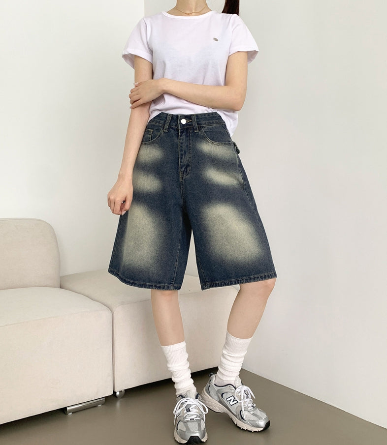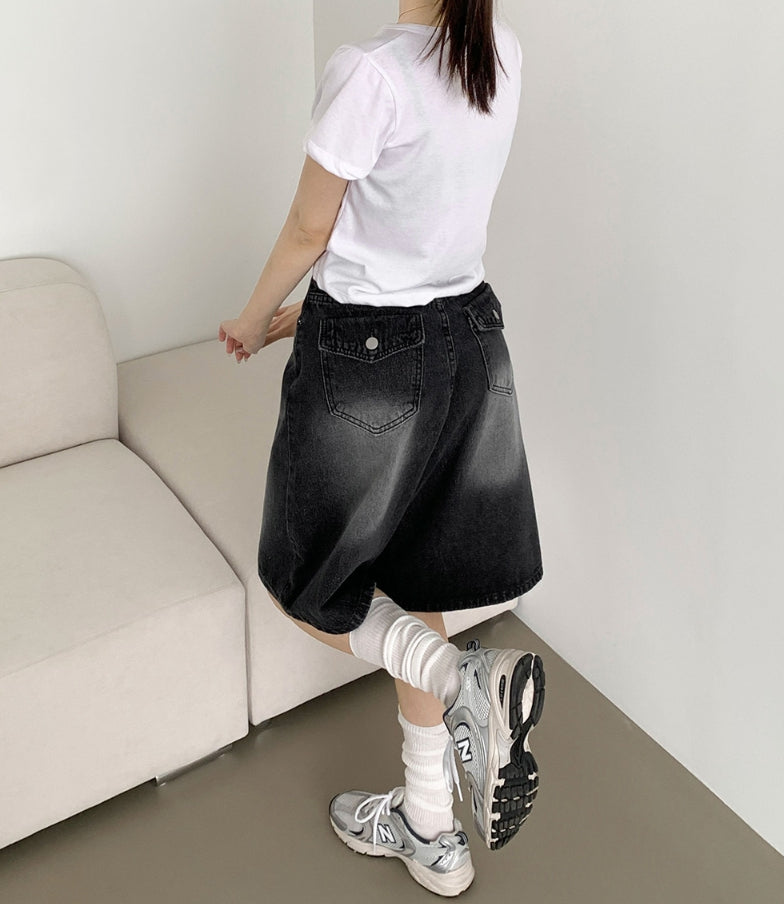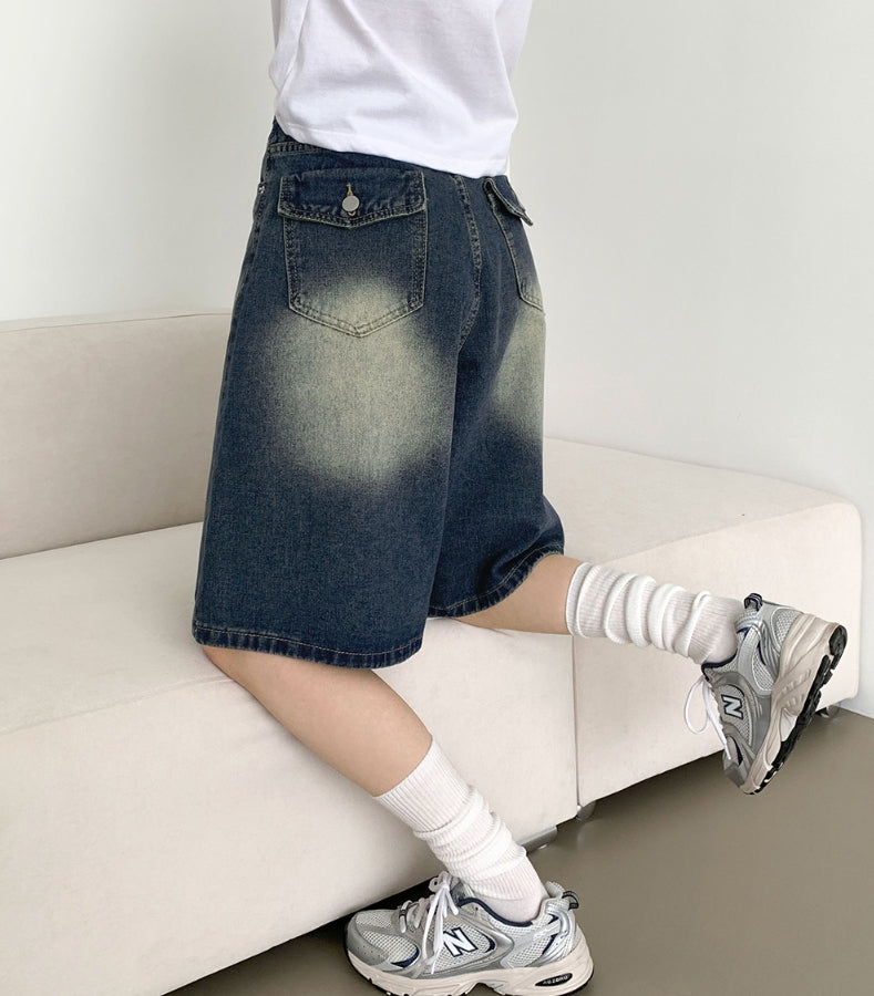 バックポケットウォッシュ加工バミューダAライン6分丈デニムショートパンツ