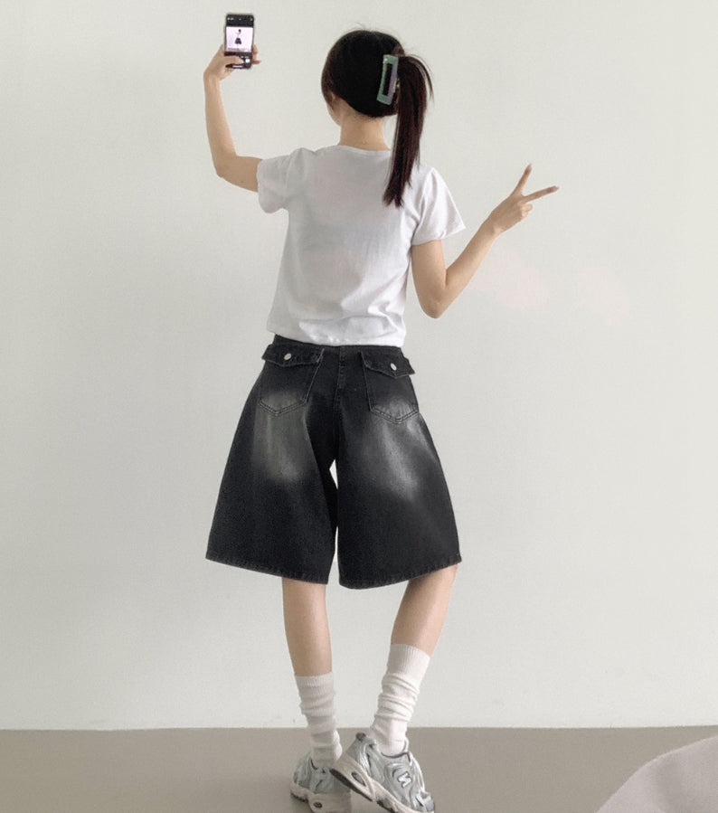 Back Pocket Washing Bermuda A-Line Knee Length Denim Shorts