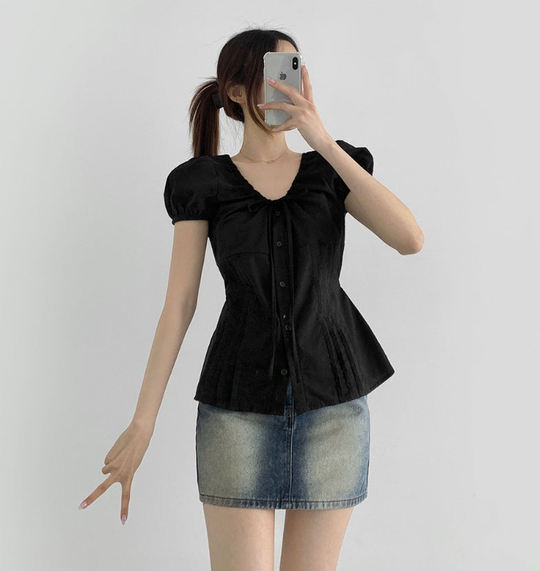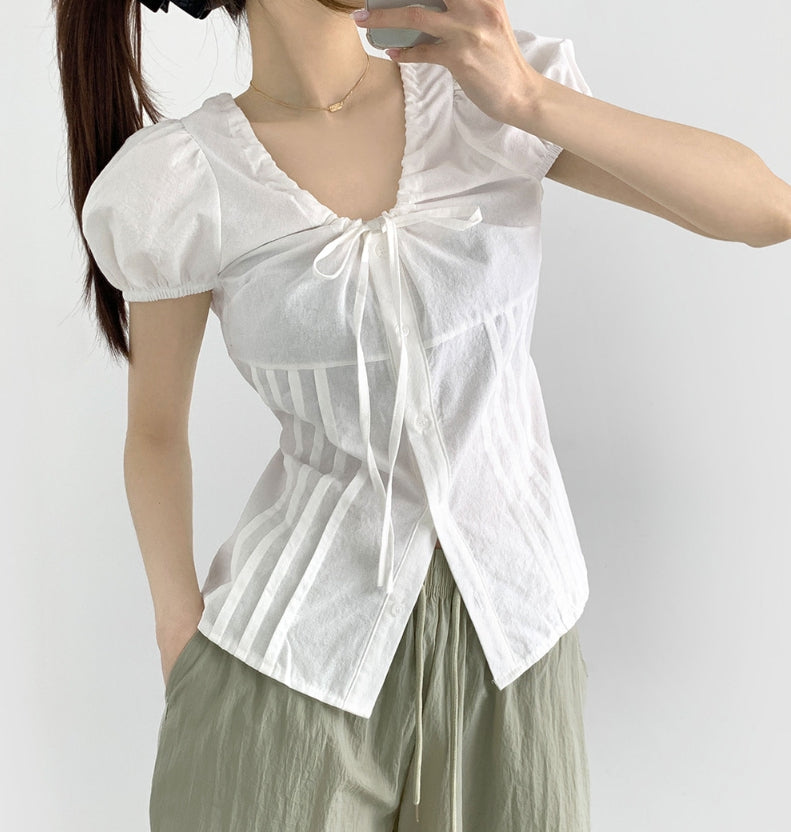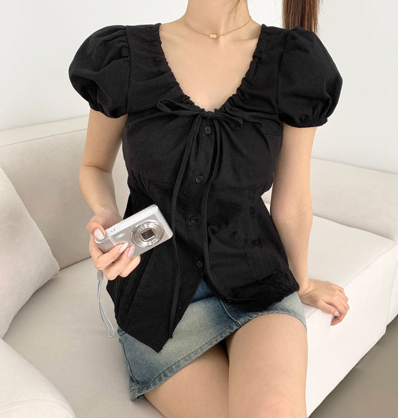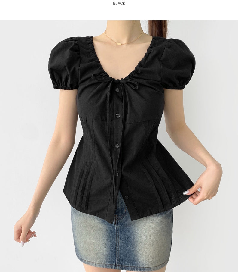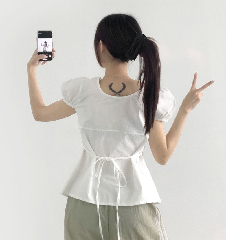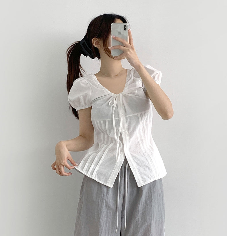 Balloon Soft Fit Ribbon Strap Short Sleeve Blouse