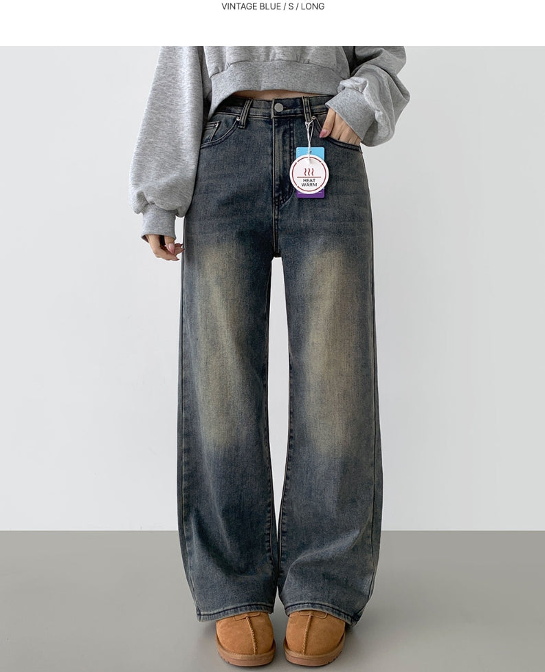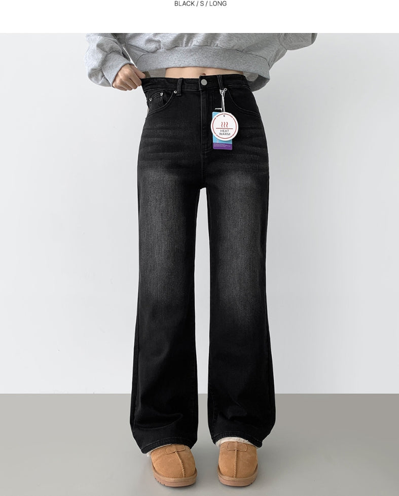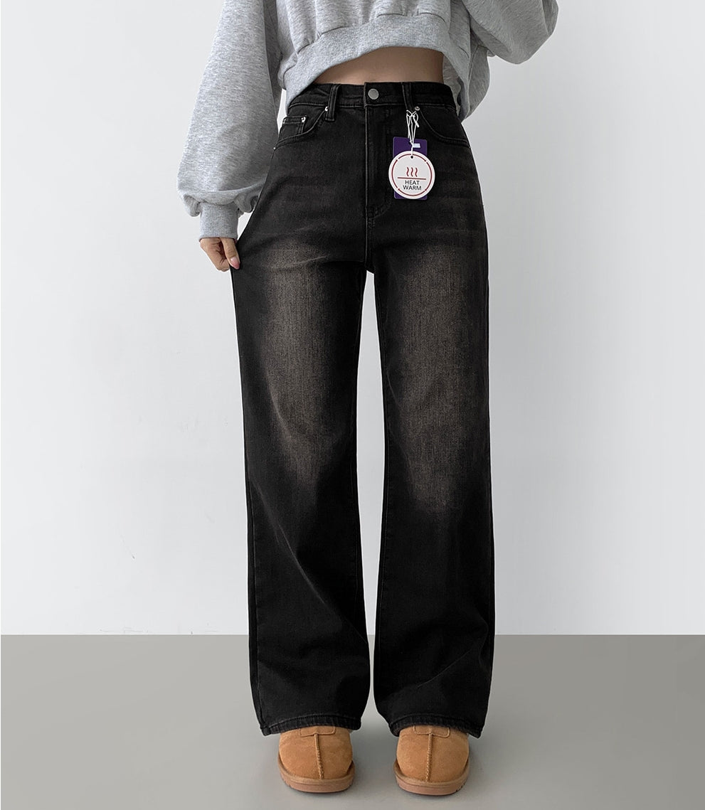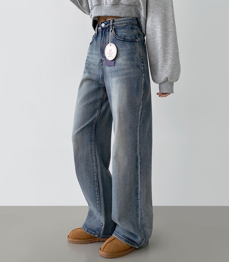 Basic Wide Fit Washing Banding Span Heated Fabric Brushed Denim Pants