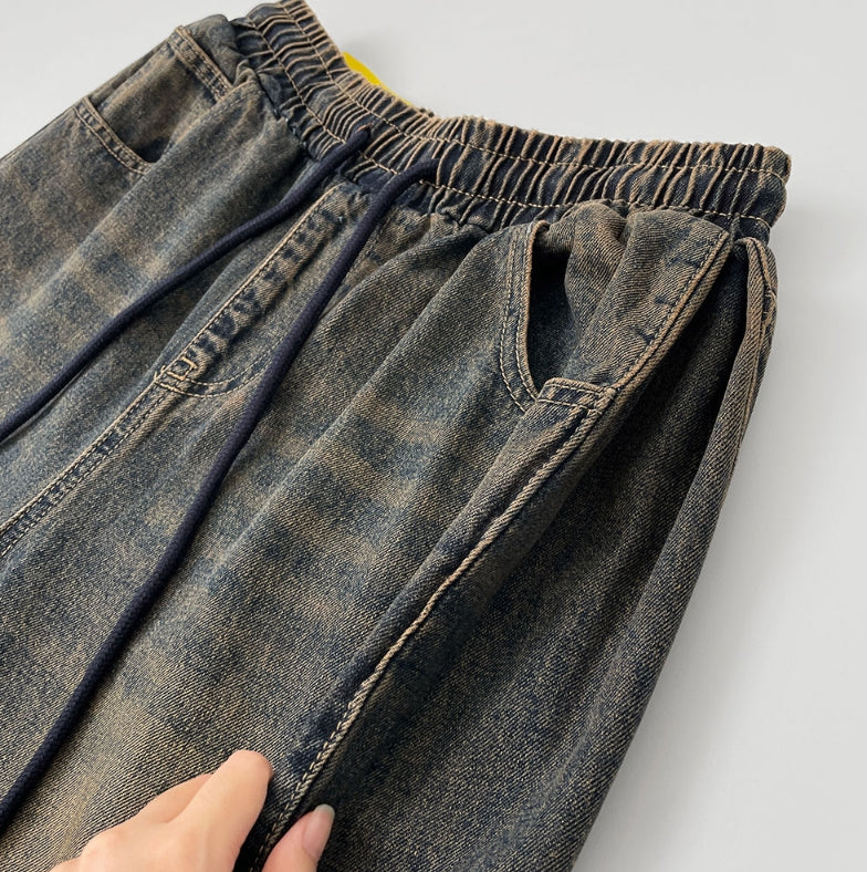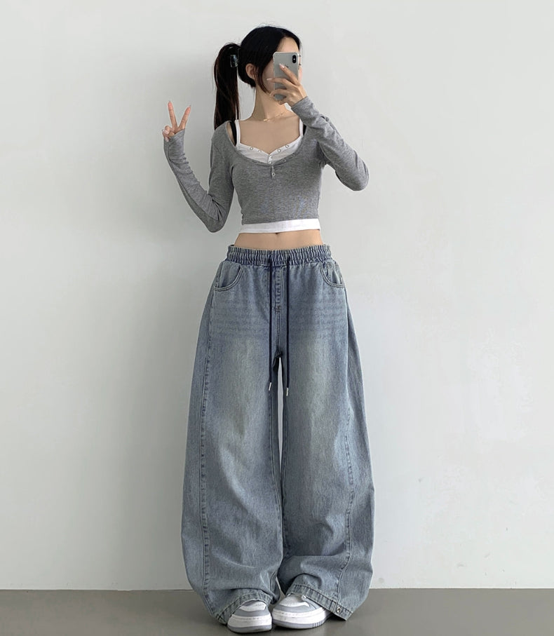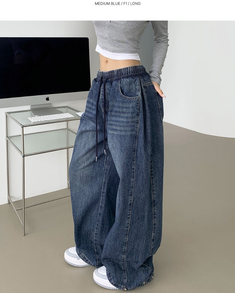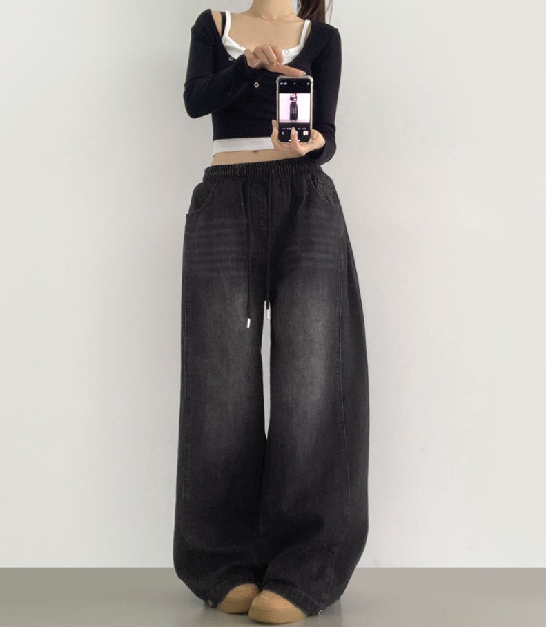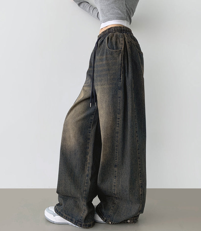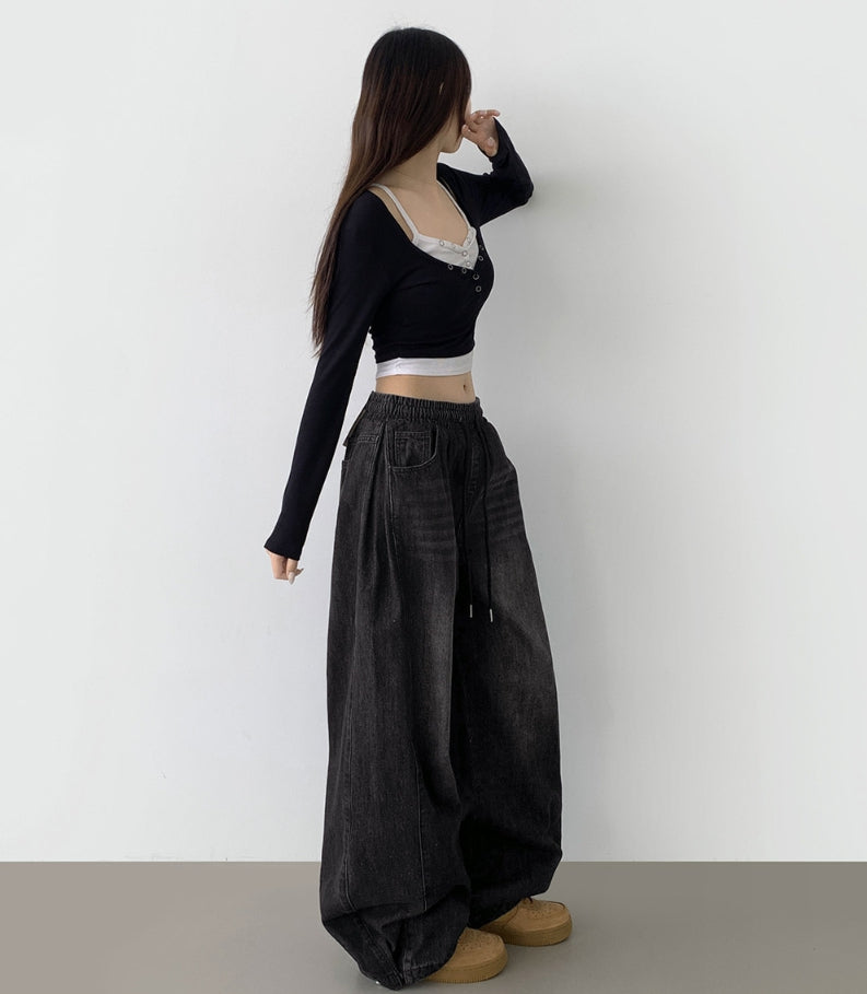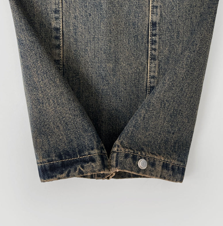 Folding Pin Tuck Hem Snap Balloon Fit Wide Fit Banding Denim Pants