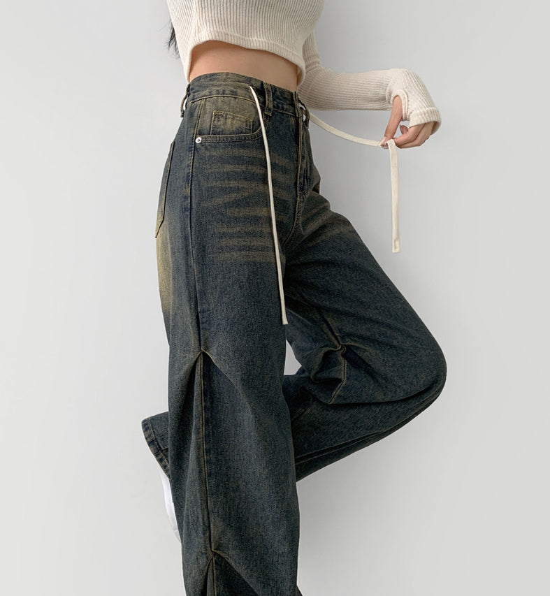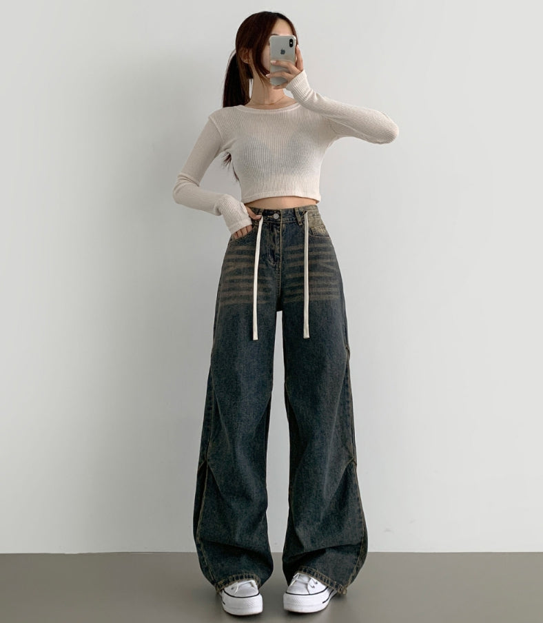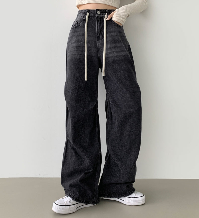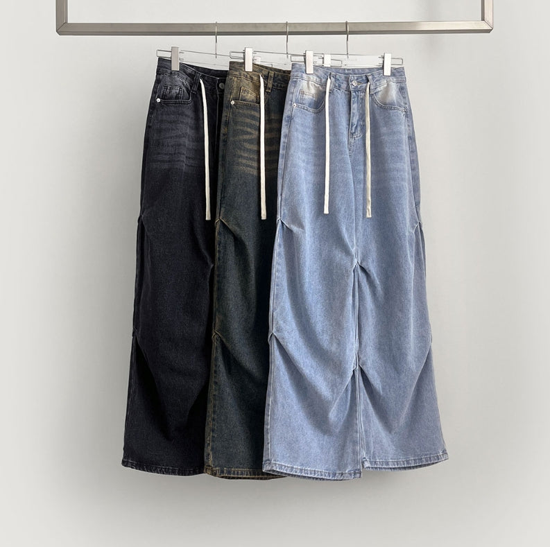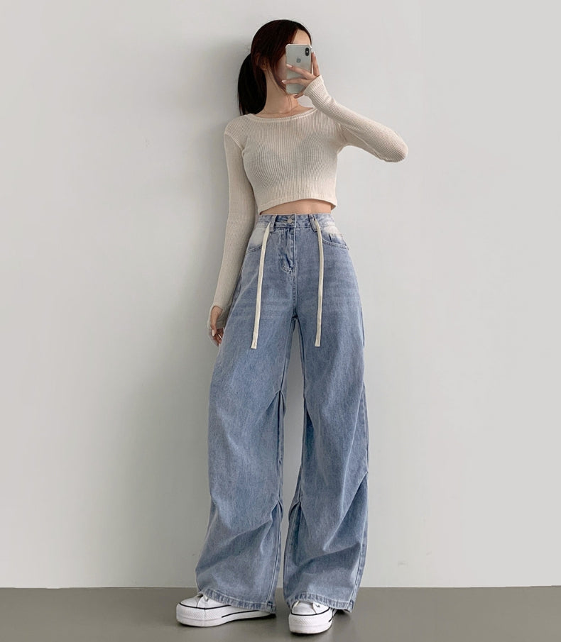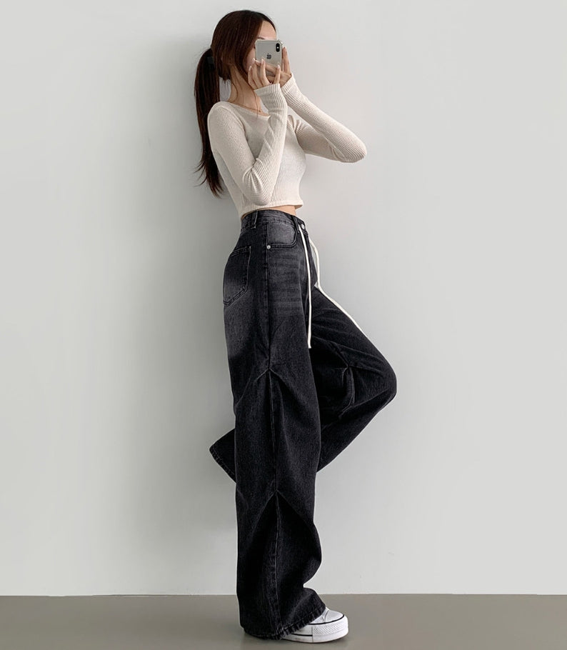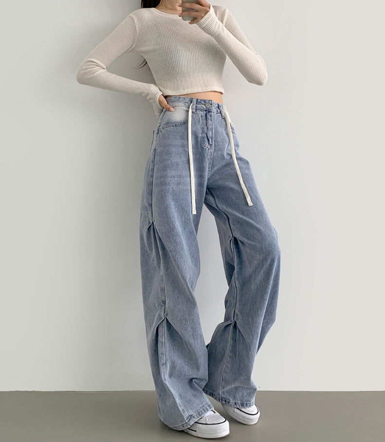 Knee Side Pin Tuck Balloon Waist Adjustment Wide Fit Denim Pants