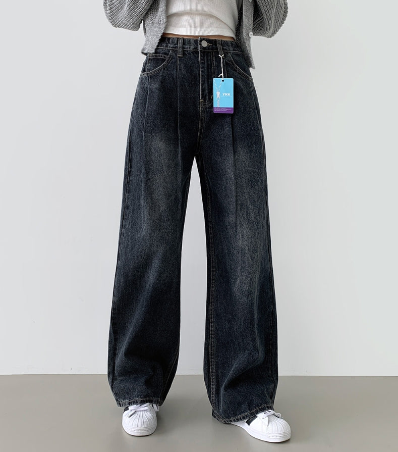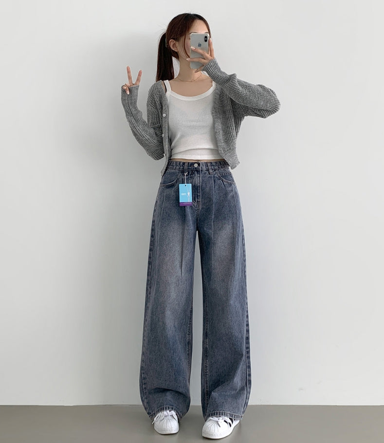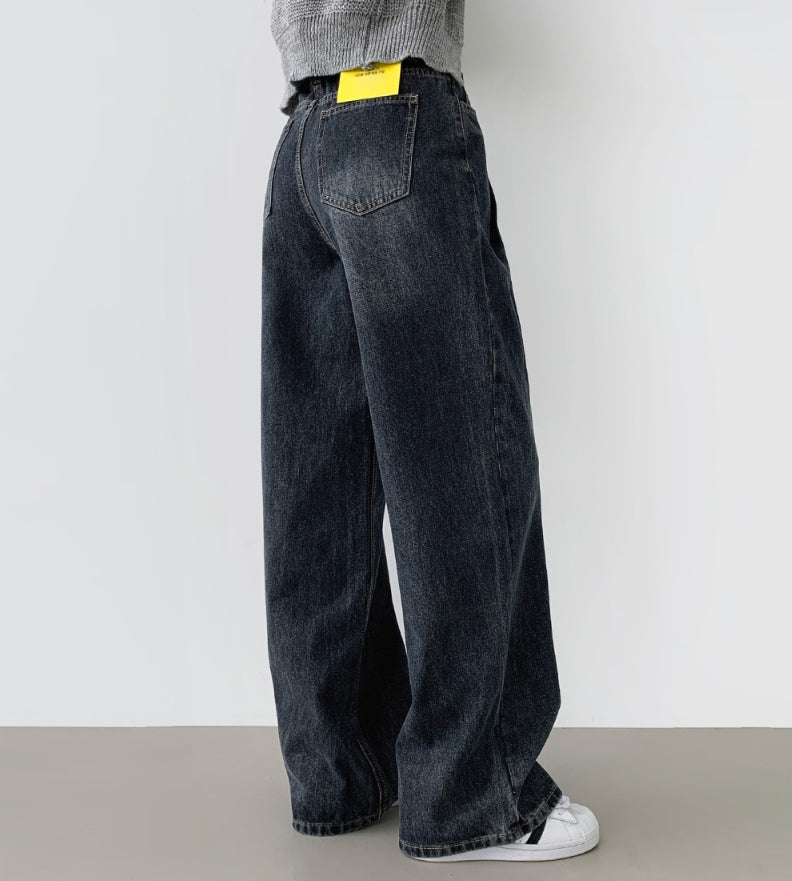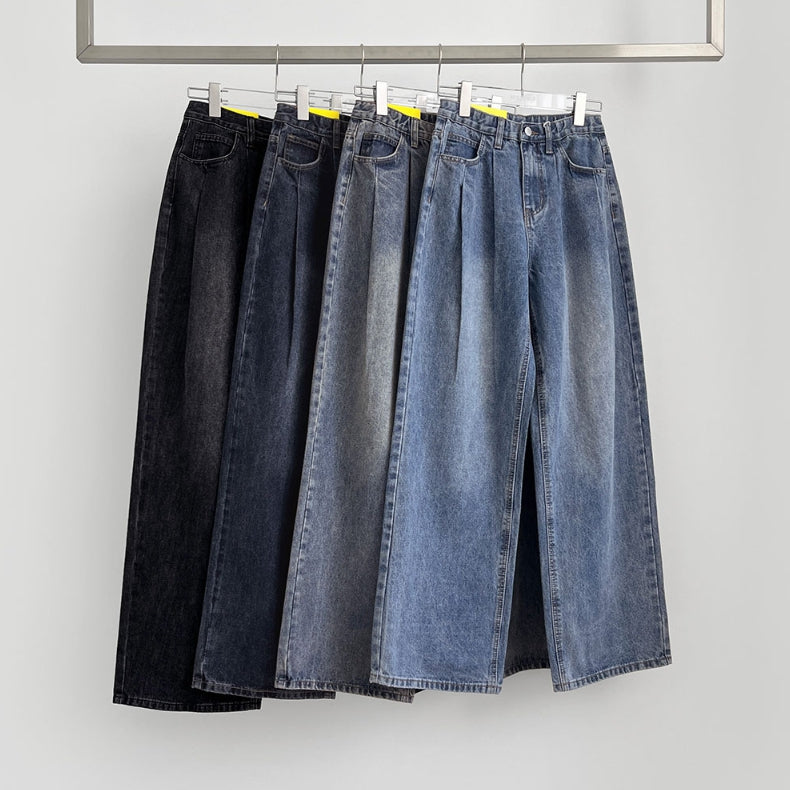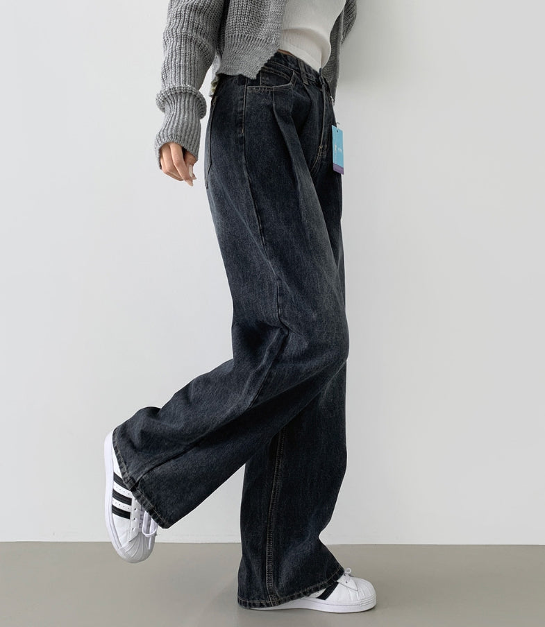 Pin Tuck Banding Casual Long Wide Washing Denim Pants