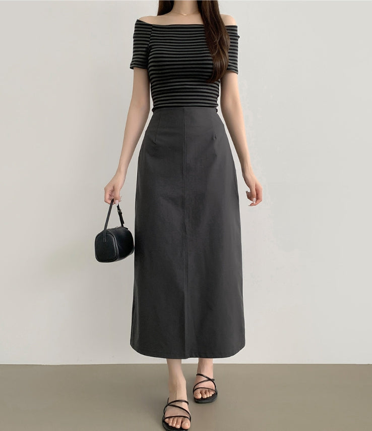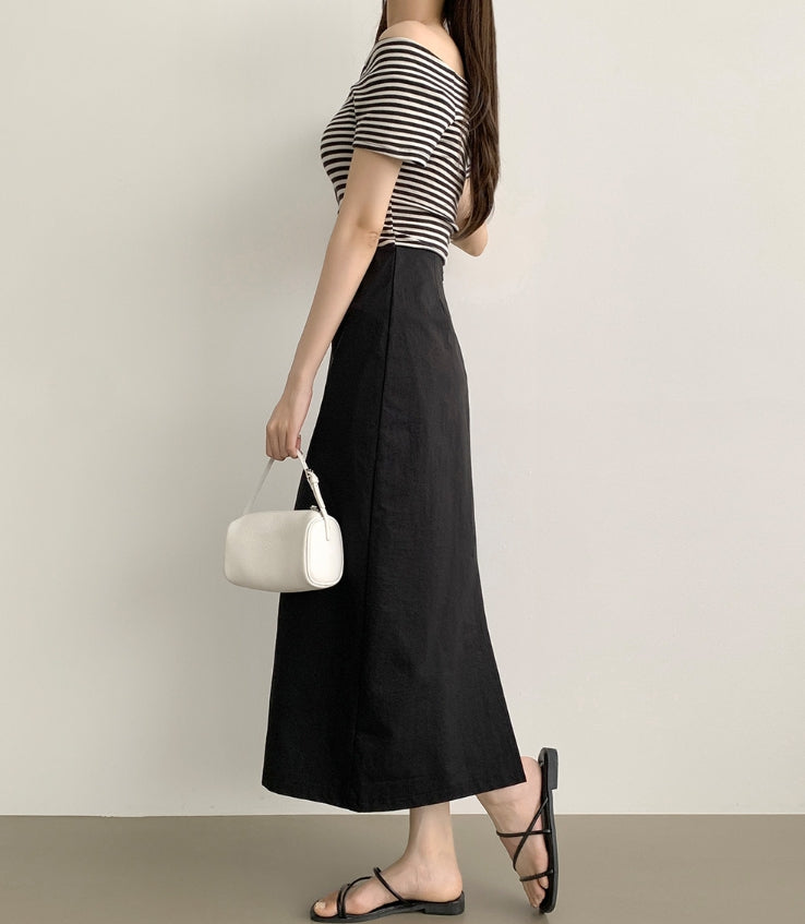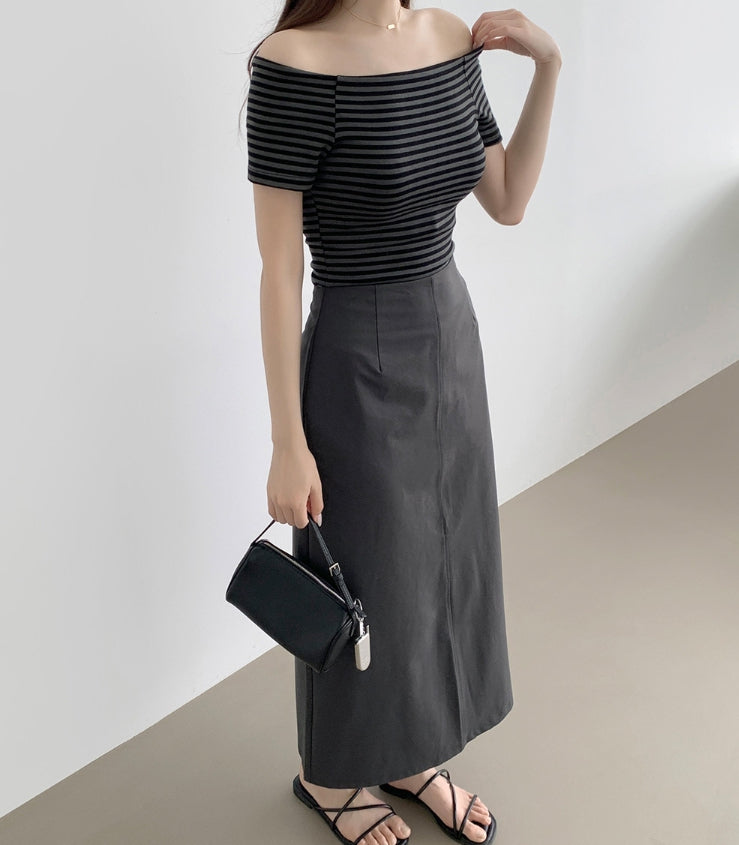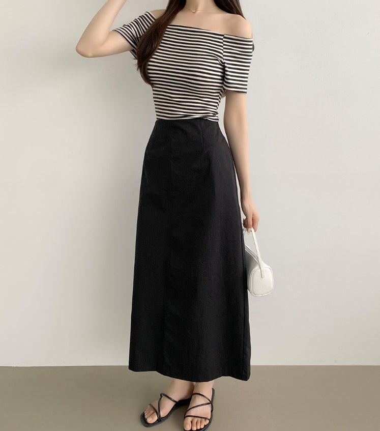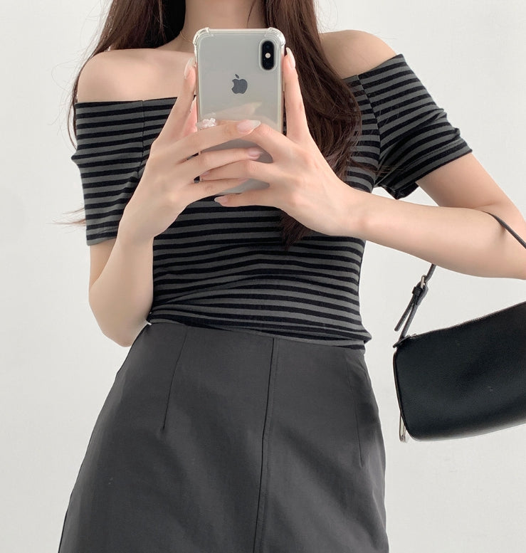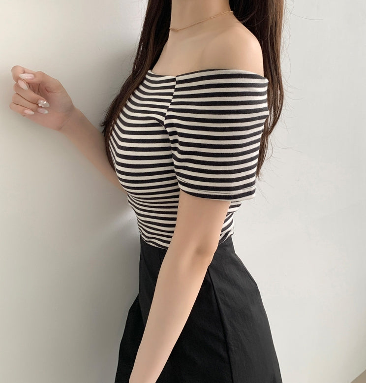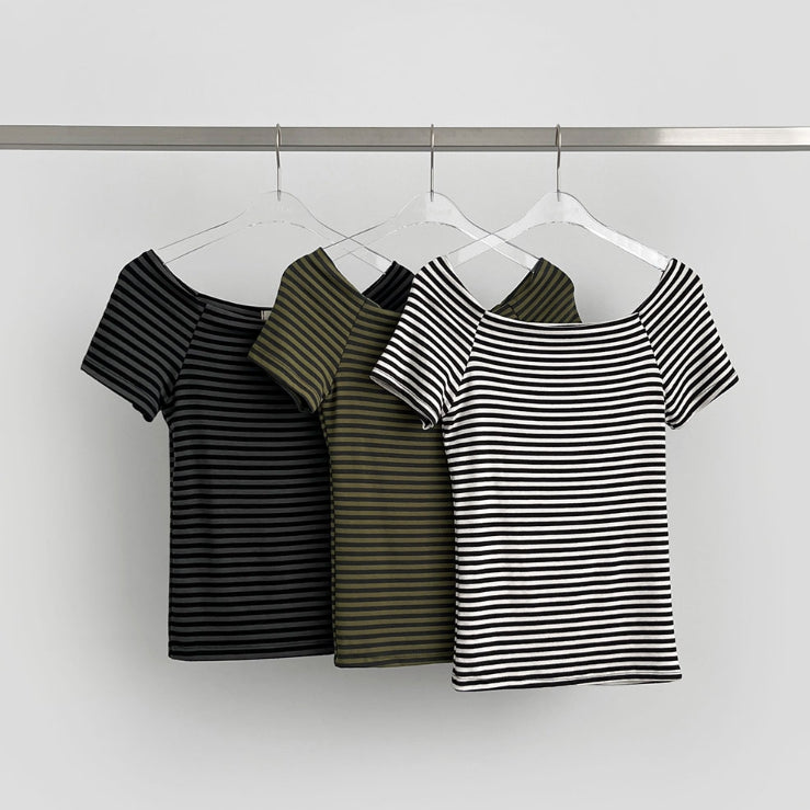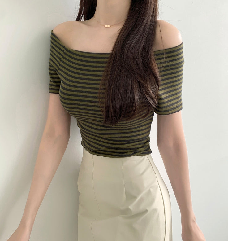 Stripe Span Off-shoulder Slim Fit Basic Length Short Sleeve T-shirt