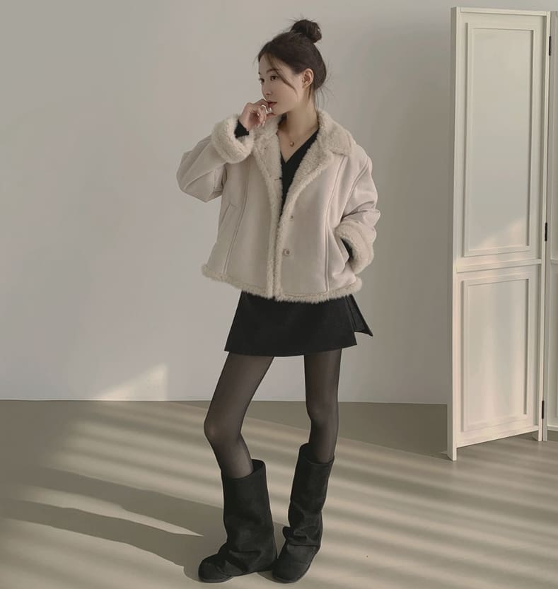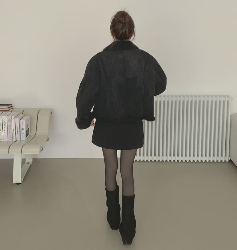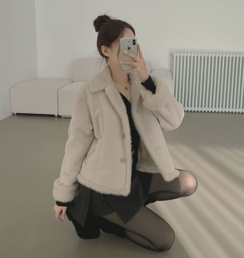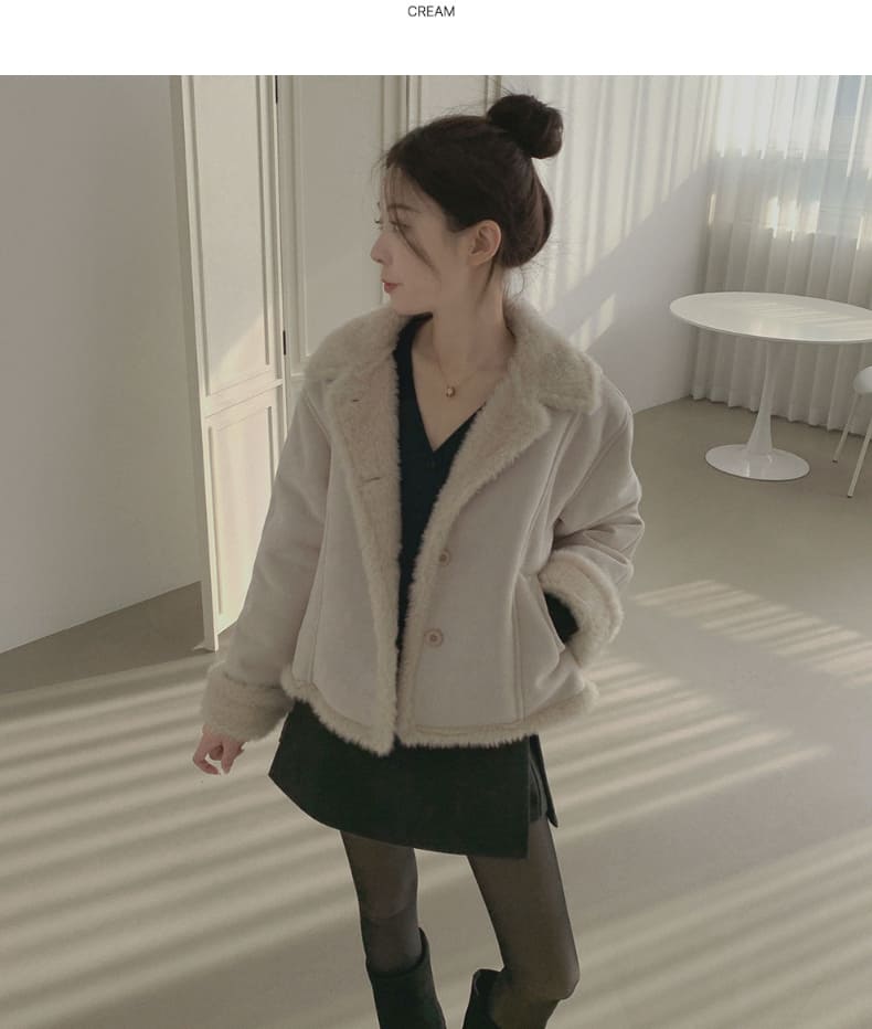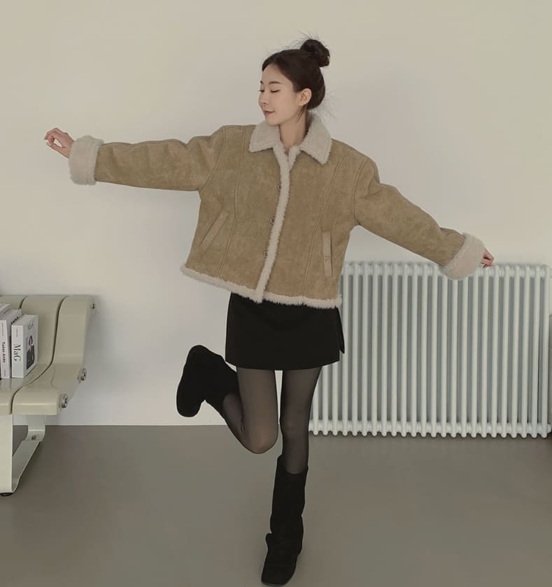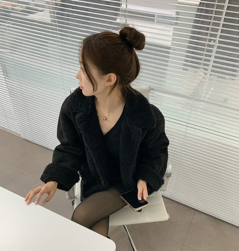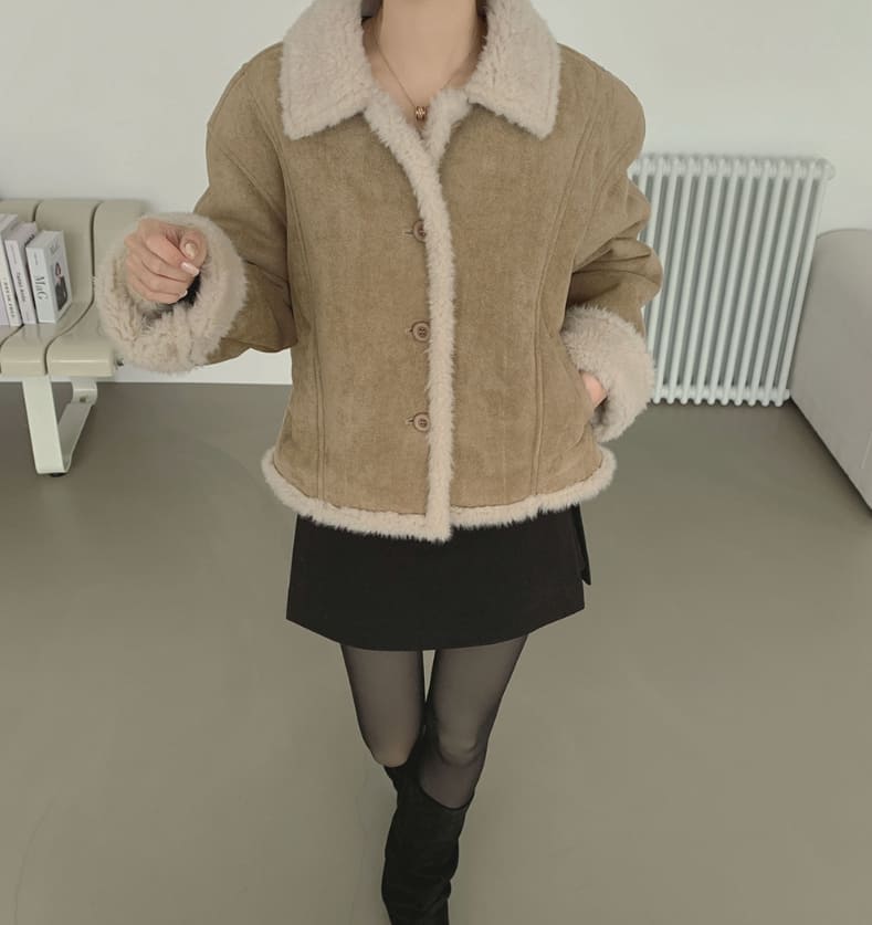スエードテディベアボタン襟付きスリーブファーショートムスタン