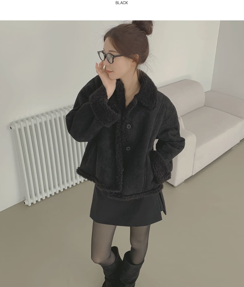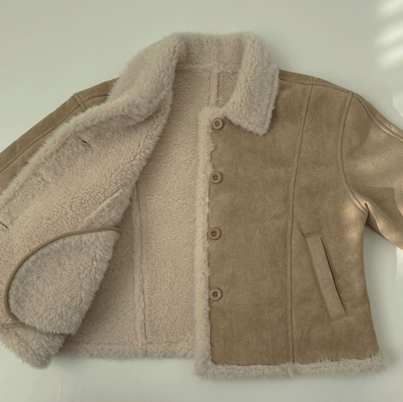 スエードテディベアボタン襟付きスリーブファーショートムートン