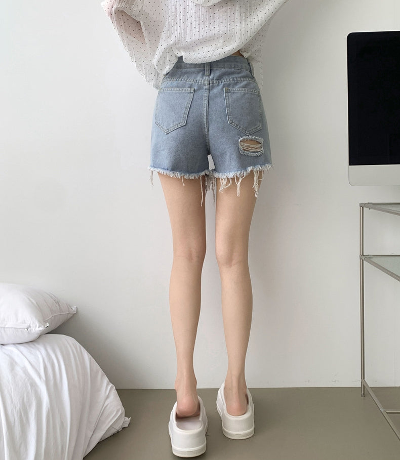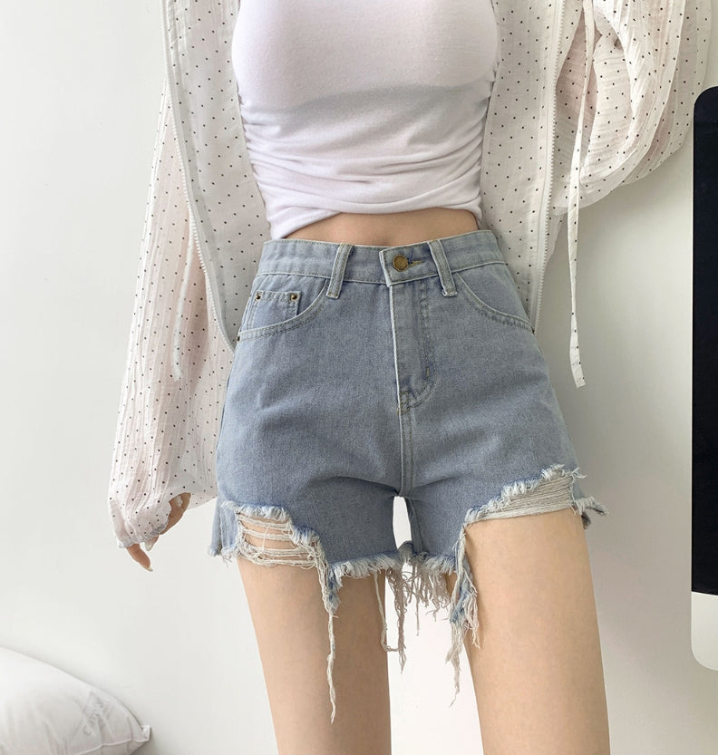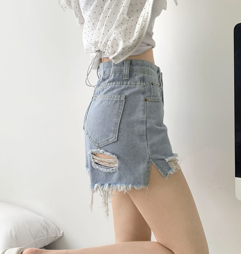 Hot Summer Cutting Side Slit Ripped Denim Shorts