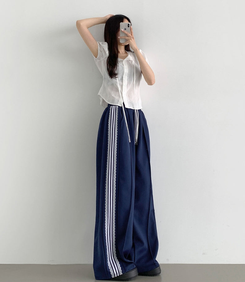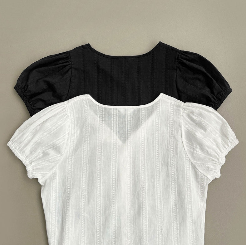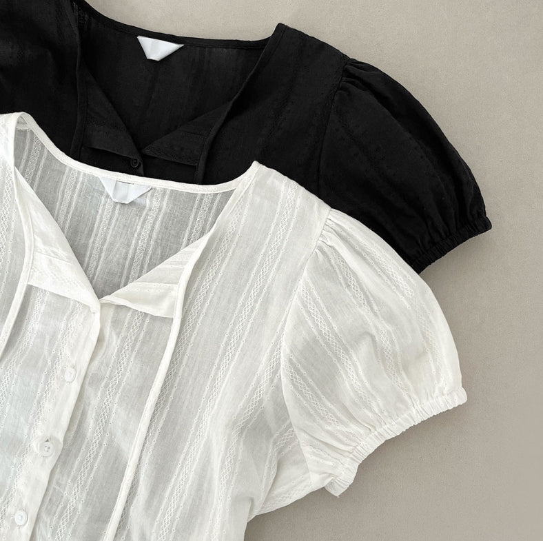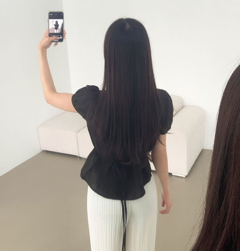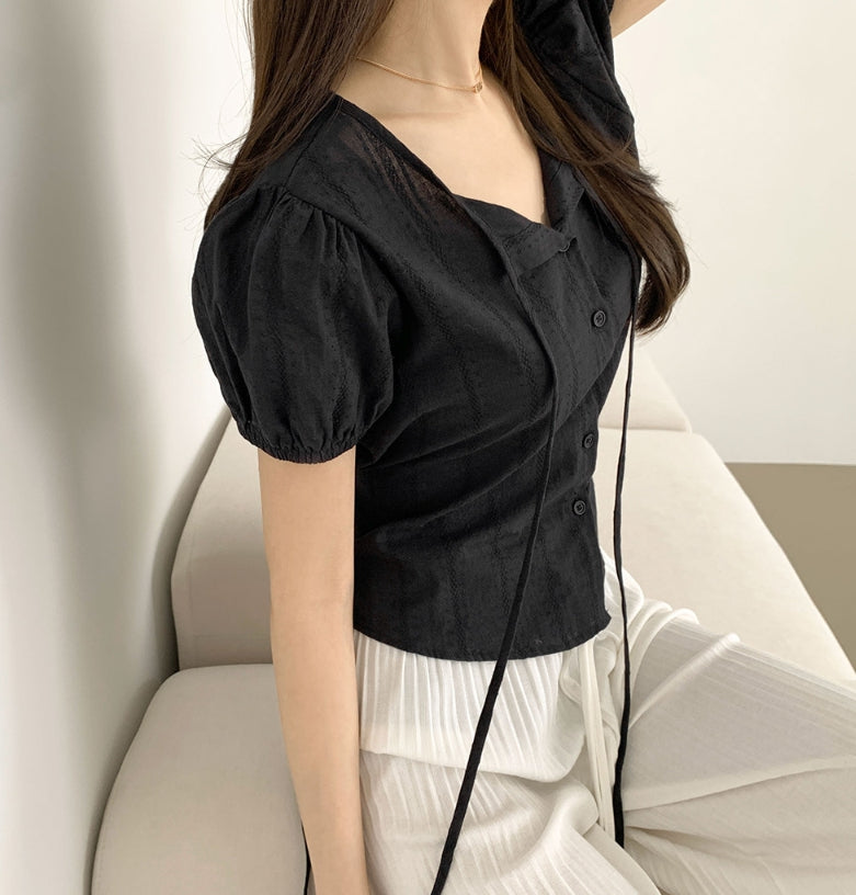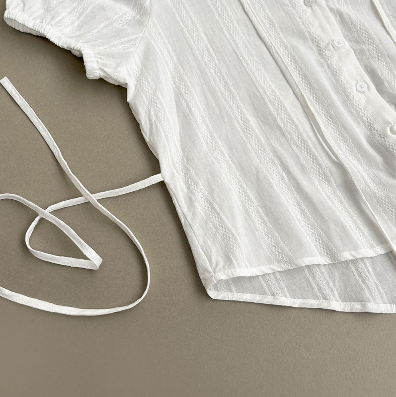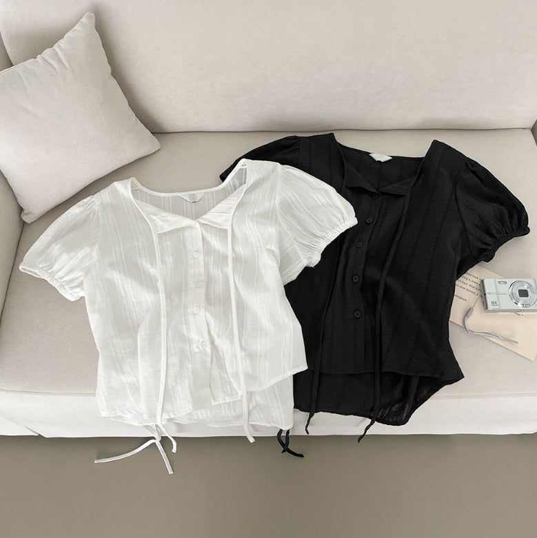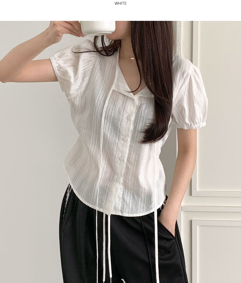 Summer Lace Pattern Puff Short Sleeve Ribbon Blouse