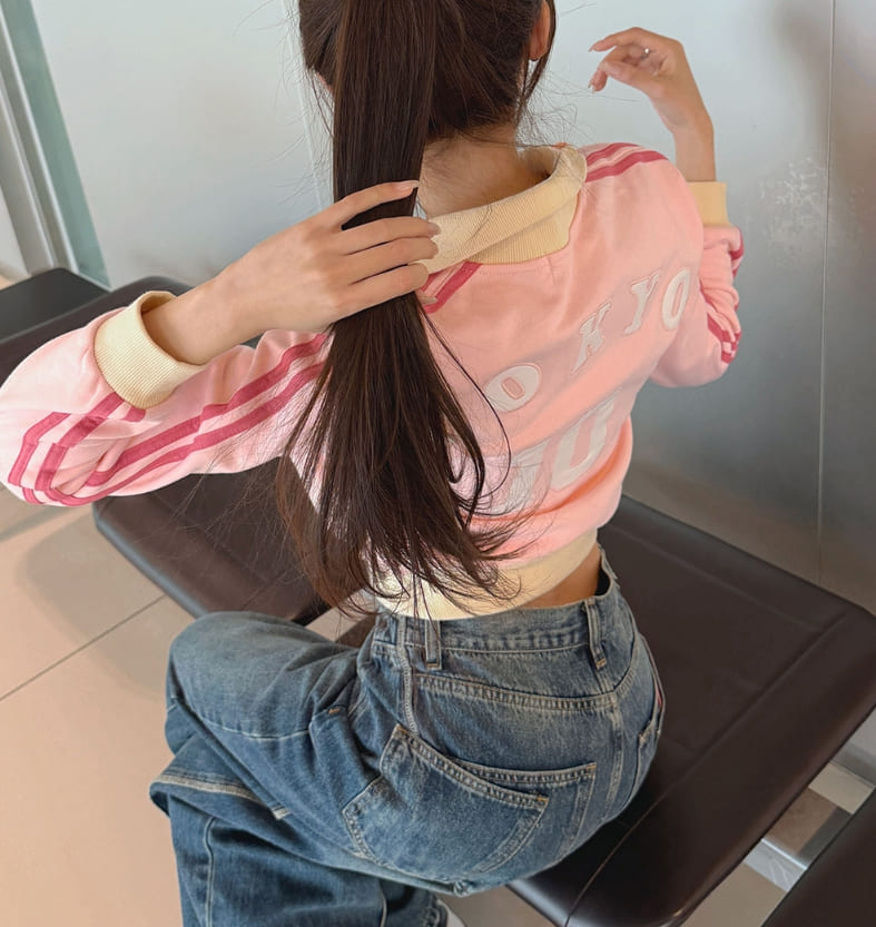 Tokyo Lettering High Neck Color Matching Pink Crop Jersey