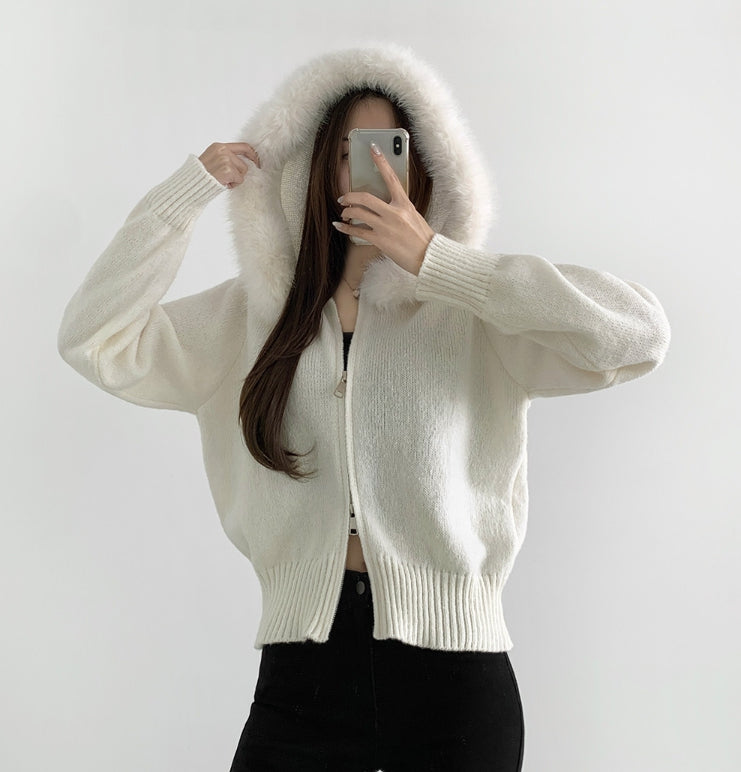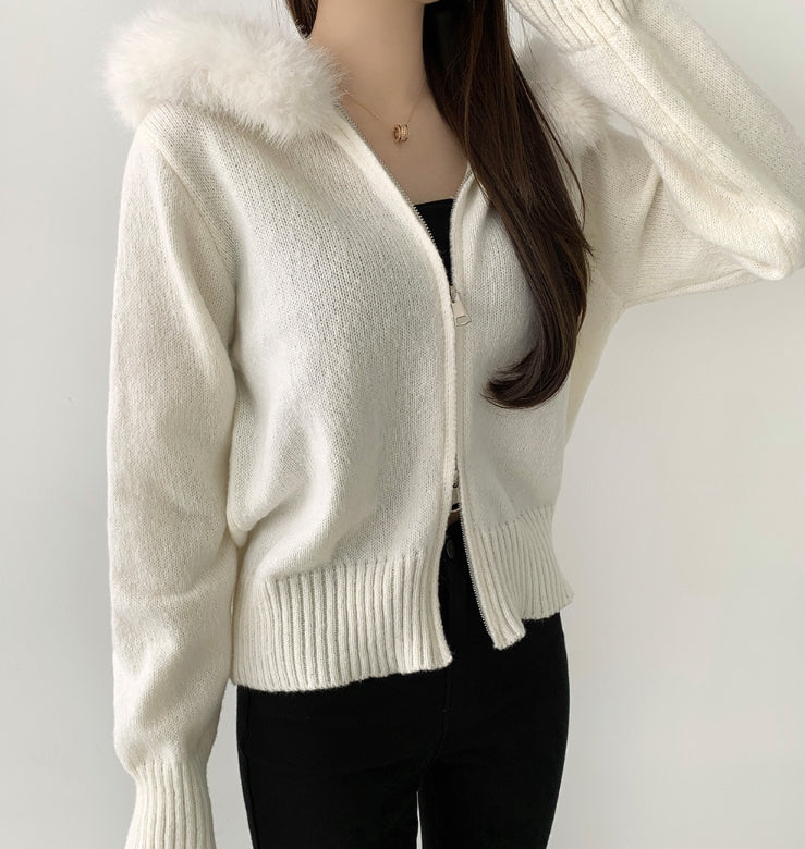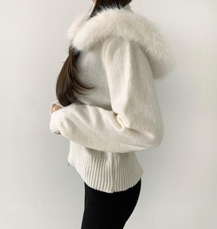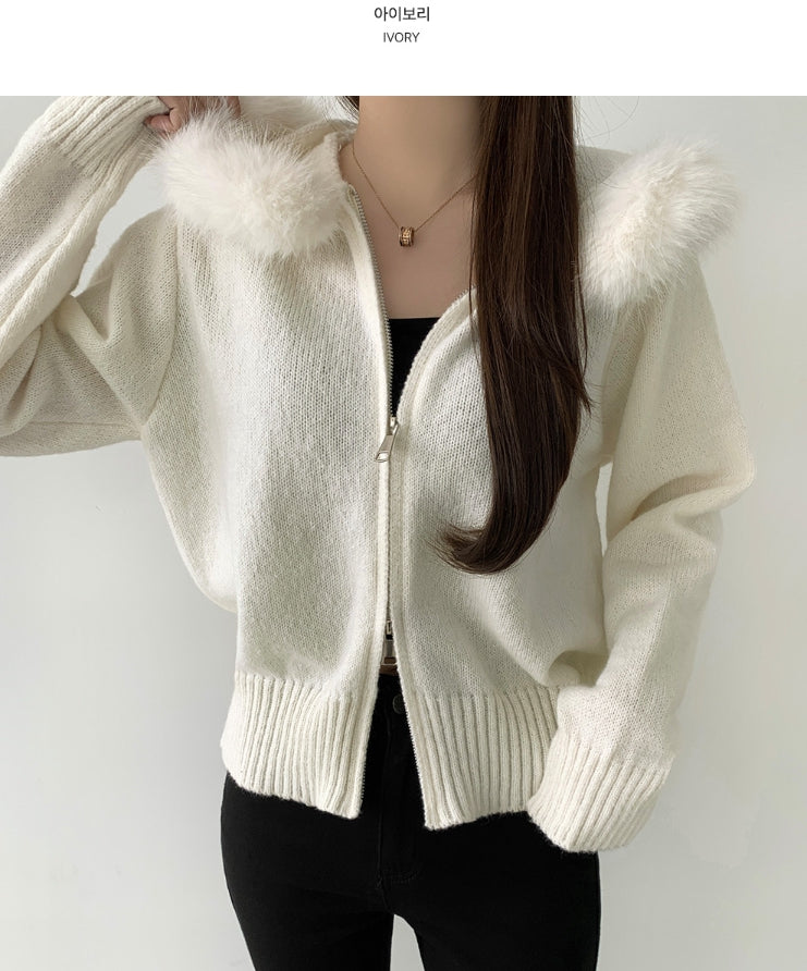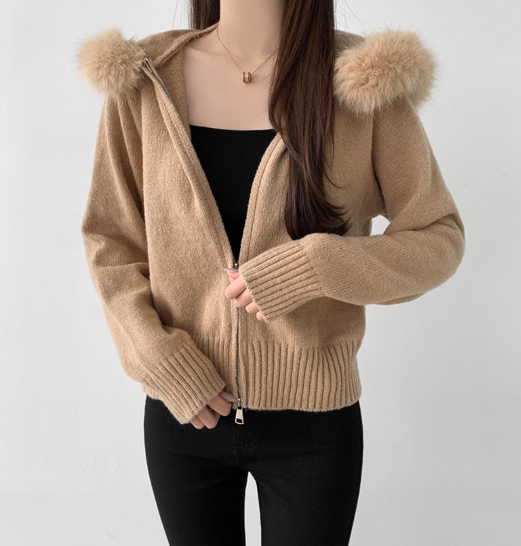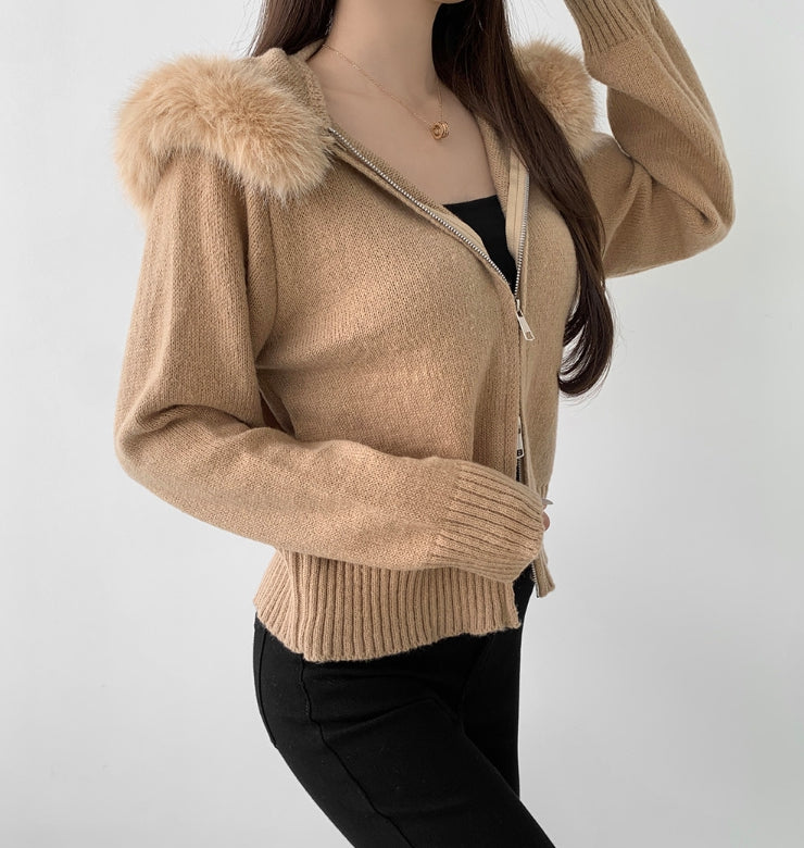 Two-Way Fur Hood Slim Fit Knit Zip-Up