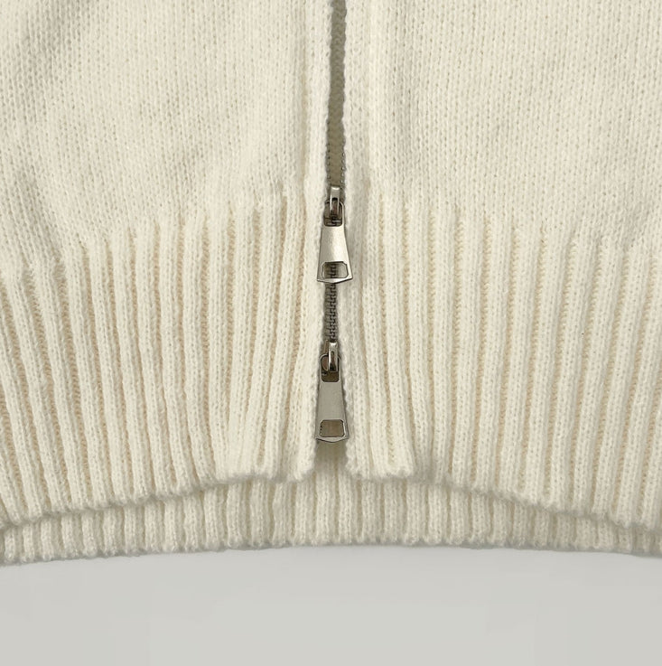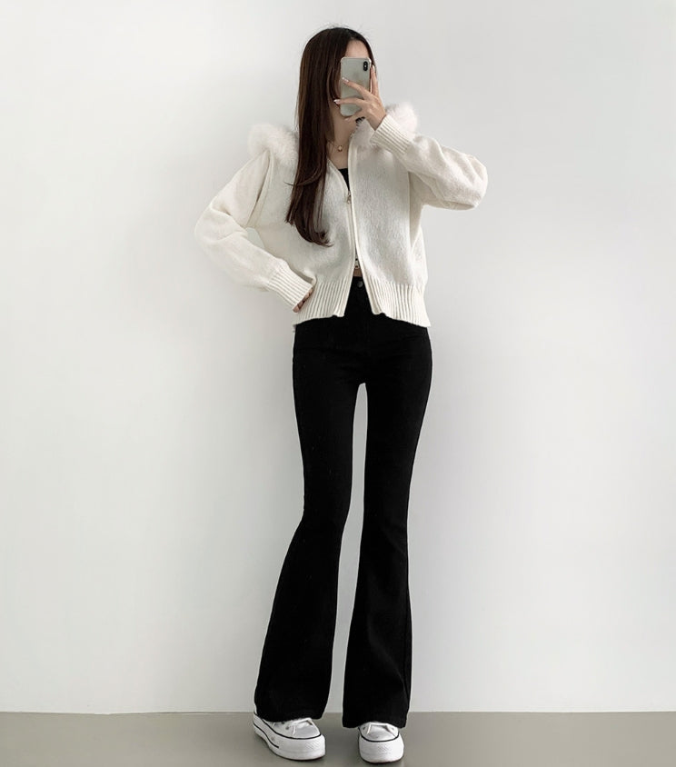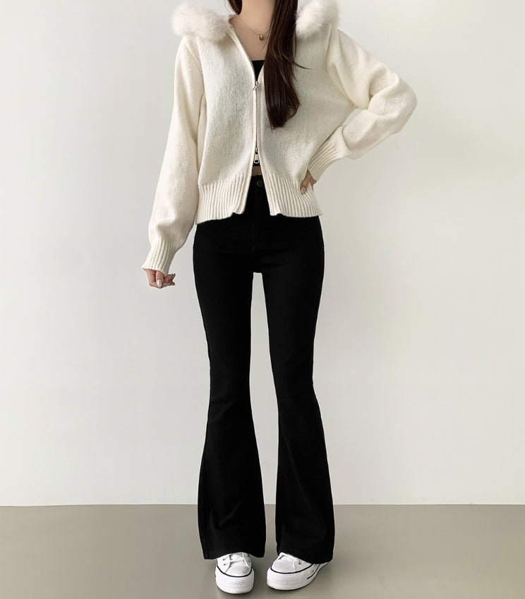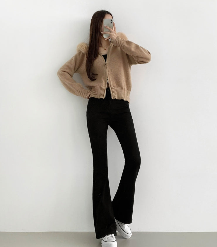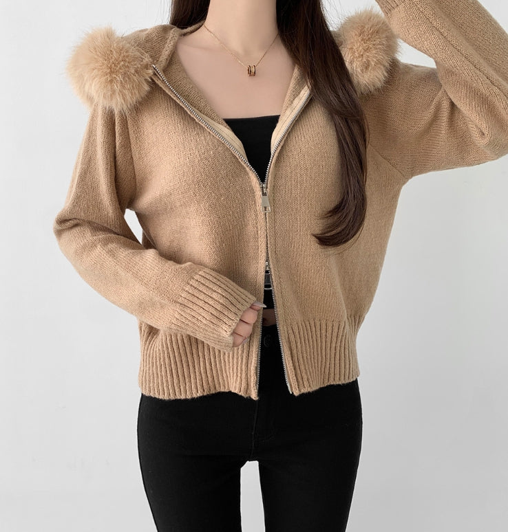 Two-Way Fur Hood Slim Fit Knit Zip-Up