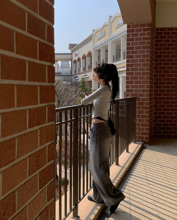 キャナーブラックデニムウォッシュ加工ワイドデニムパンツ