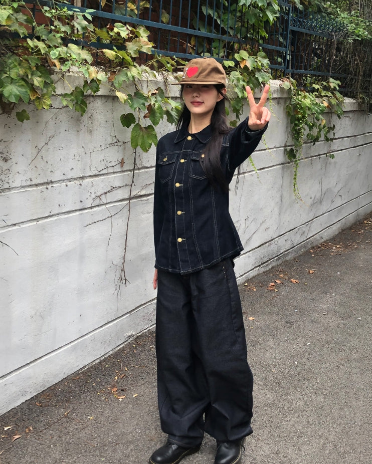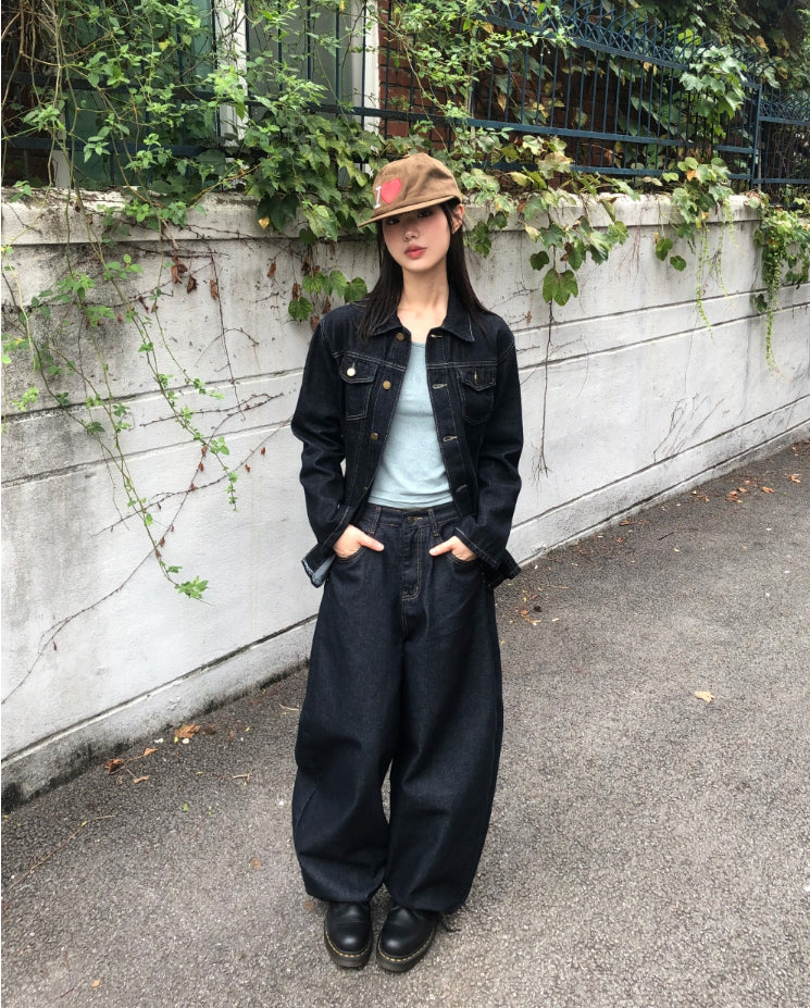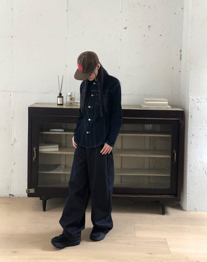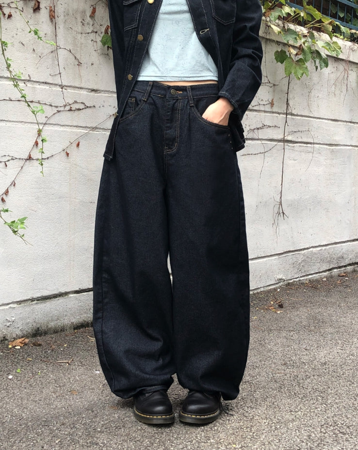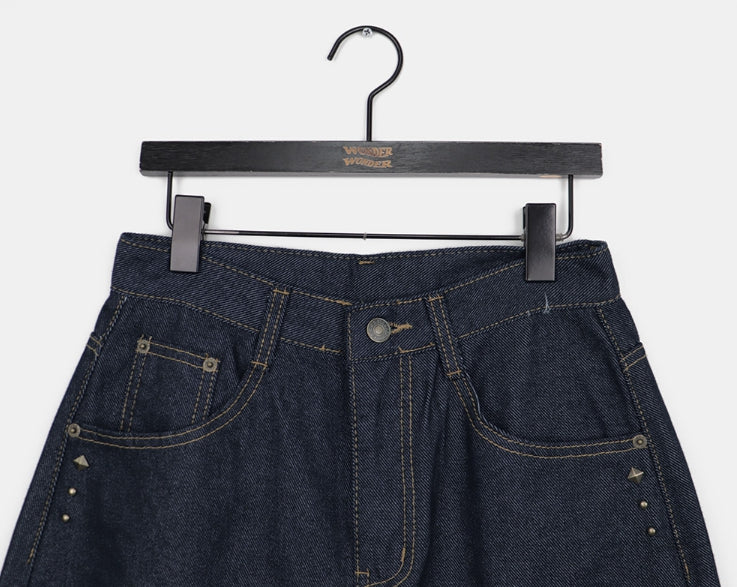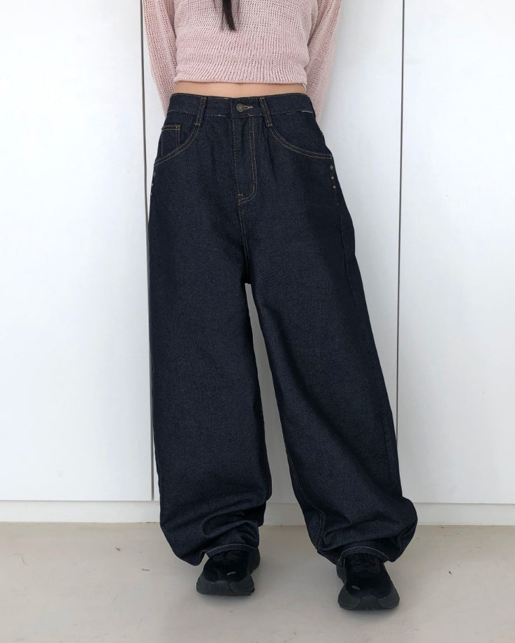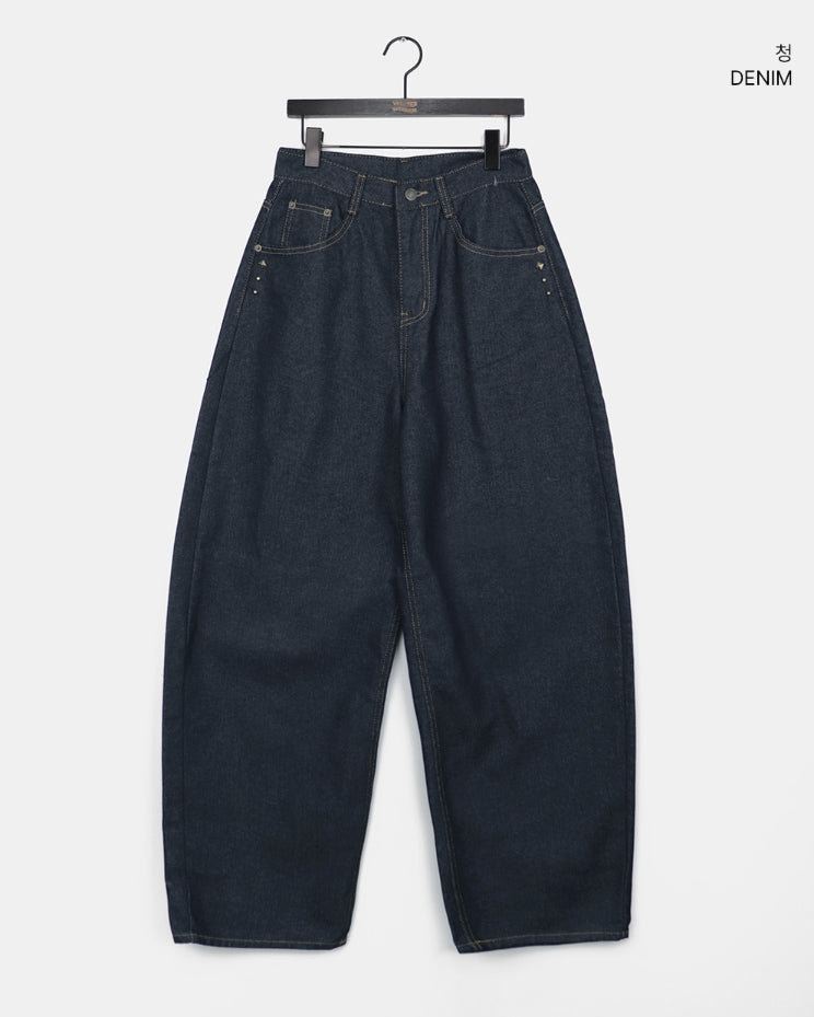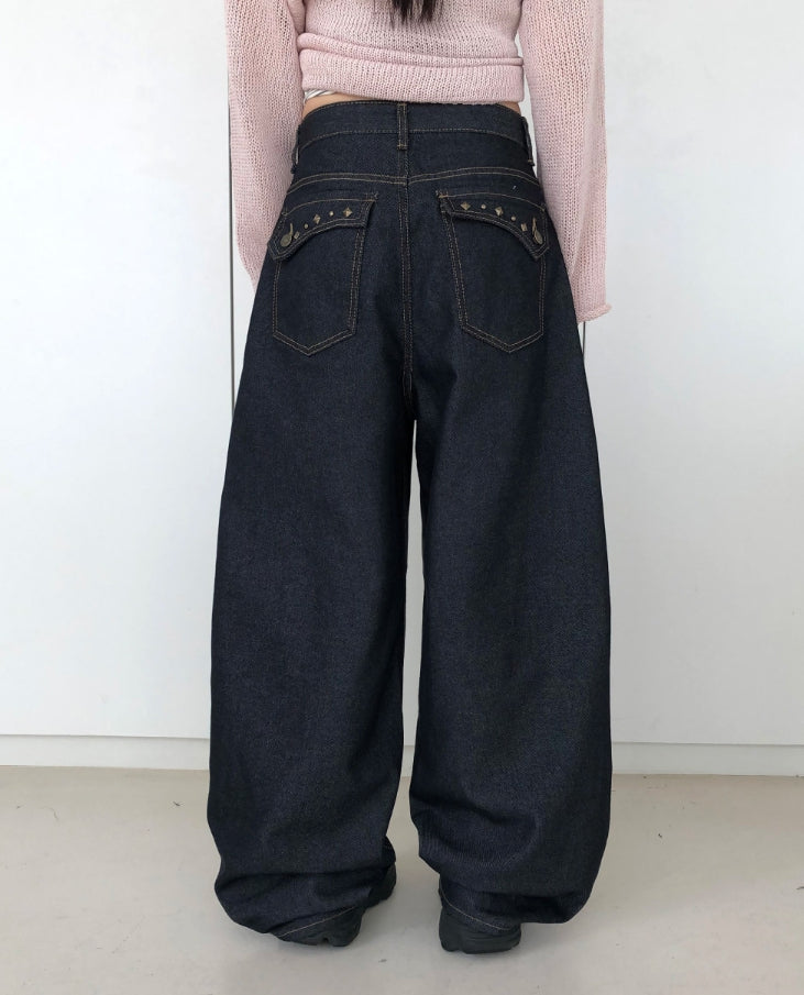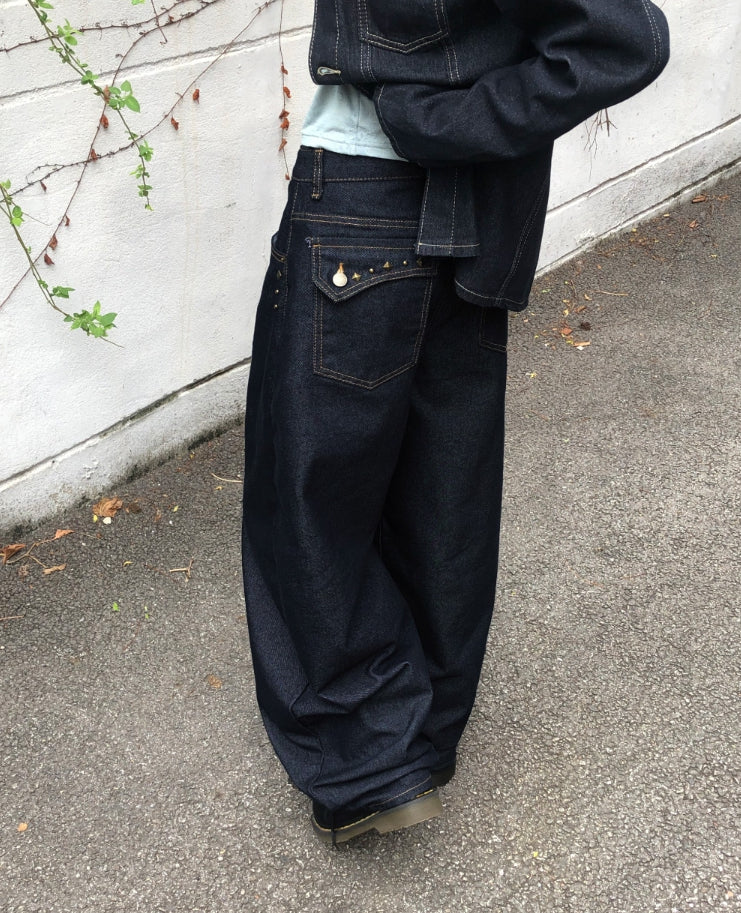 DB Studded Chin Pocket Balloon Fit Wide Denim Long Pants