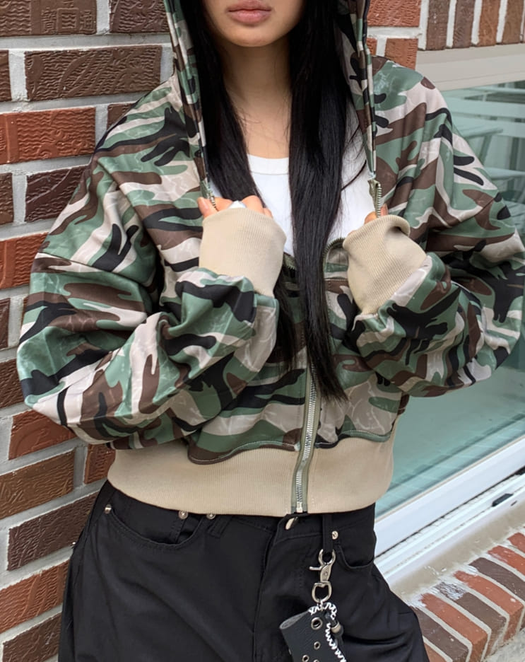 E-Ring Military Camo Pocket Crop Long Sleeve Hooded Zip-Up