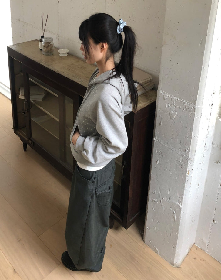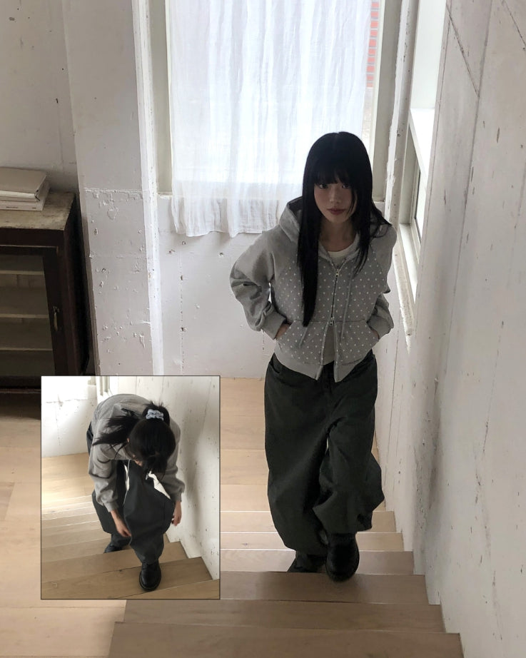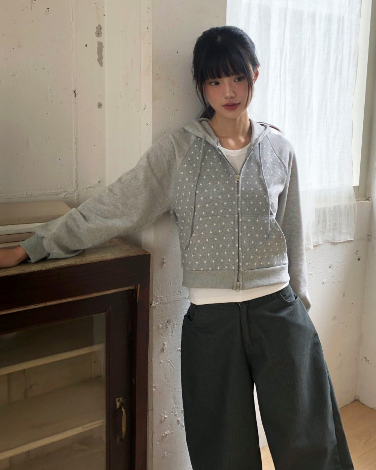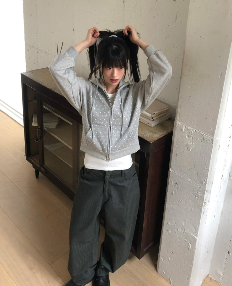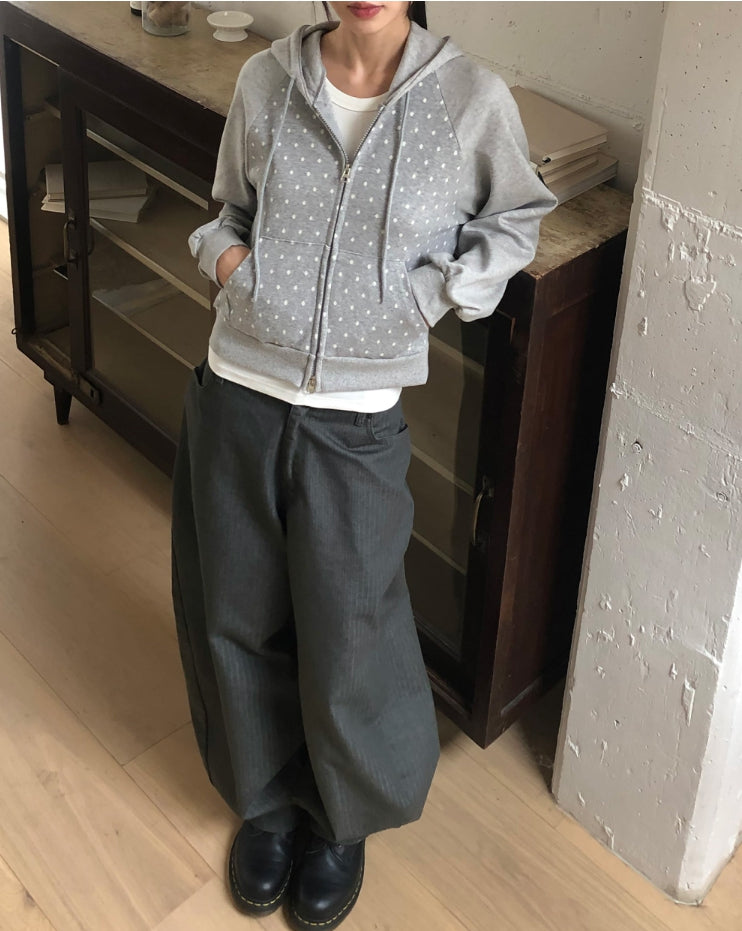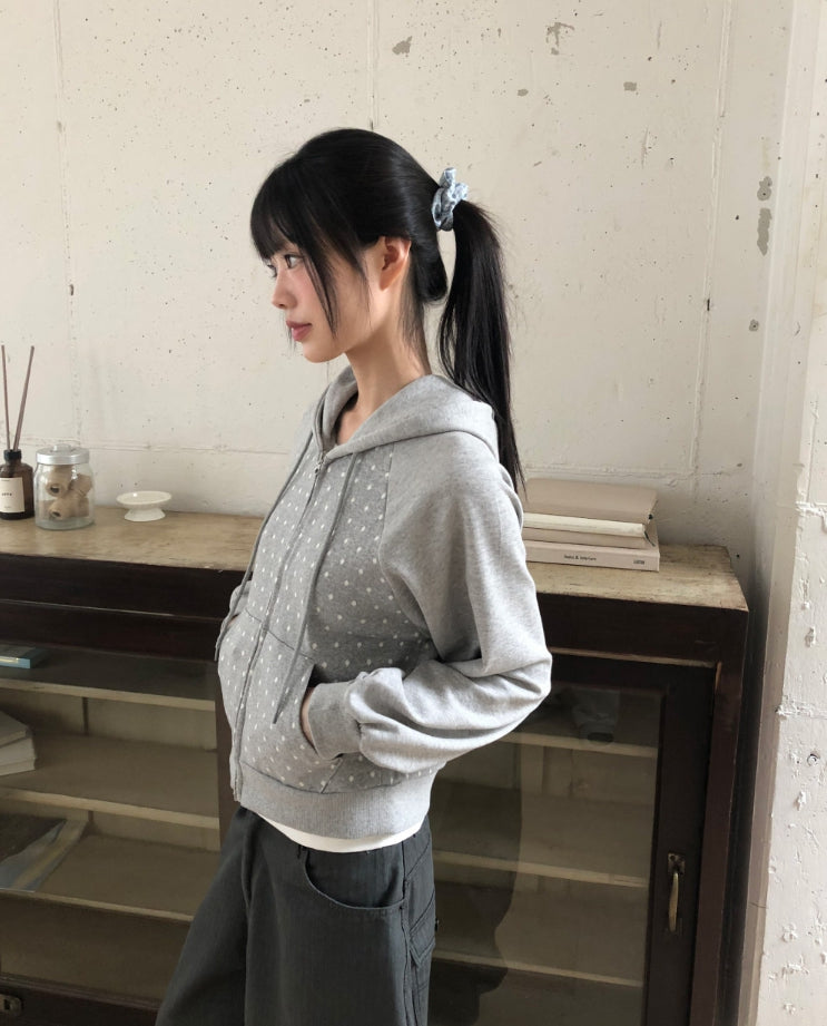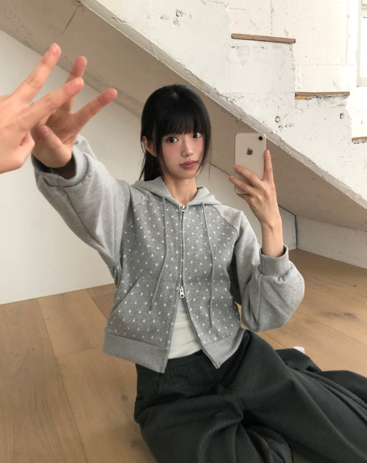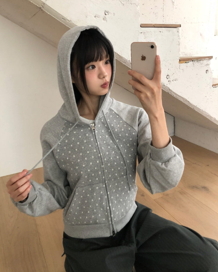 Himer dot nagrang two-way zipper long-sleeved hooded zip-up