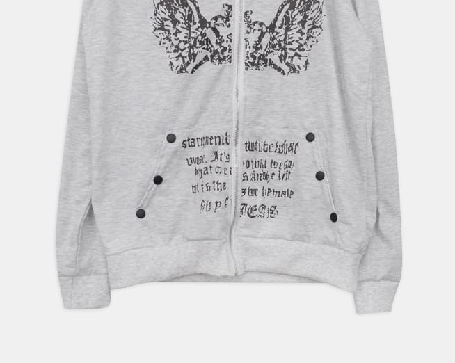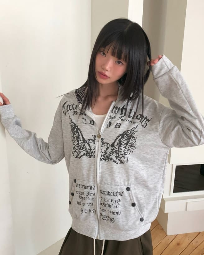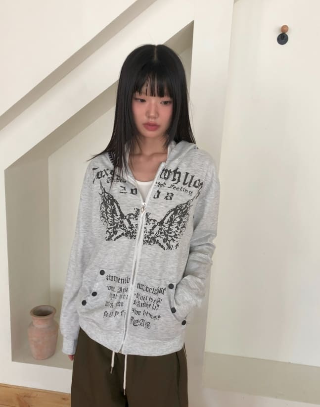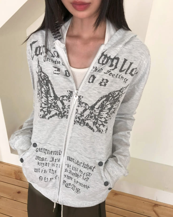 ヒュムスレタリングプリントボーダーカラースナップボタン長袖フードジップアップ