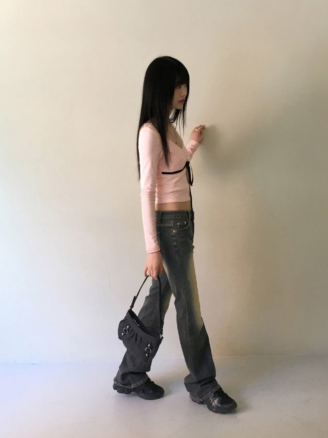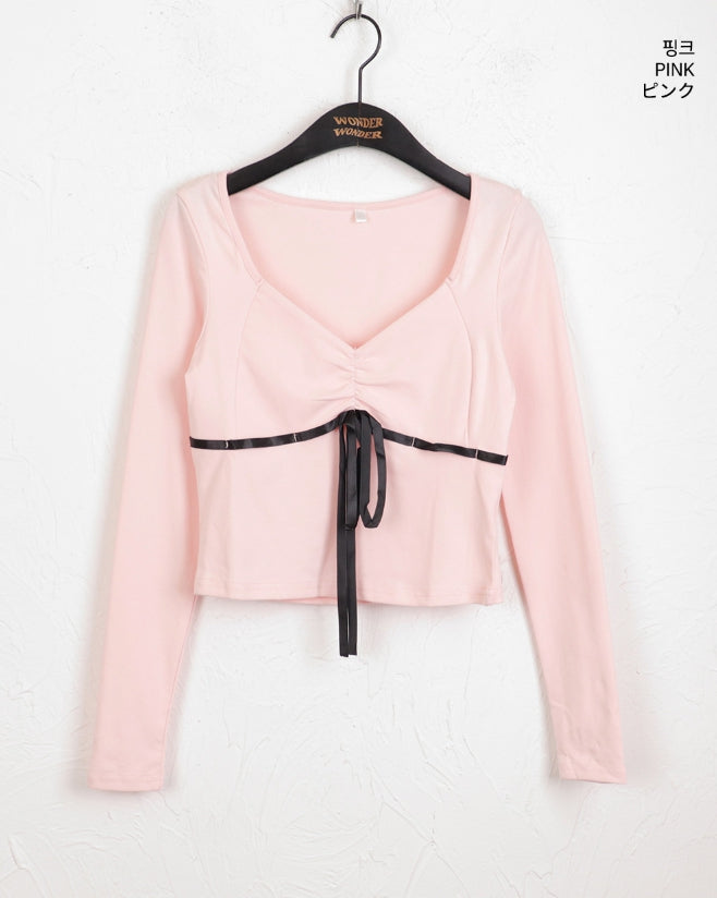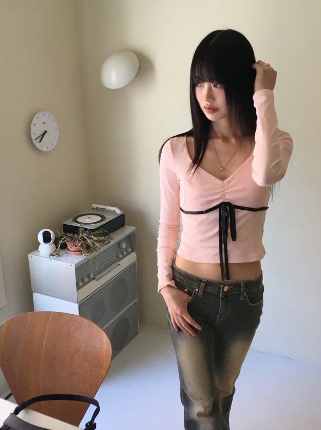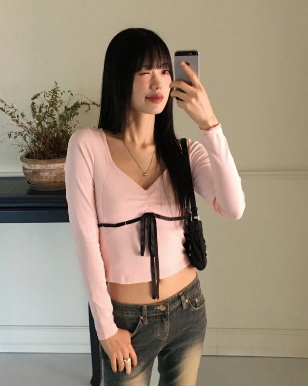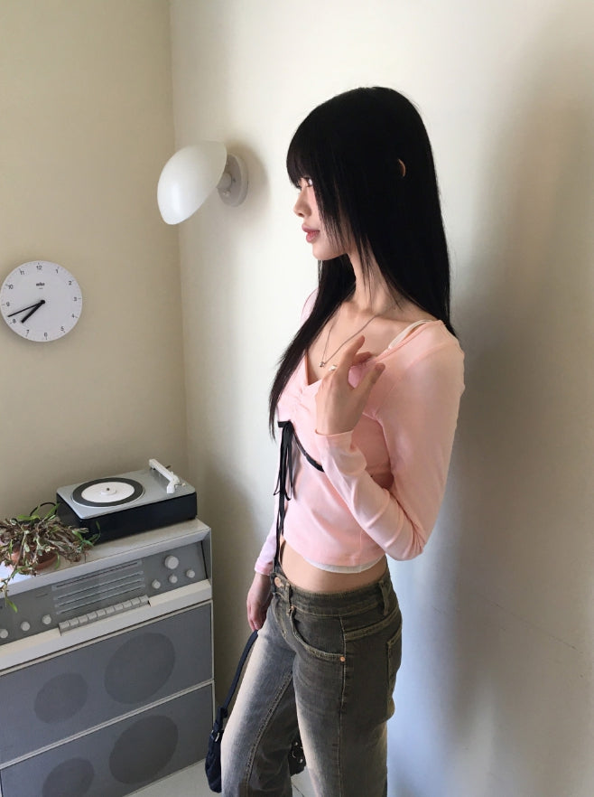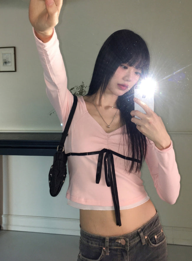 Luer Balletcore Ribbon Color Matching Heart Neck Long Sleeved T-Shirt