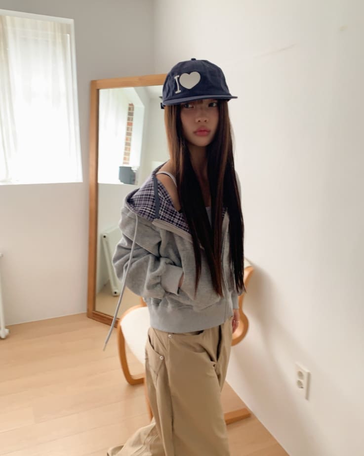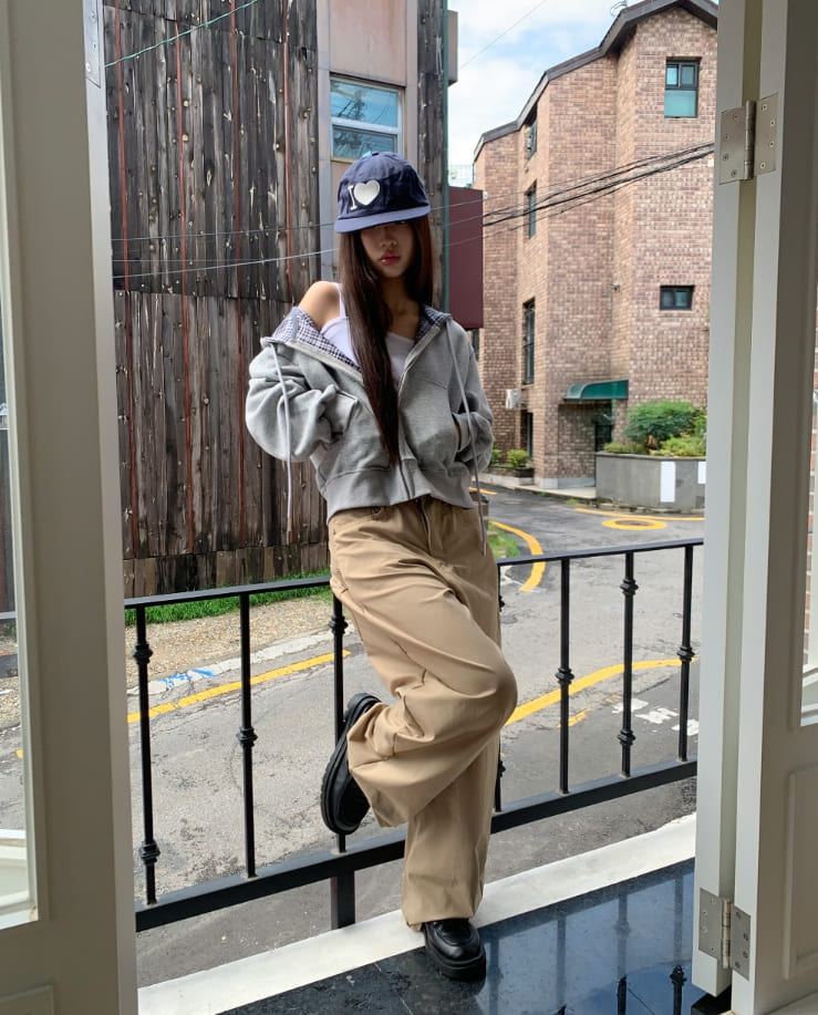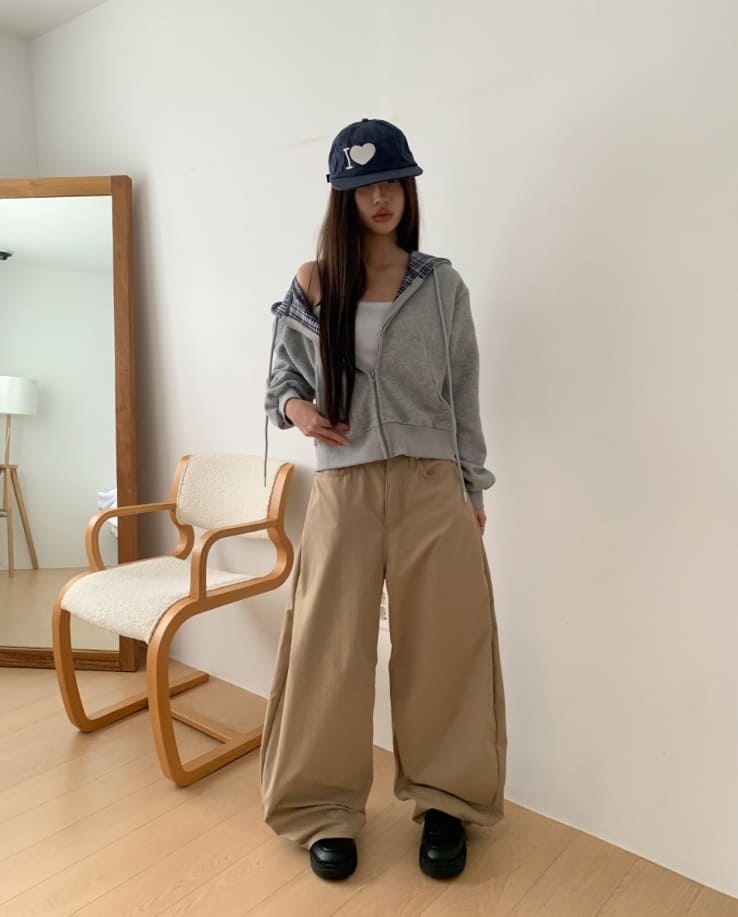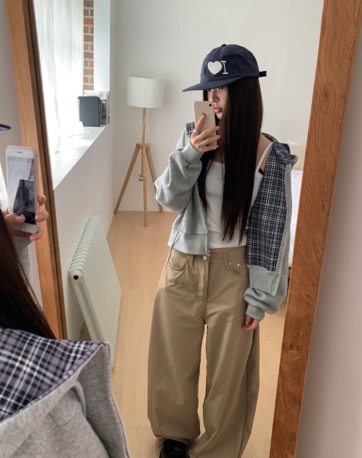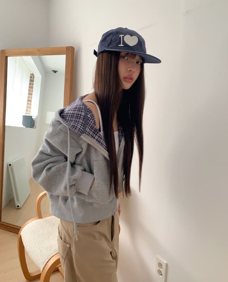 Mechi check color matching long sleeve hood zip-up