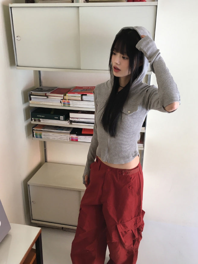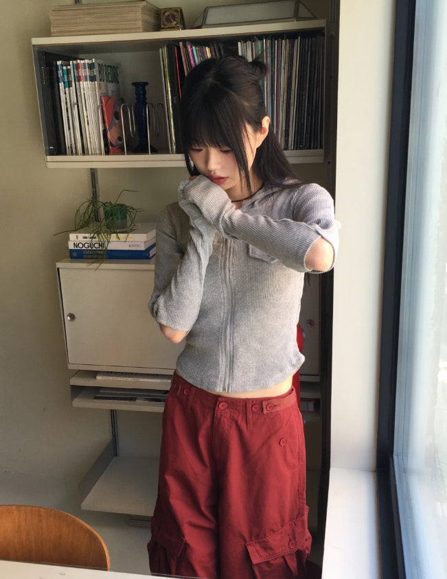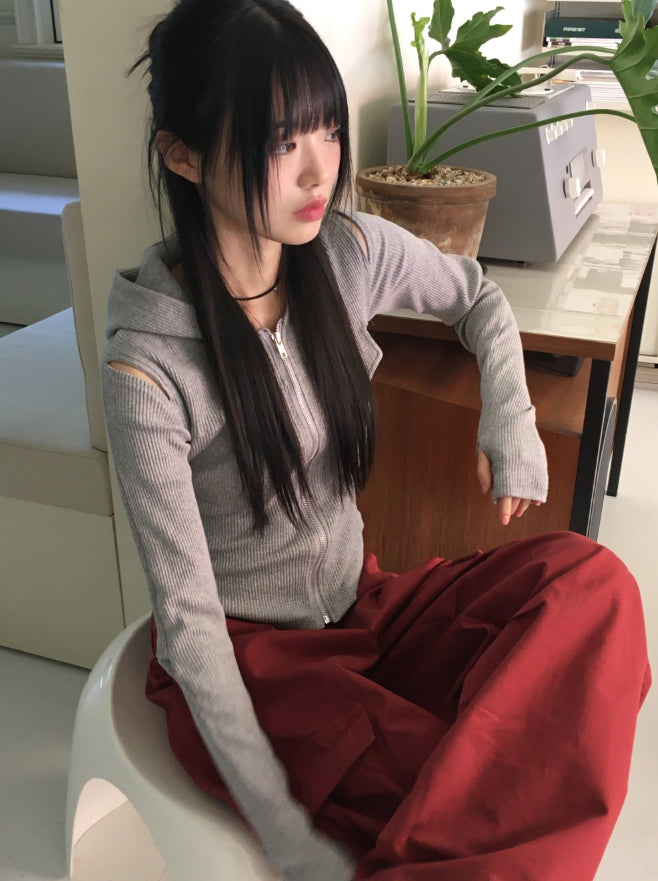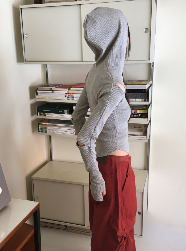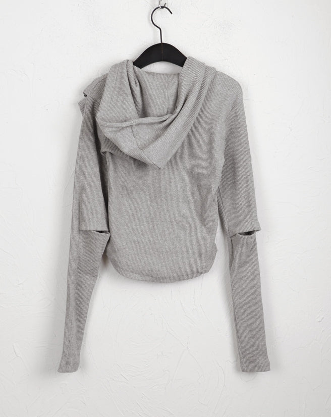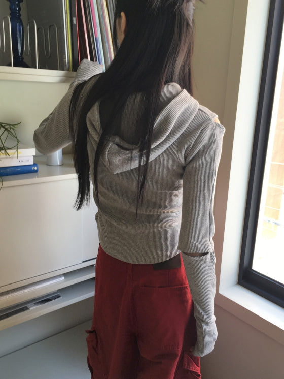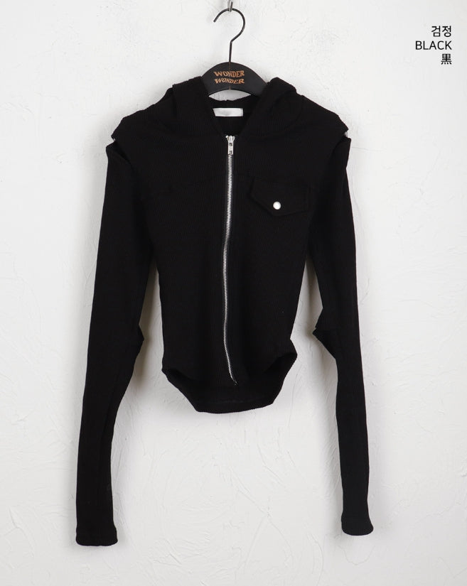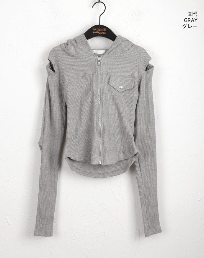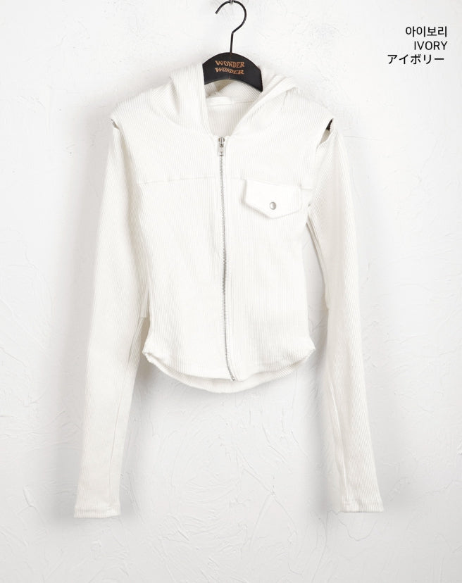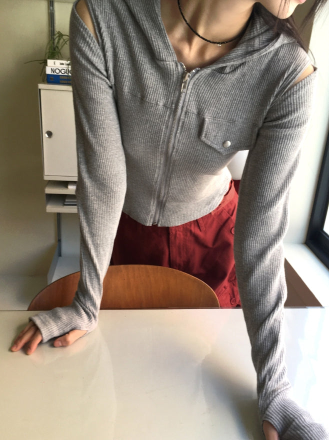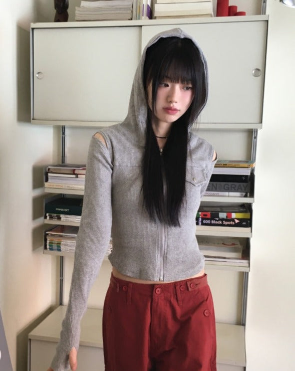 Mund shoulder sleeve slit cutout warmer ribbed hood zip-up