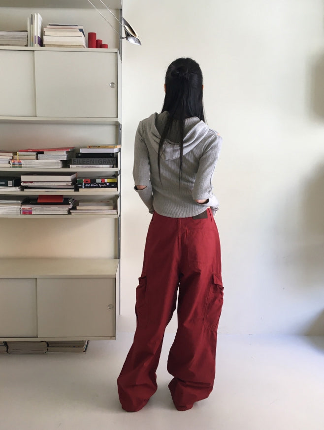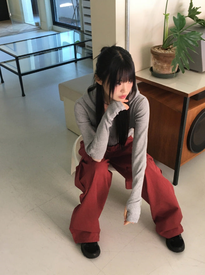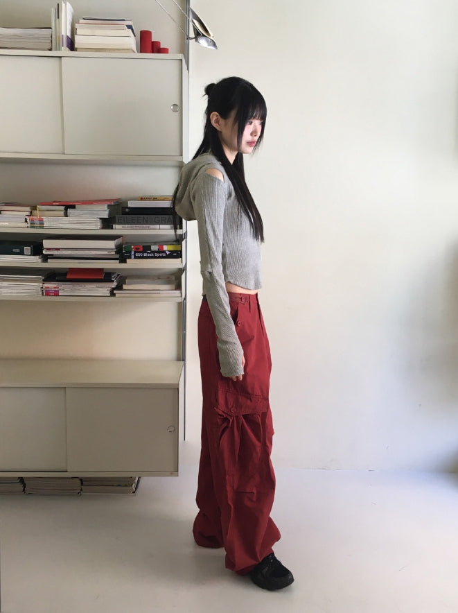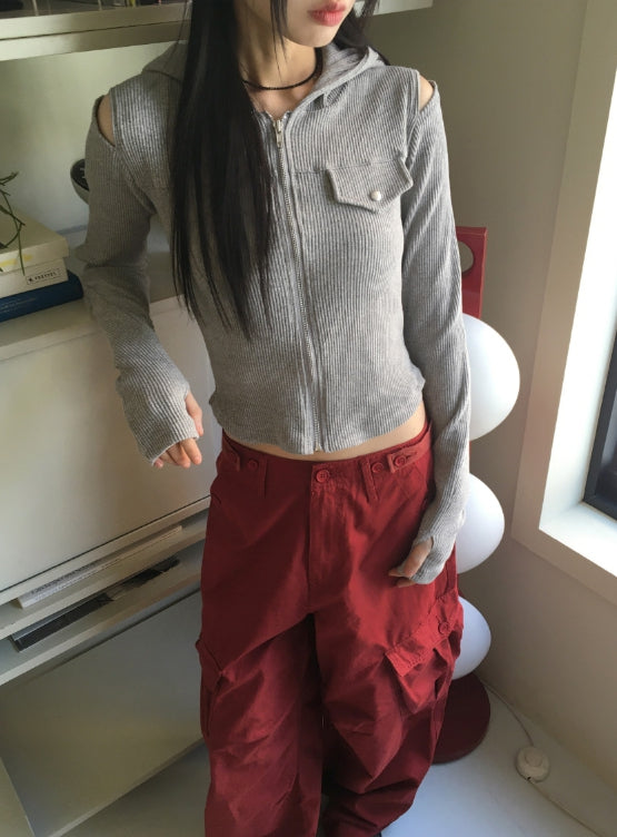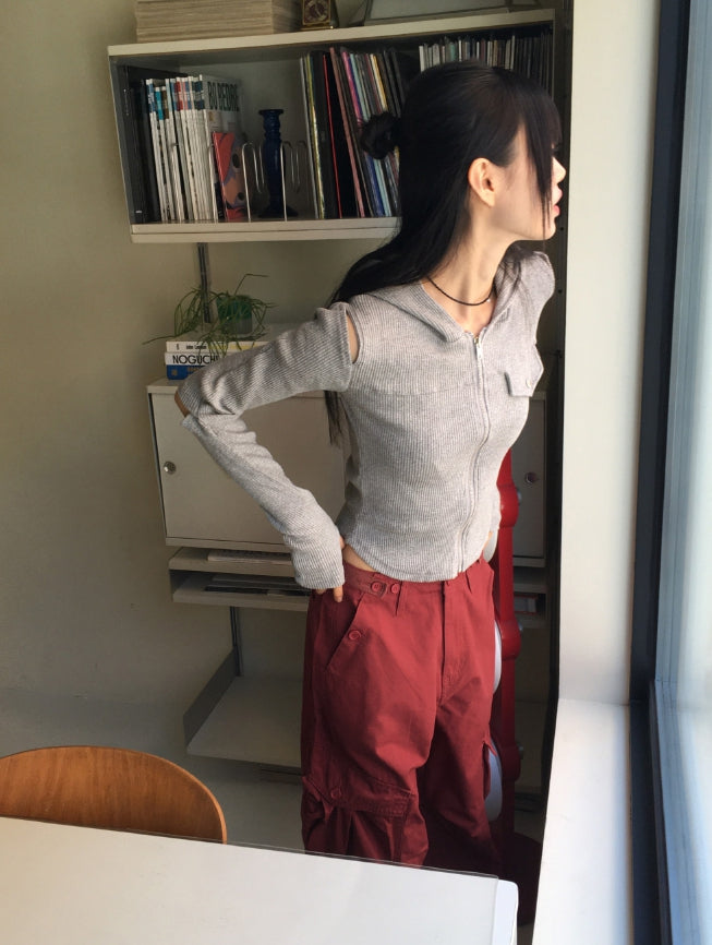 ムンドショルダースリーブスリットカットアウトウォーマーリブフードジップアップ