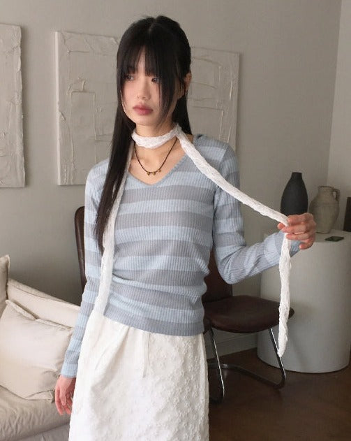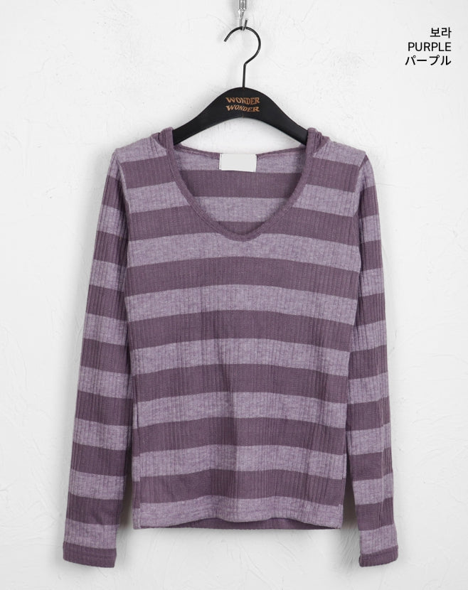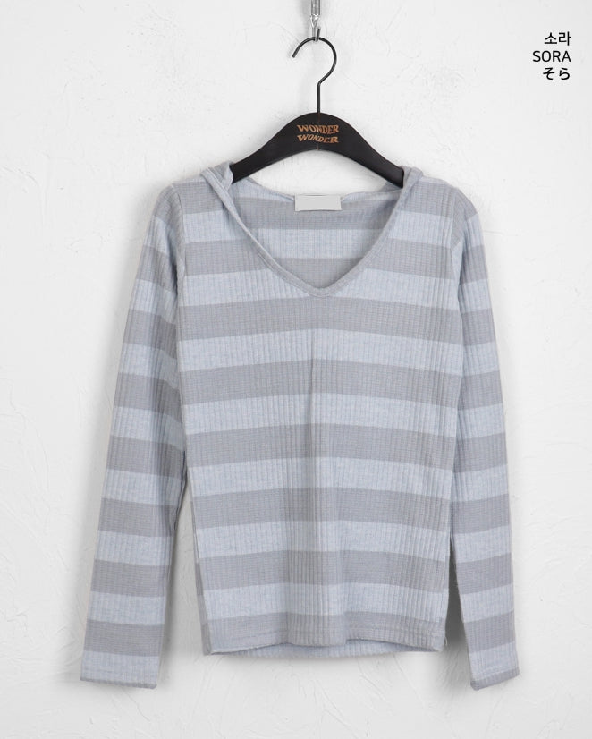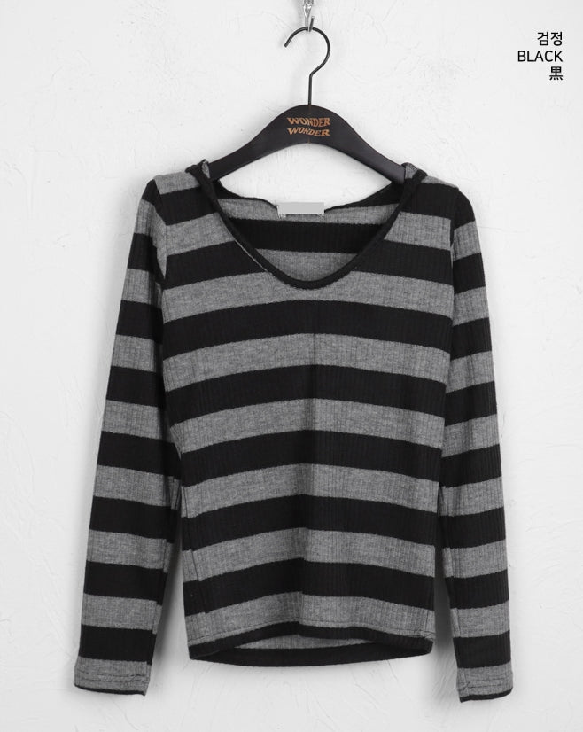 Two-to-Two-Hagara Stripe U-Neck Slim Hooded Long-Sleeved T-Shirt