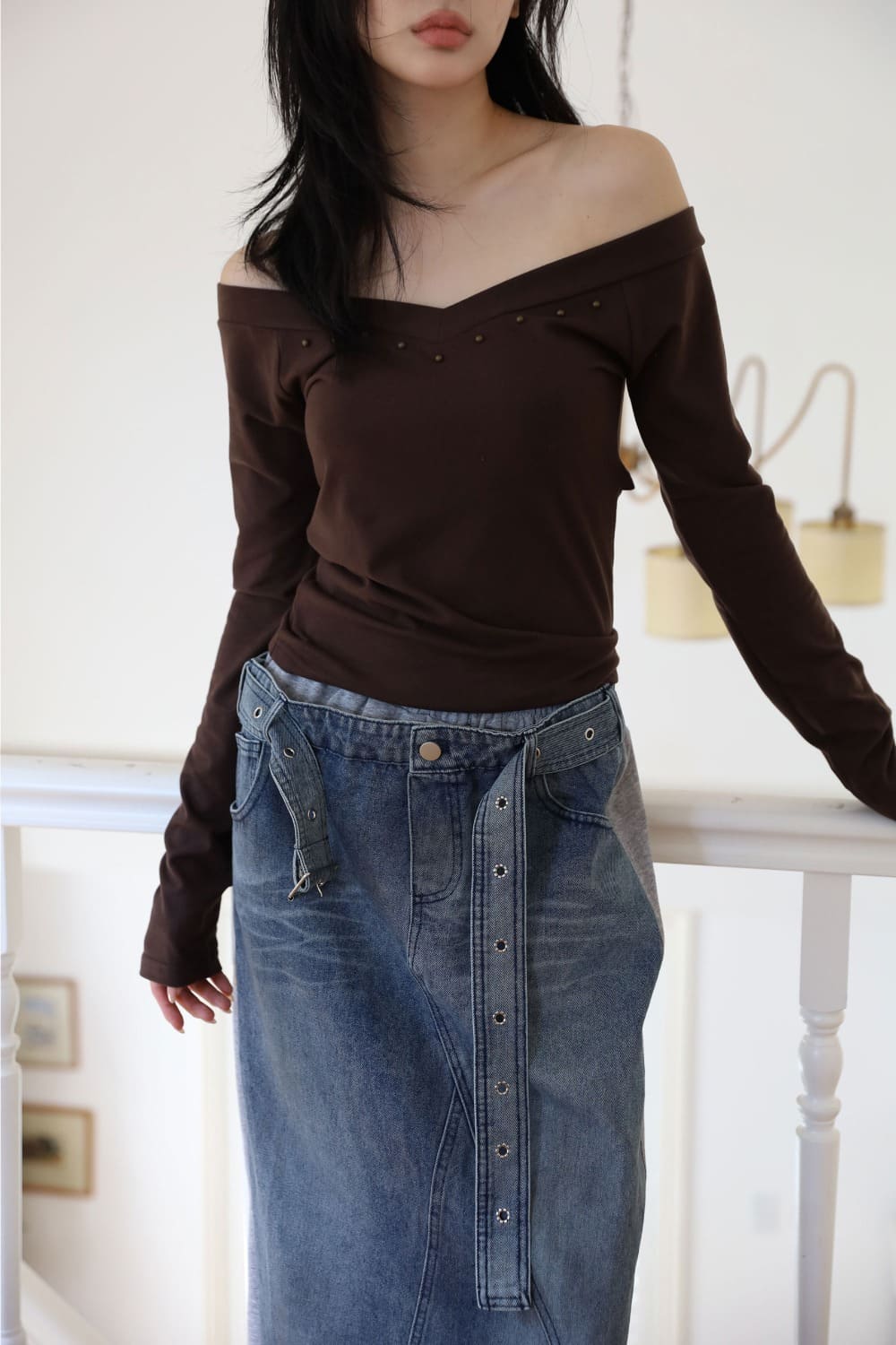 Brushed) Deep V-neck Stud Tee