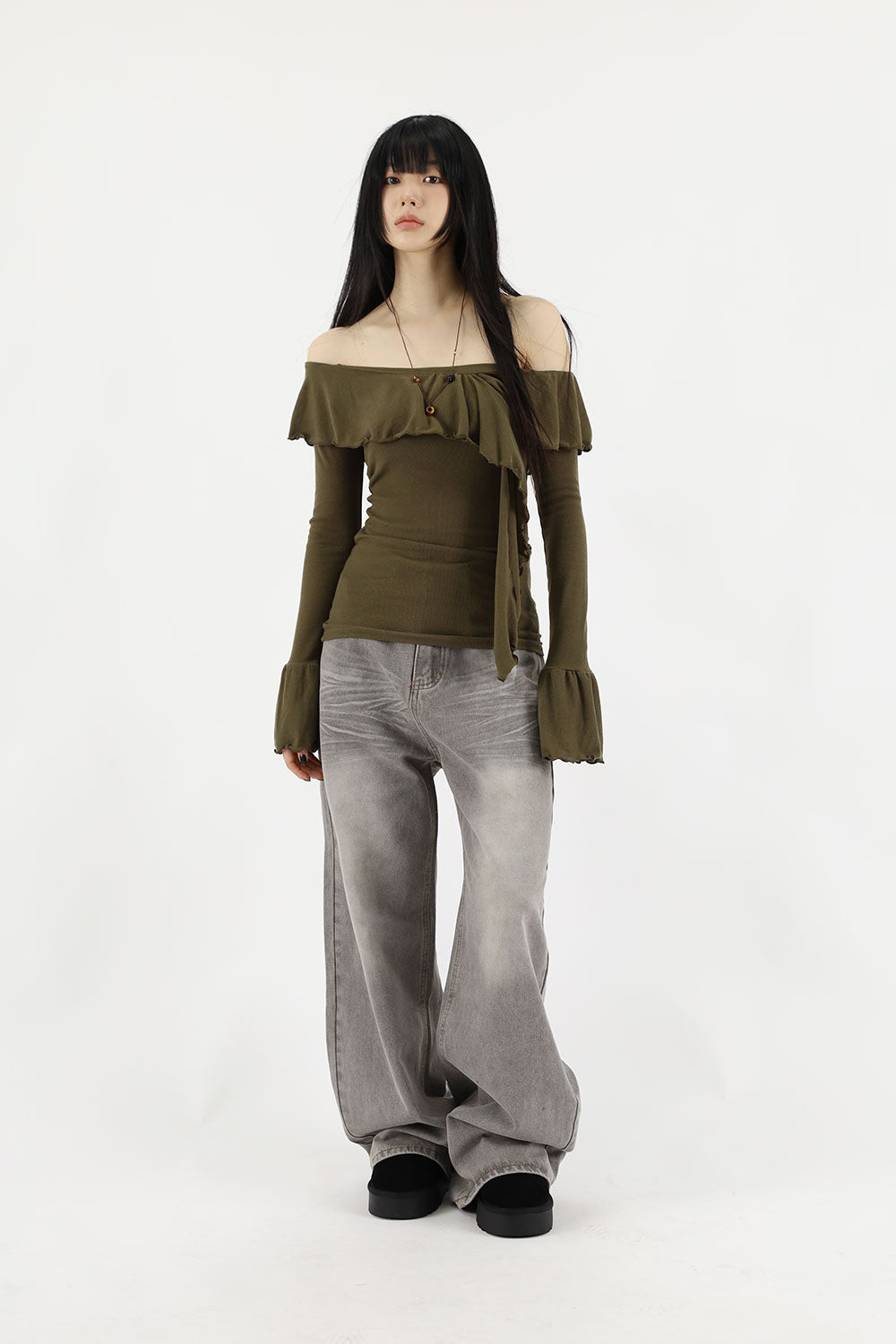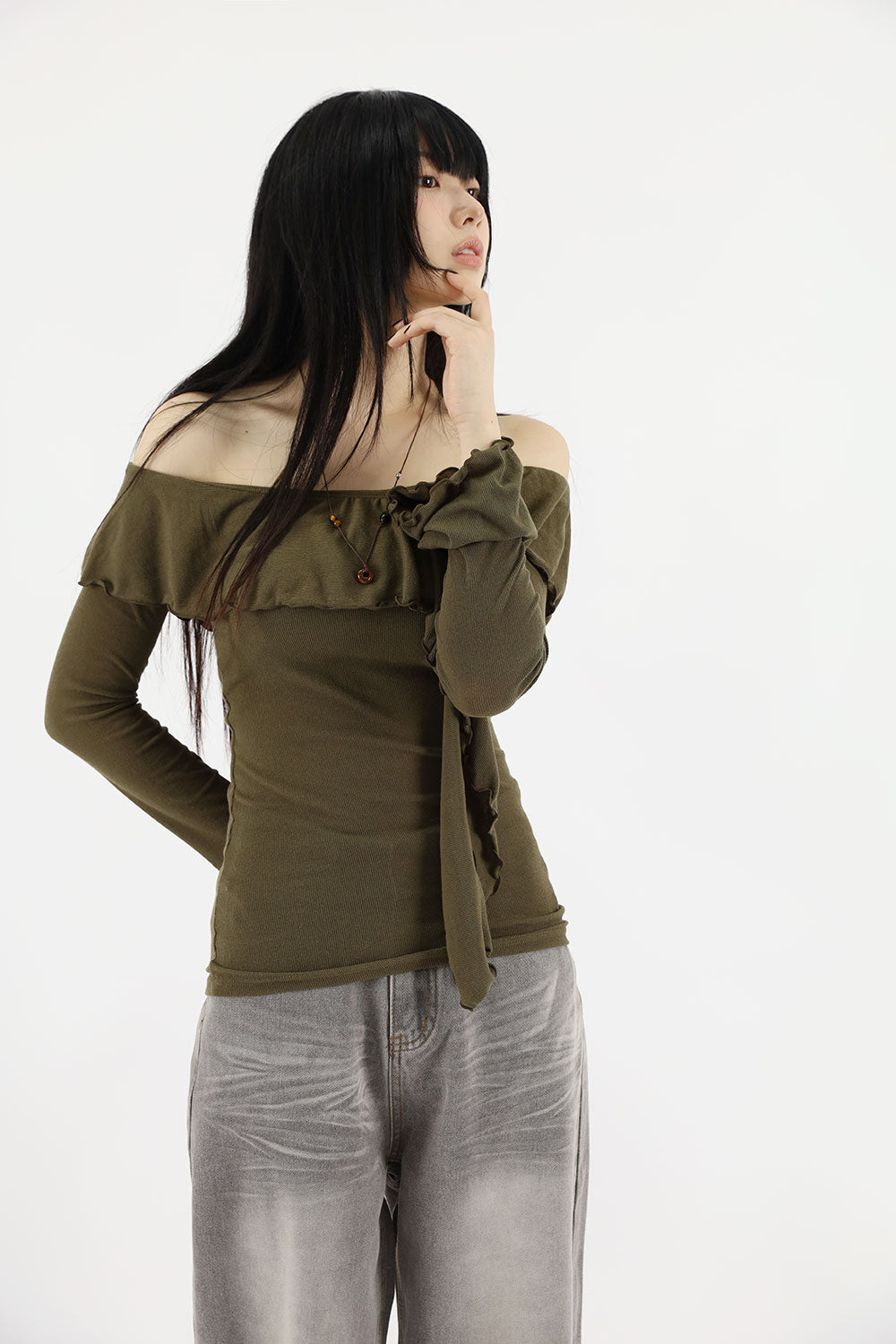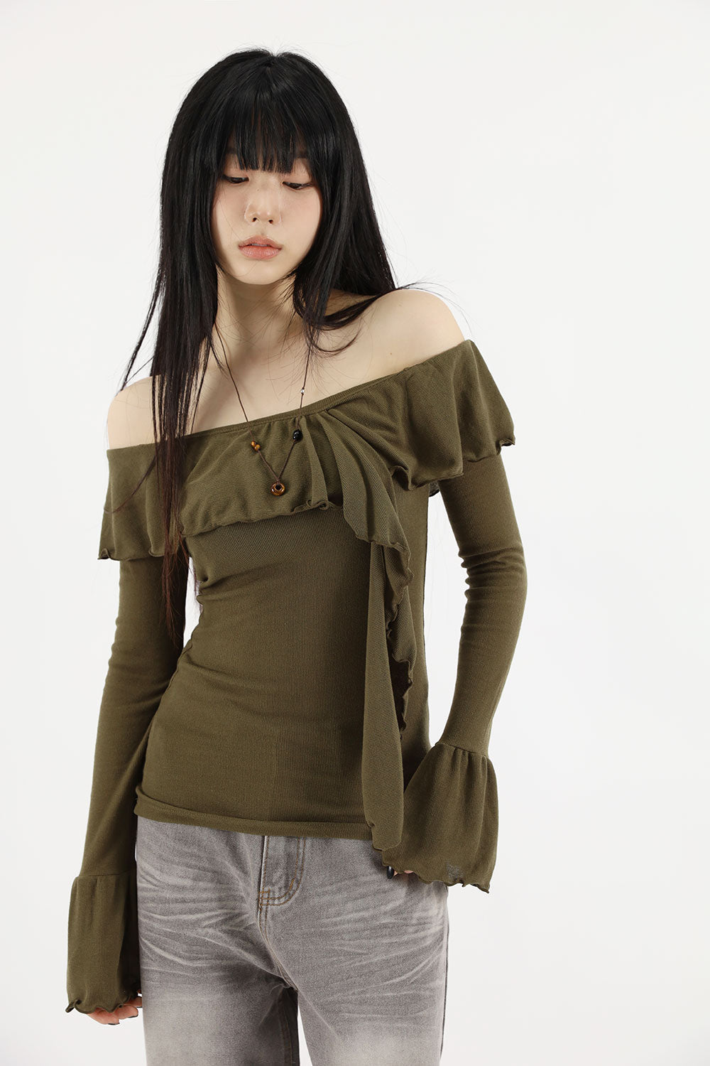 ウェーブラッフルオフショルダーTシャツ