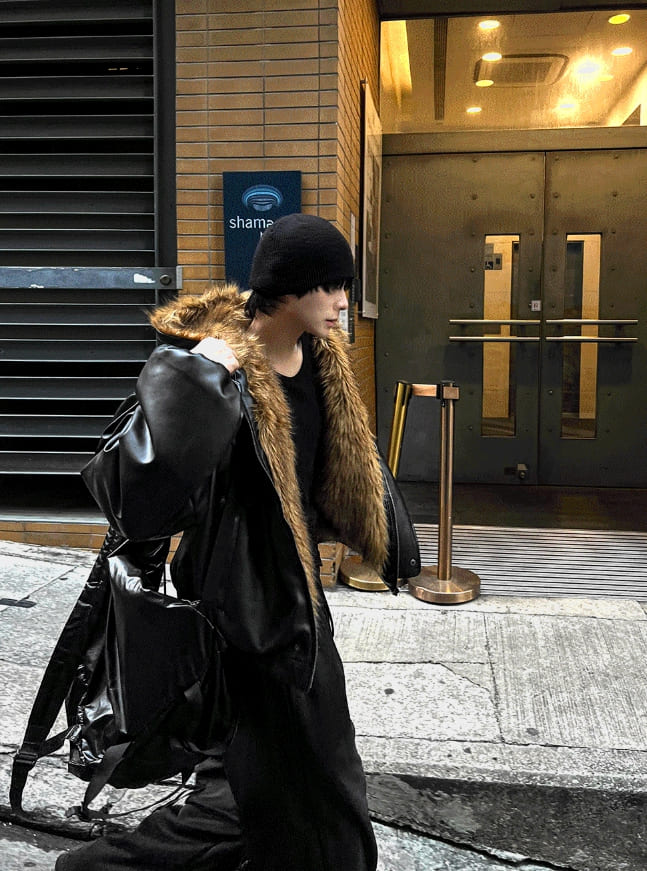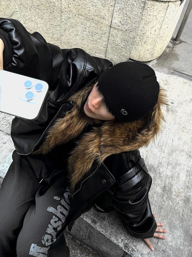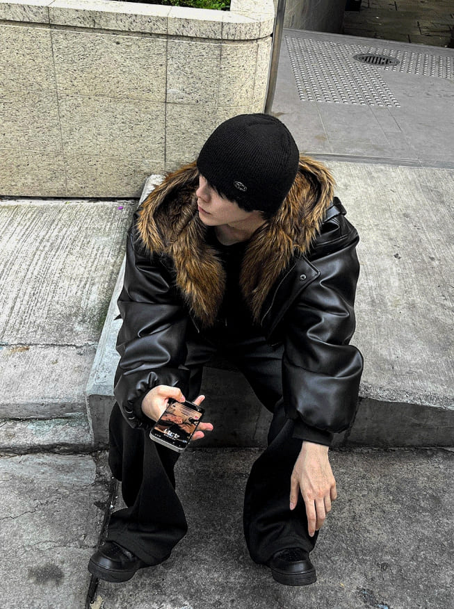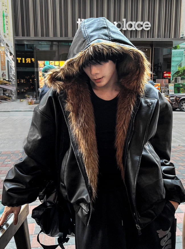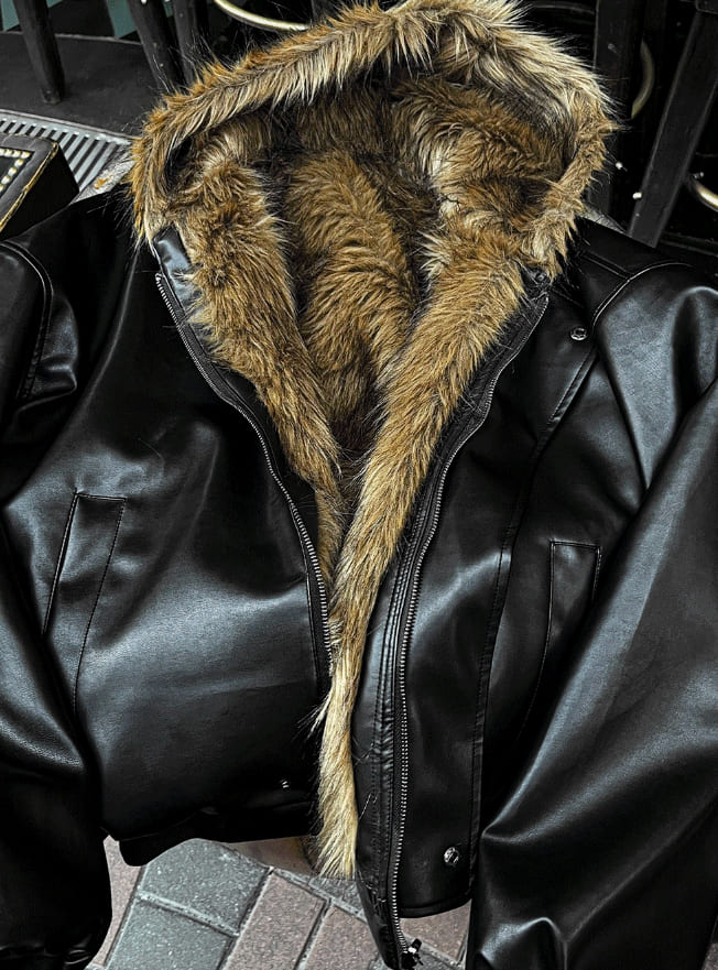 Zeoni Fur Trimming Hood Dark Black Leather Jumper
