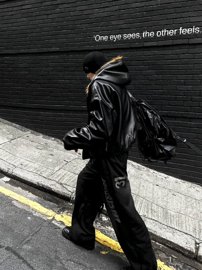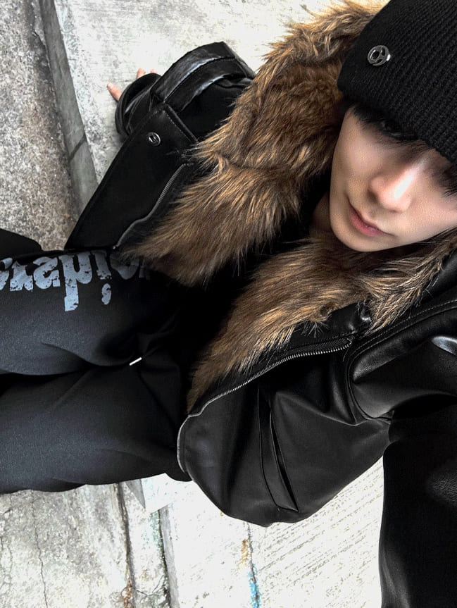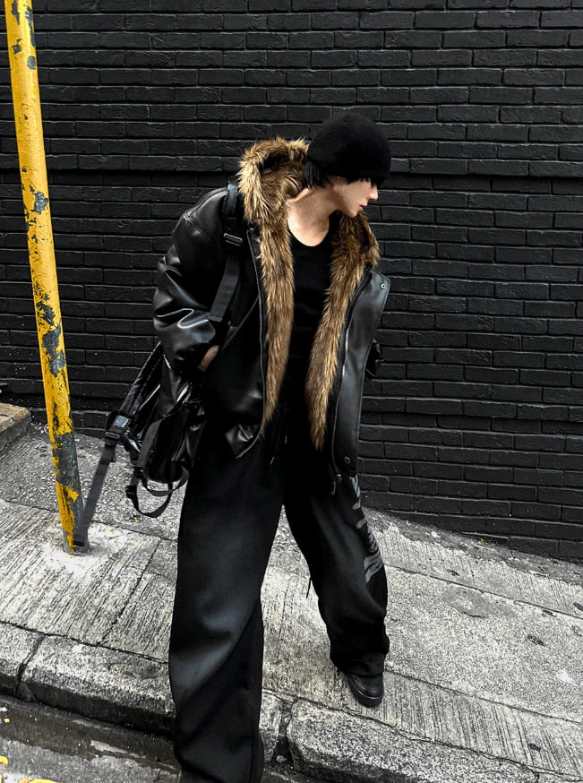 ゼオニファートリミングフードダークブラックレザージャンパー