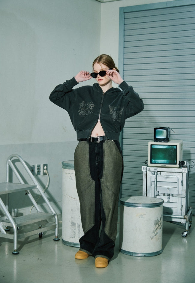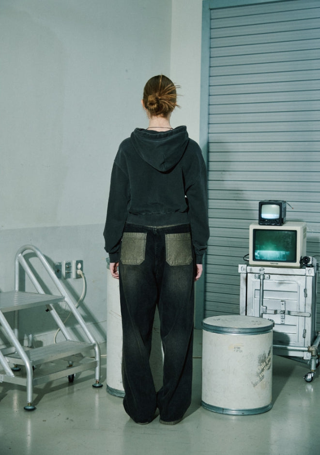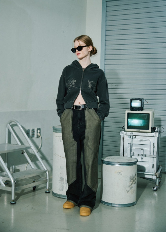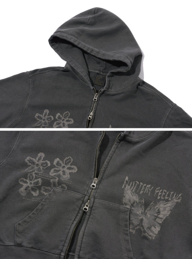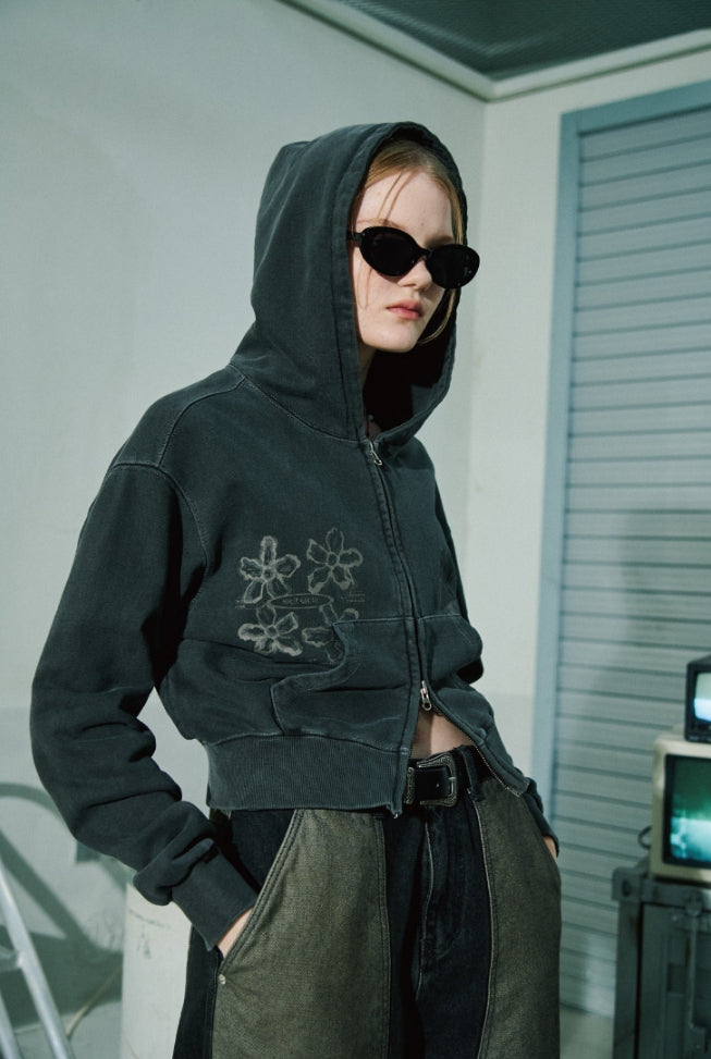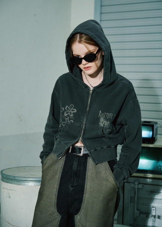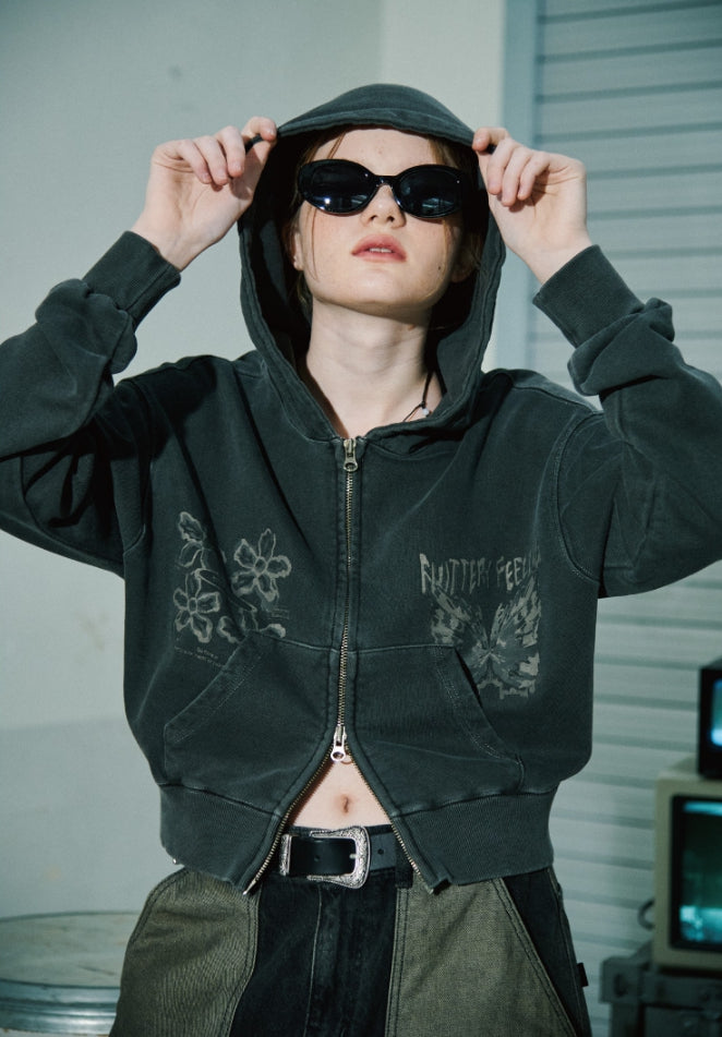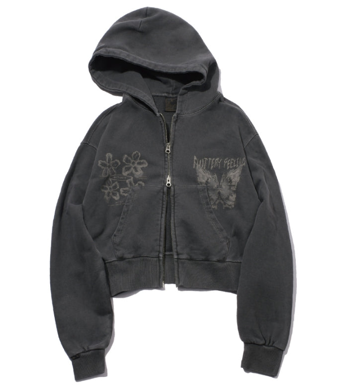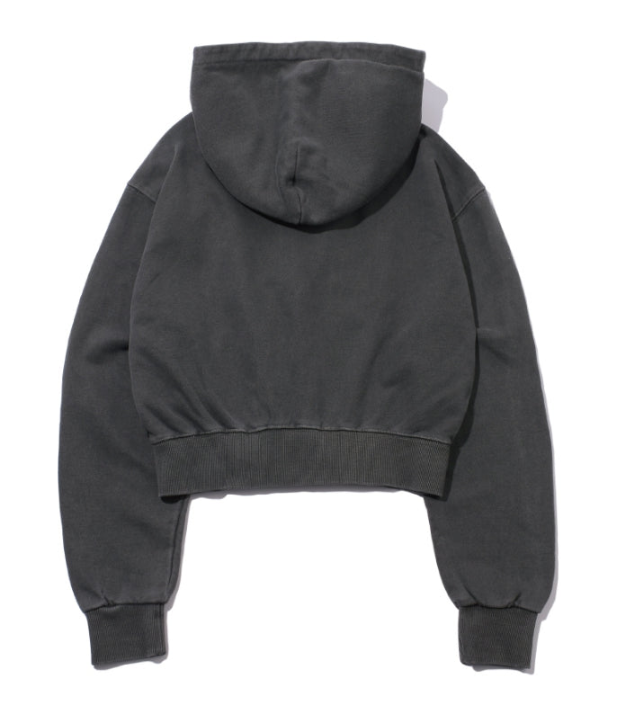 [2-WAY] Fluttery Pigment CROP Hood Zip Up Smoke