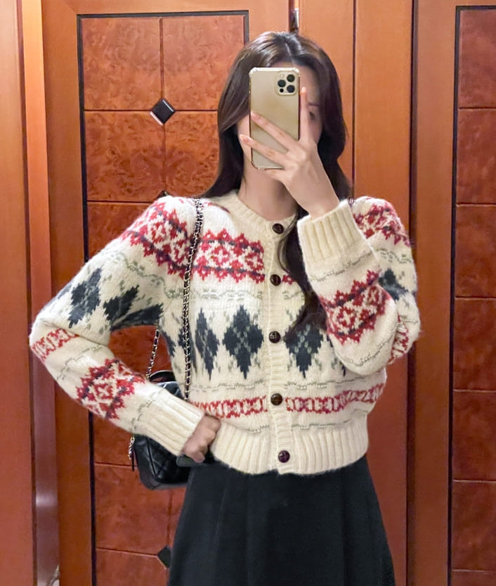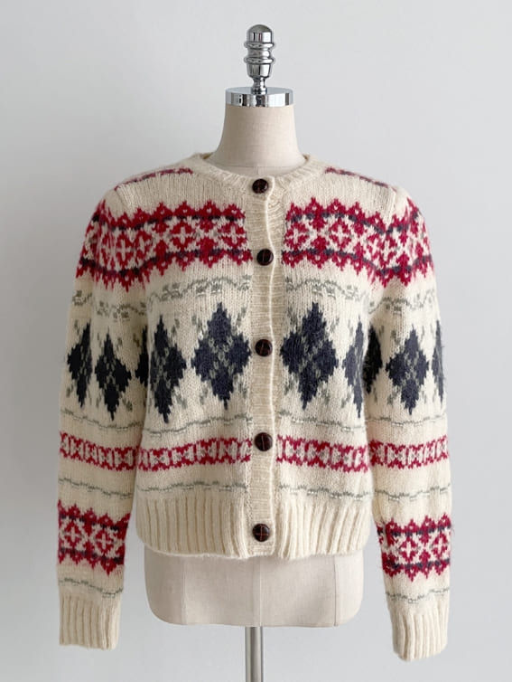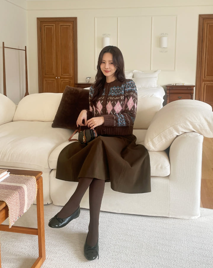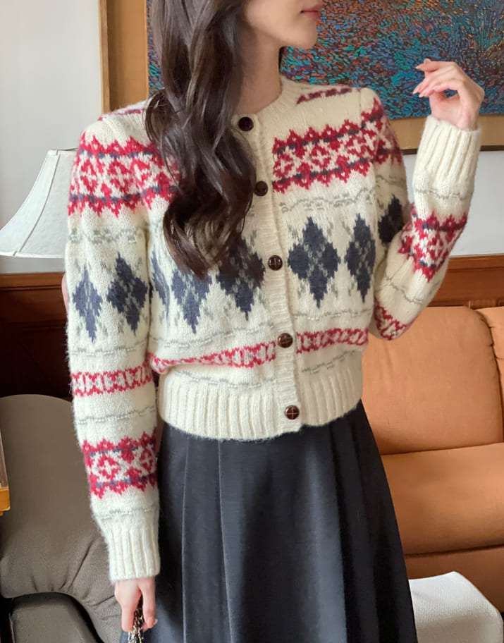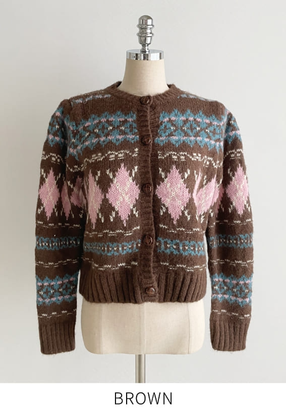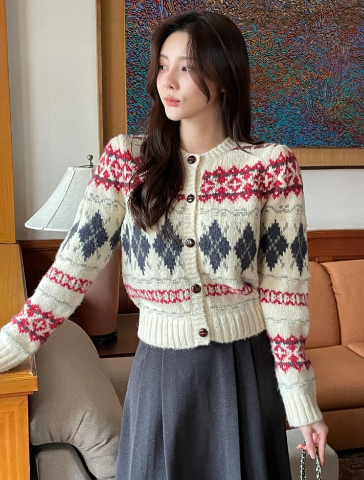 Cren Argyle Puff Knit Cardigan