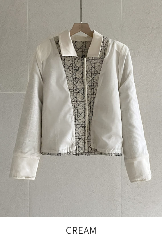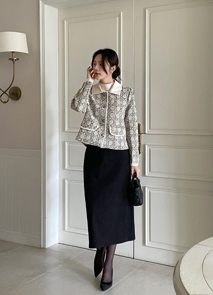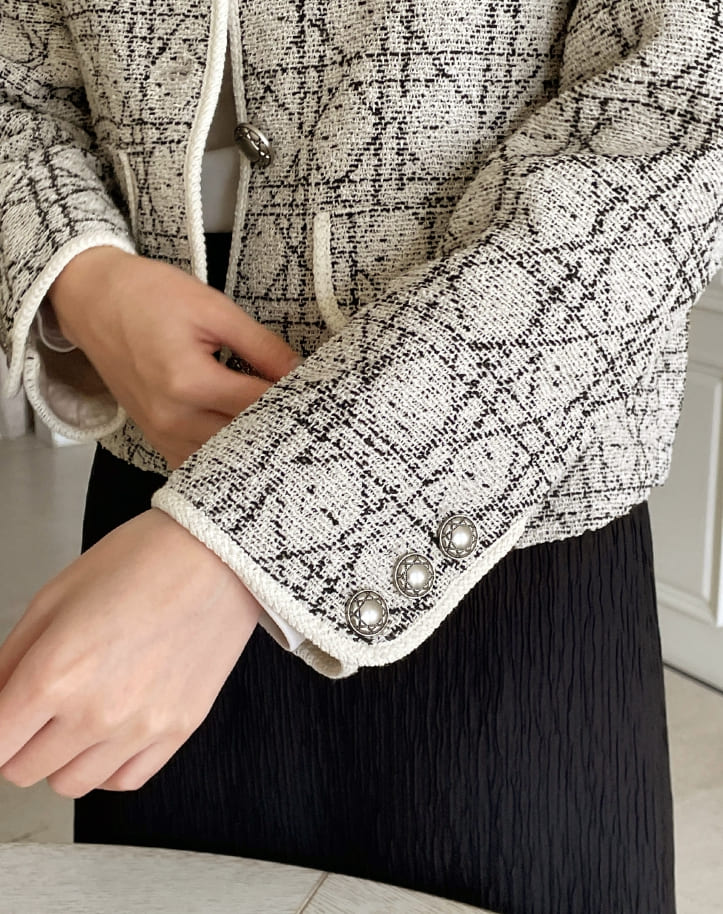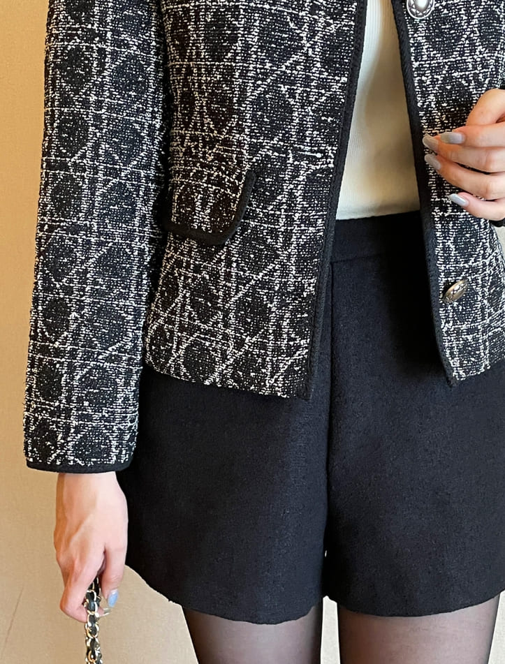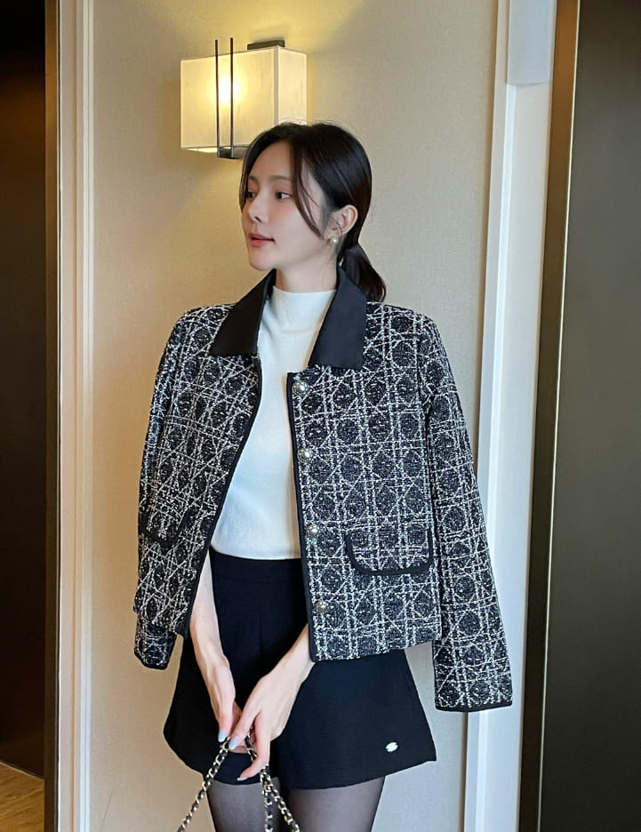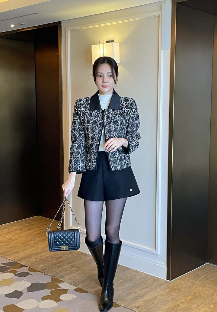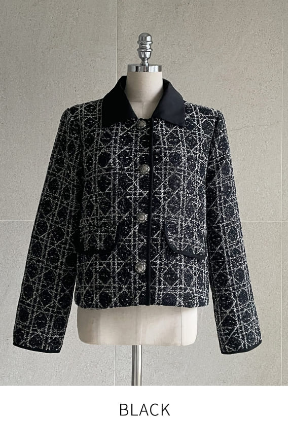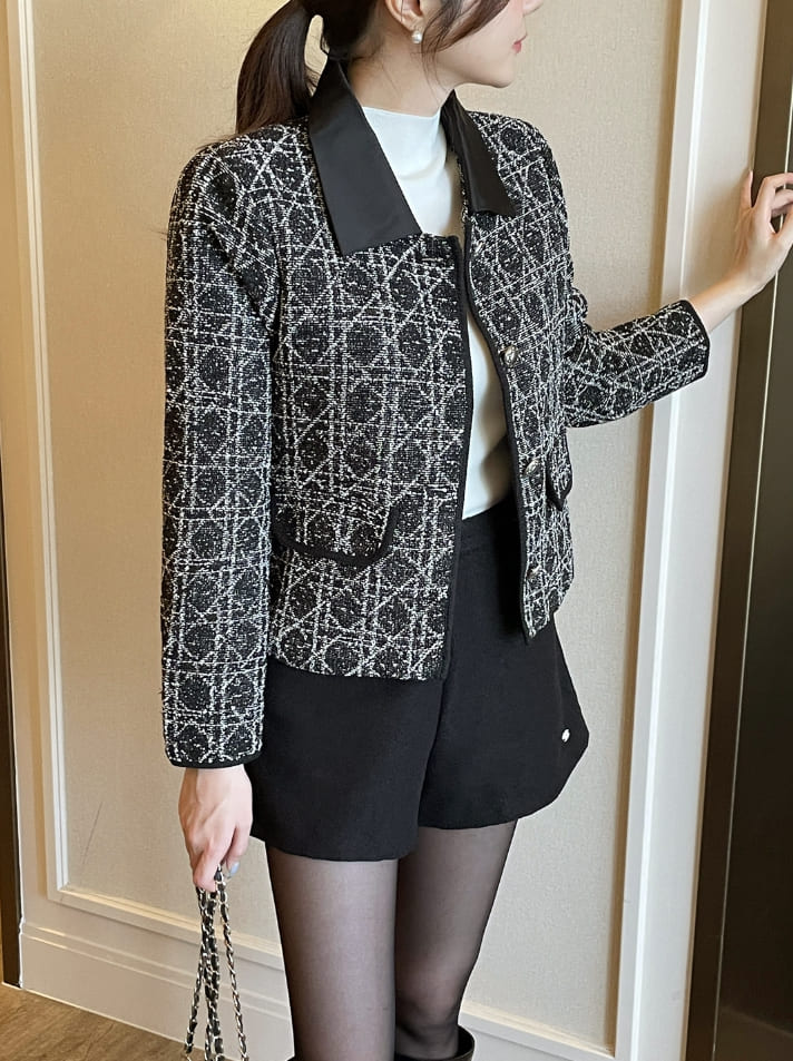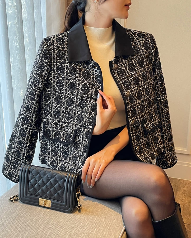 Demur Color Matching Collar Pattern Tweed Short Jacket