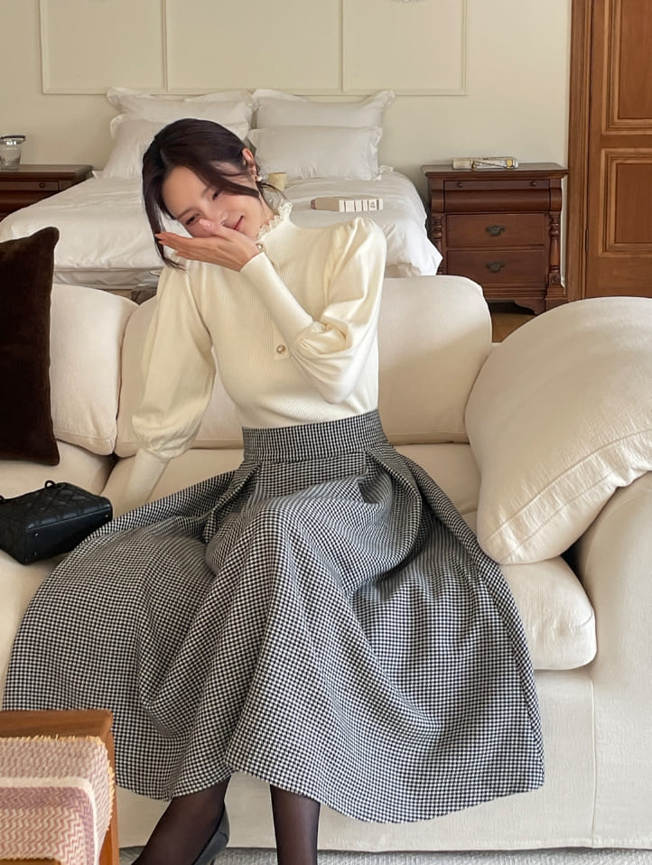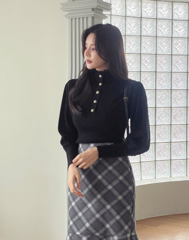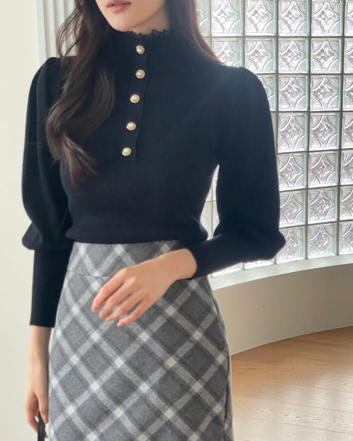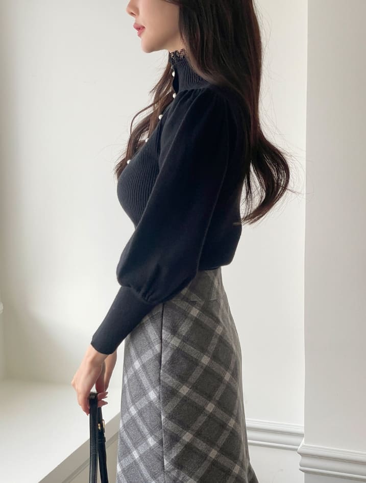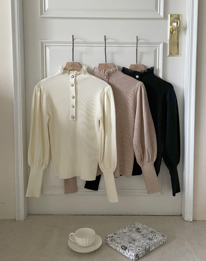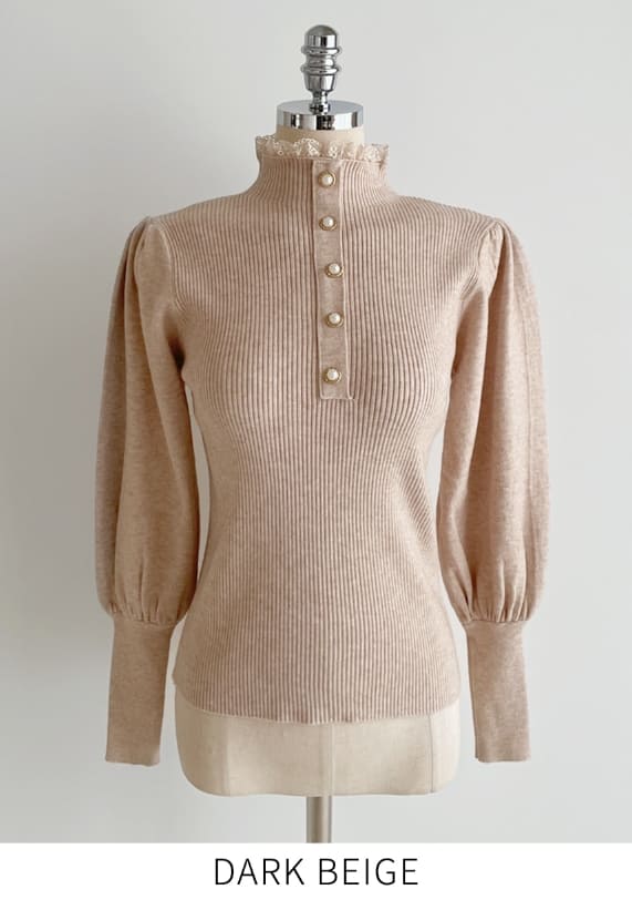 Levin Puff Pearl Button Frill Lace Turtleneck Knit