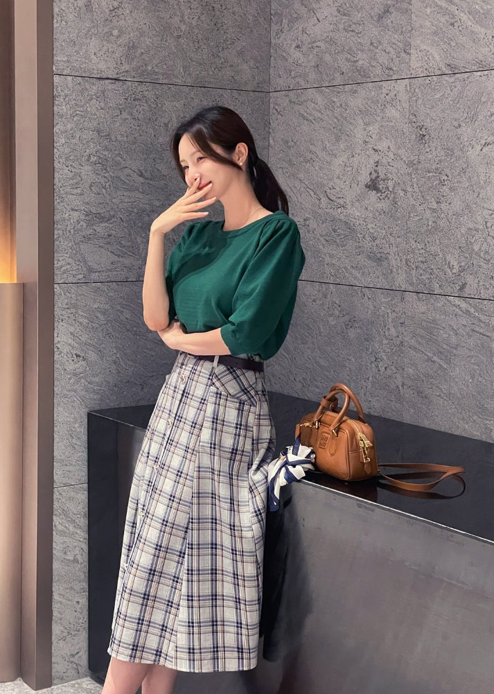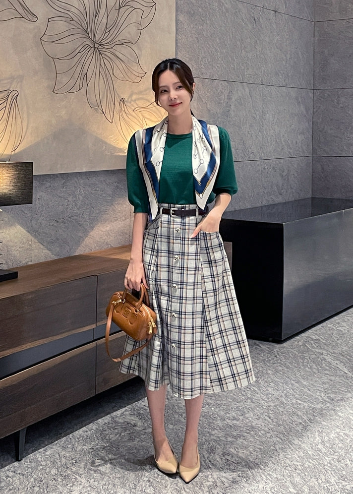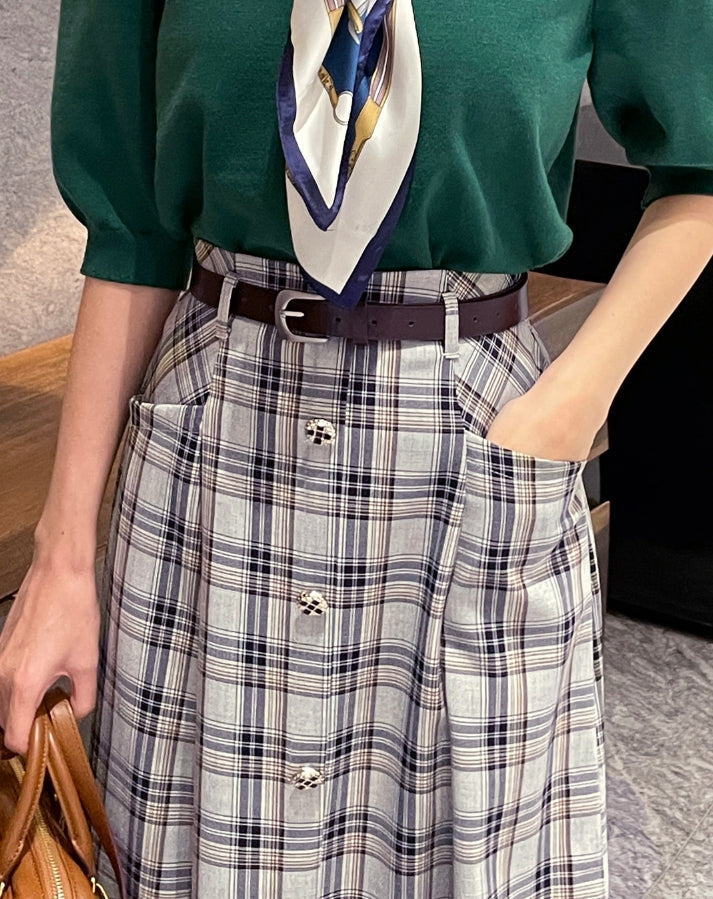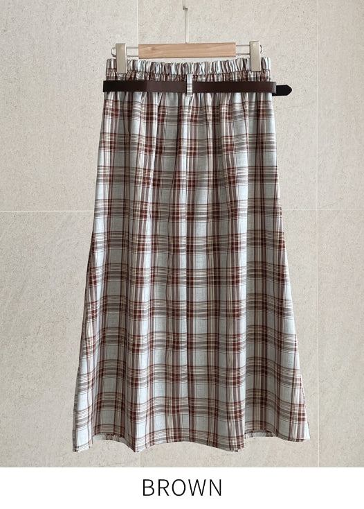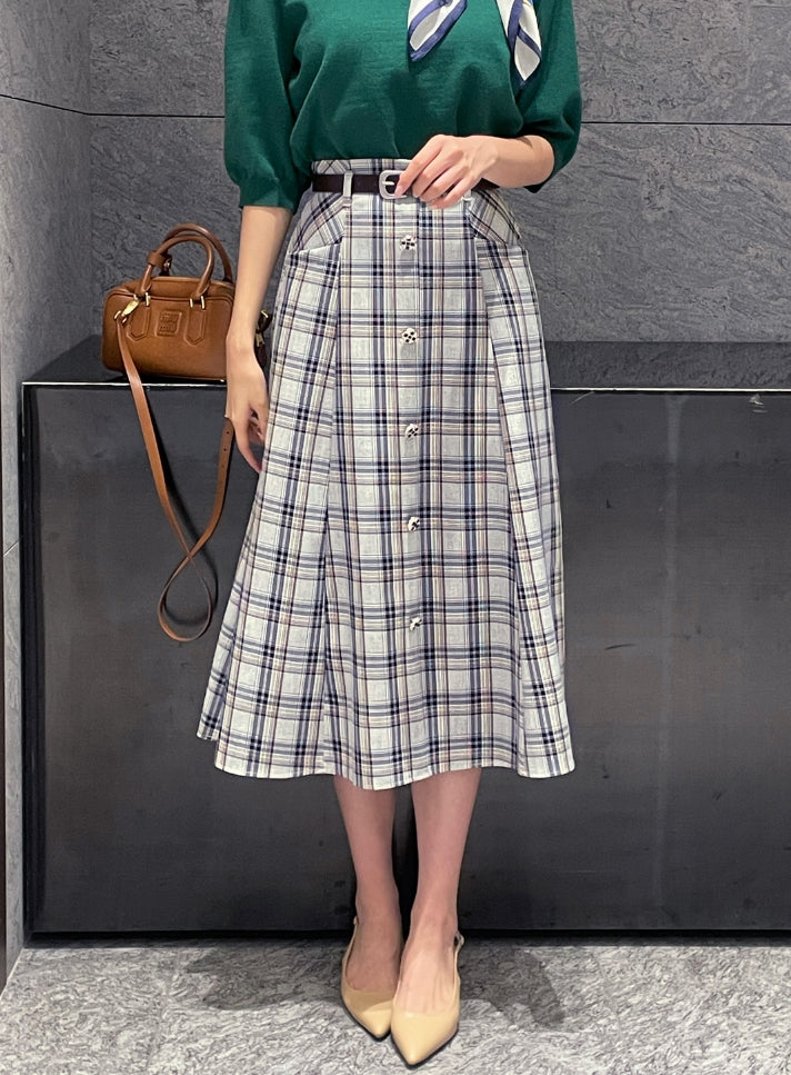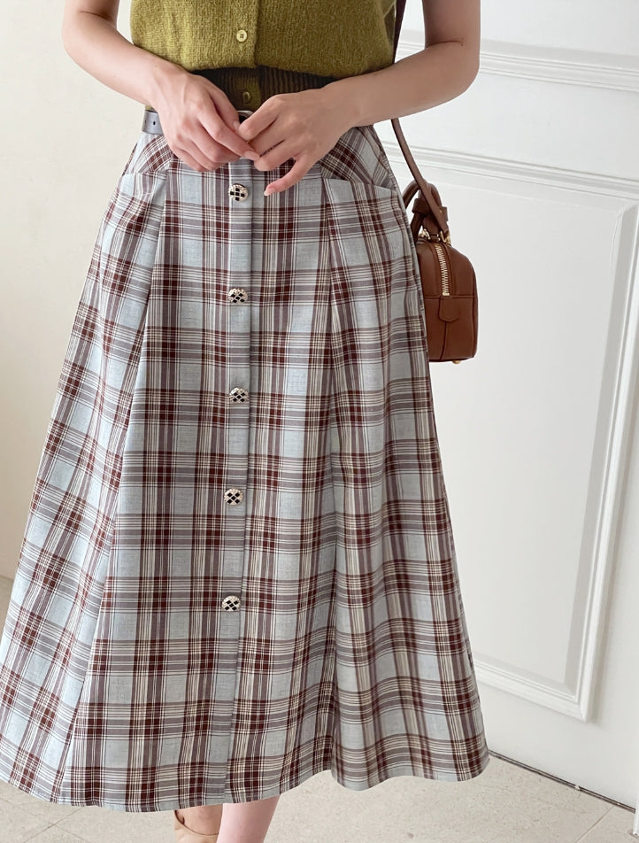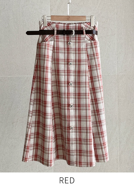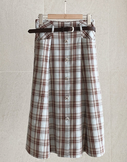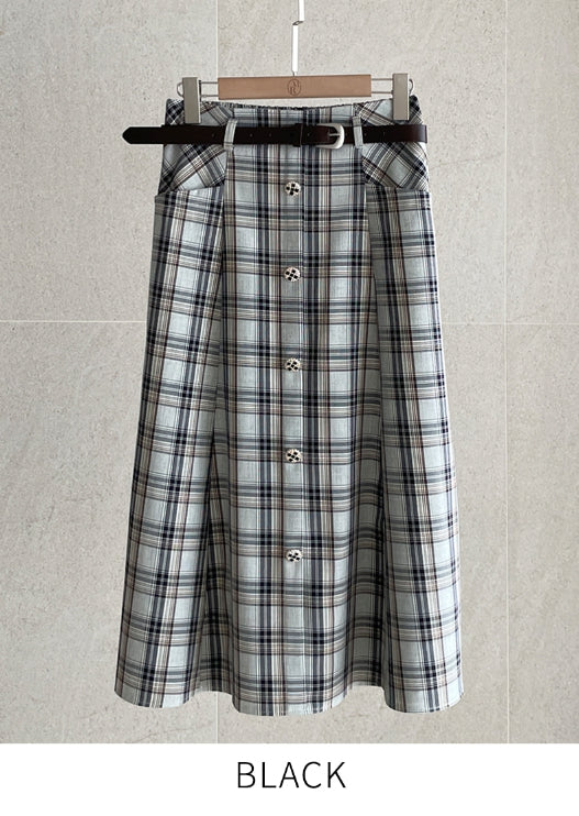 Macaroon Check Button A-Line Long Skirt (Belt Set)